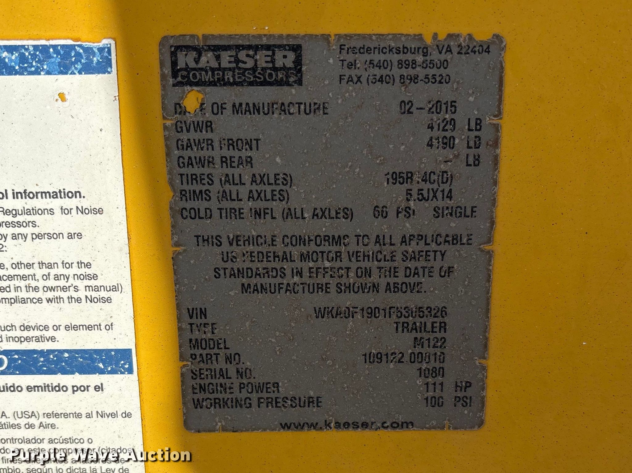 Purple Wave is selling a used Air Compressor in Texas. This item is a 2015 Kaeser M122 air compressor with the following: Hours: 4,257 on meter, VIN: WKA0F1901F5305326, Unit #: 2240
