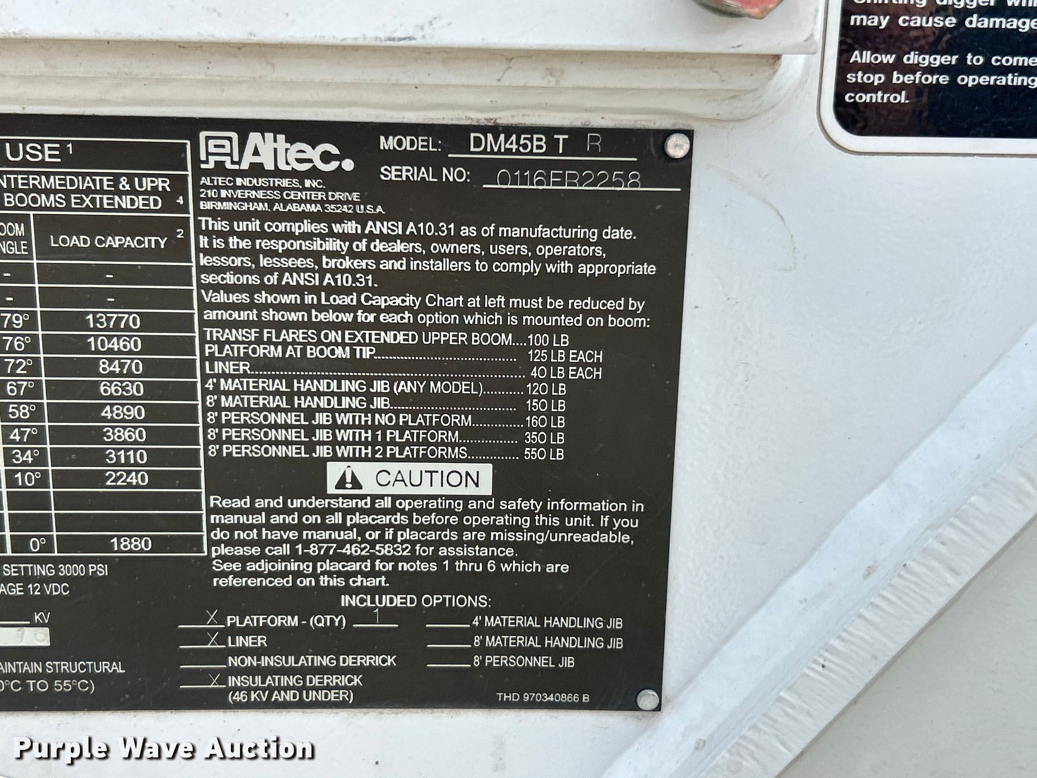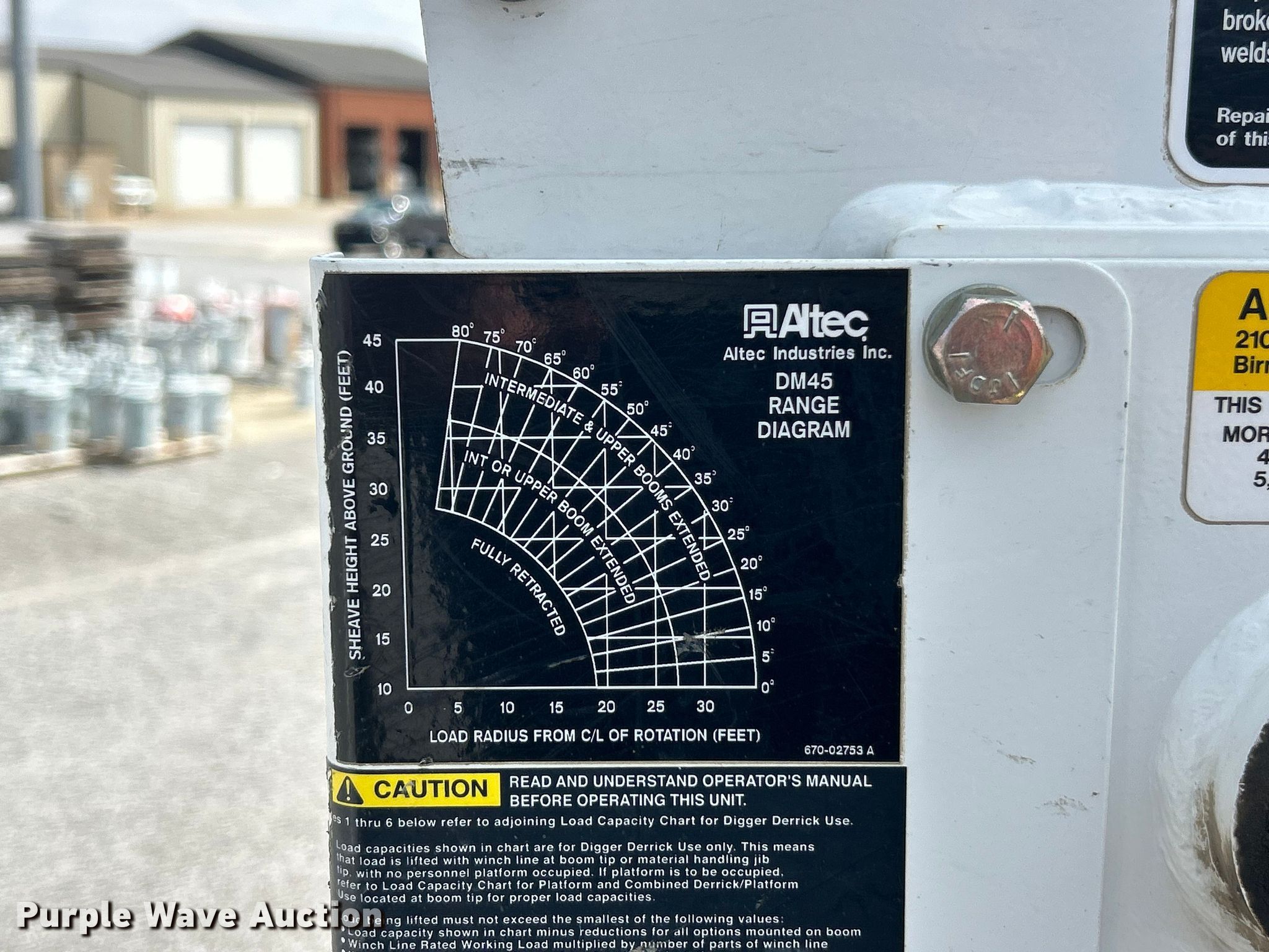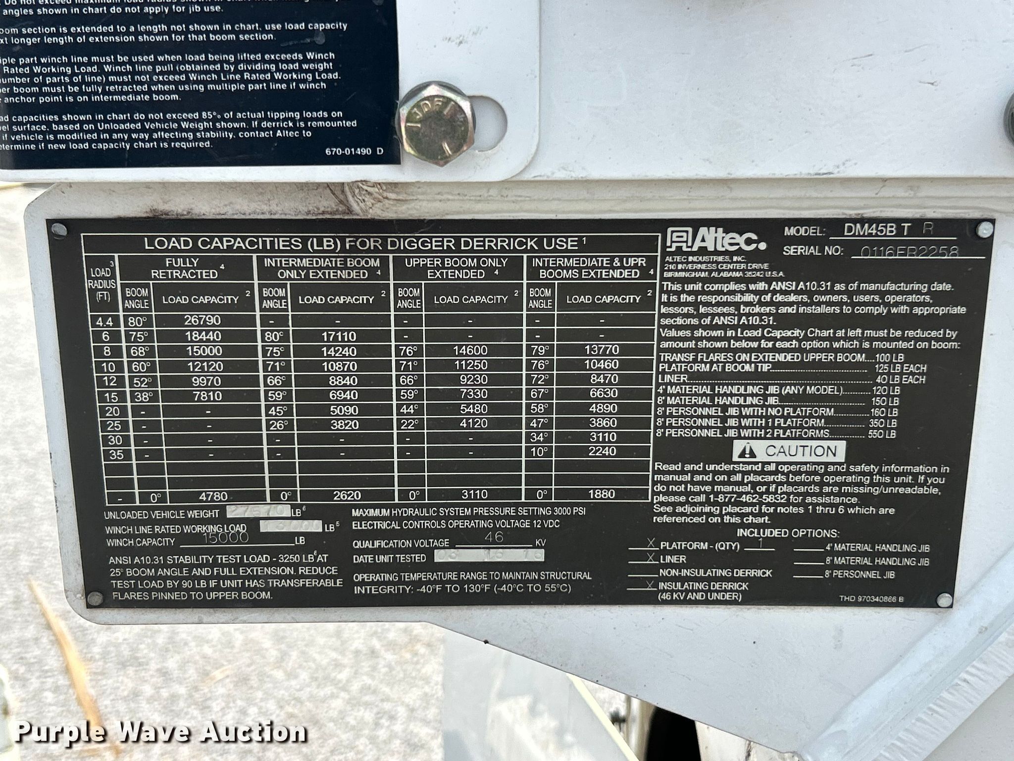 2016 Kenworth T370 digger derrick truck. Miles: 127,140 on odometer, Hours: 12,813 on meter, VIN: 2NKHHJ7X6GM103147. Engine Paccar PX-9, Displacement: 8.9L, Cylinders: 6, Fuel type: Diesel. Transmission Allison 3500 RDS, Automatic. Chassis Axles: Single, Differential lock: Inter-axle, Suspension: Spring, Brakes: Air, PTO, GVWR: 33,000 lbs. Interior AC, Heat, Heated mirrors, Power windows, Power locks, Cruise control. Features Bed Utility bed, Altec, Length: 13', Width: 94", Boom Altec DM45BTR, Serial: 0116FB2258, Maximum lift capacity: 26,790 lbs, Maximum lift height: 45', Boom type: Insulated, Telescopic, Boom controls Platform, Pole guide, Auger Diameter: 18".. Tires Front: 315/80R22.5, Rear: 11R22.5. Notes Non-operational boom, damaged, Dash warning indicator: Check engine, Transmission, AC issues, needs re-charged. Illinois title. Title distribution may be delayed up to 14 days from verification of funds. Wayne-White Counties Electric Cooperative. Fairfield, IL 62837