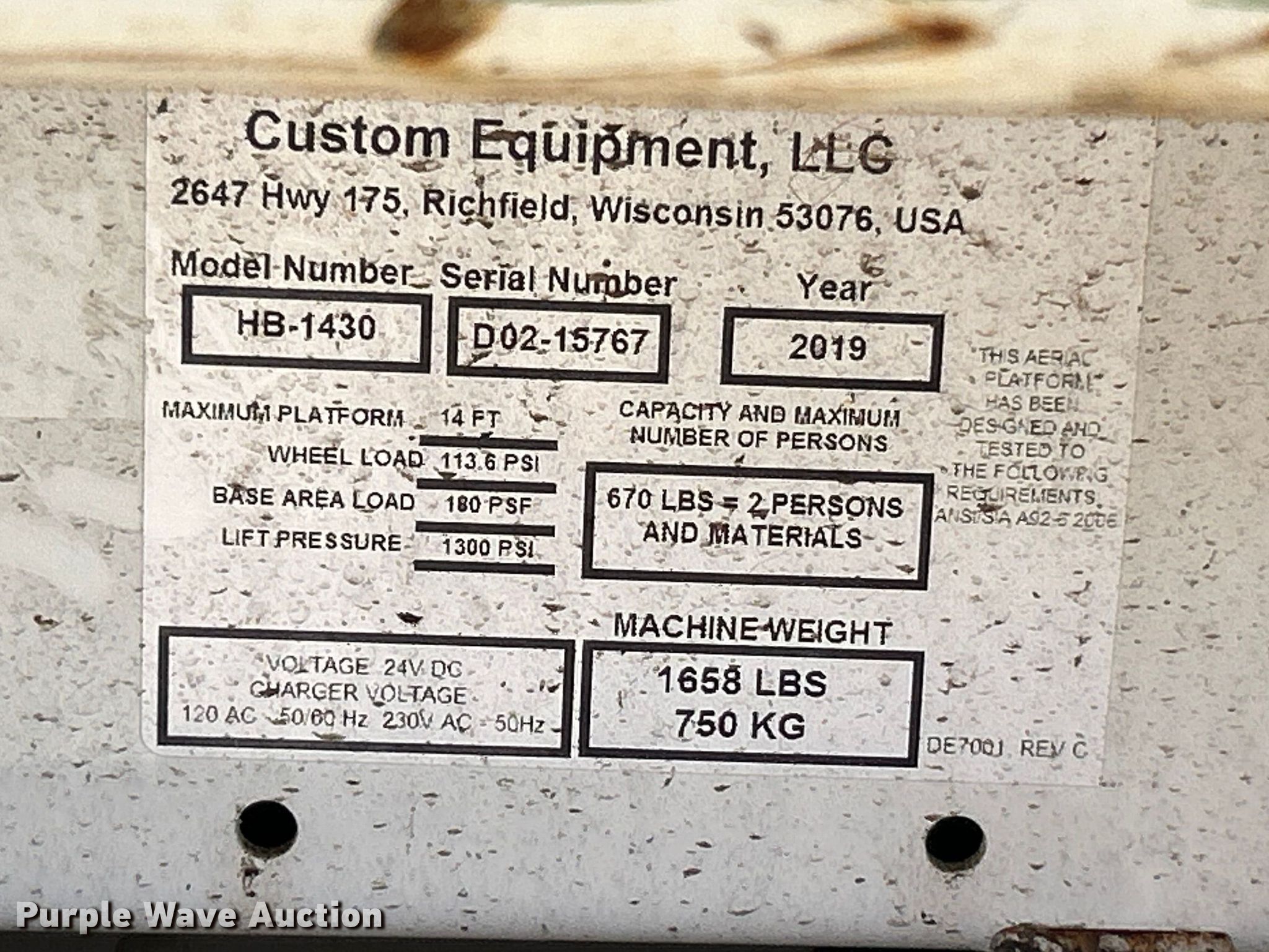 Hy-Brid HB-1430 scissor lift. Hours: Unknown, Serial: D02-15767. Electric Motor Volts: 24. Features Maximum lift capacity: 670 lbs, Maximum lift height: 14', Platform: 60" L x 24" W, AC power outlet, Controls: Ground. Tires Solid, Non-marking. Notes Non-operational unit. Rental Supply District 1, LLC. O'Fallon, MO 63366