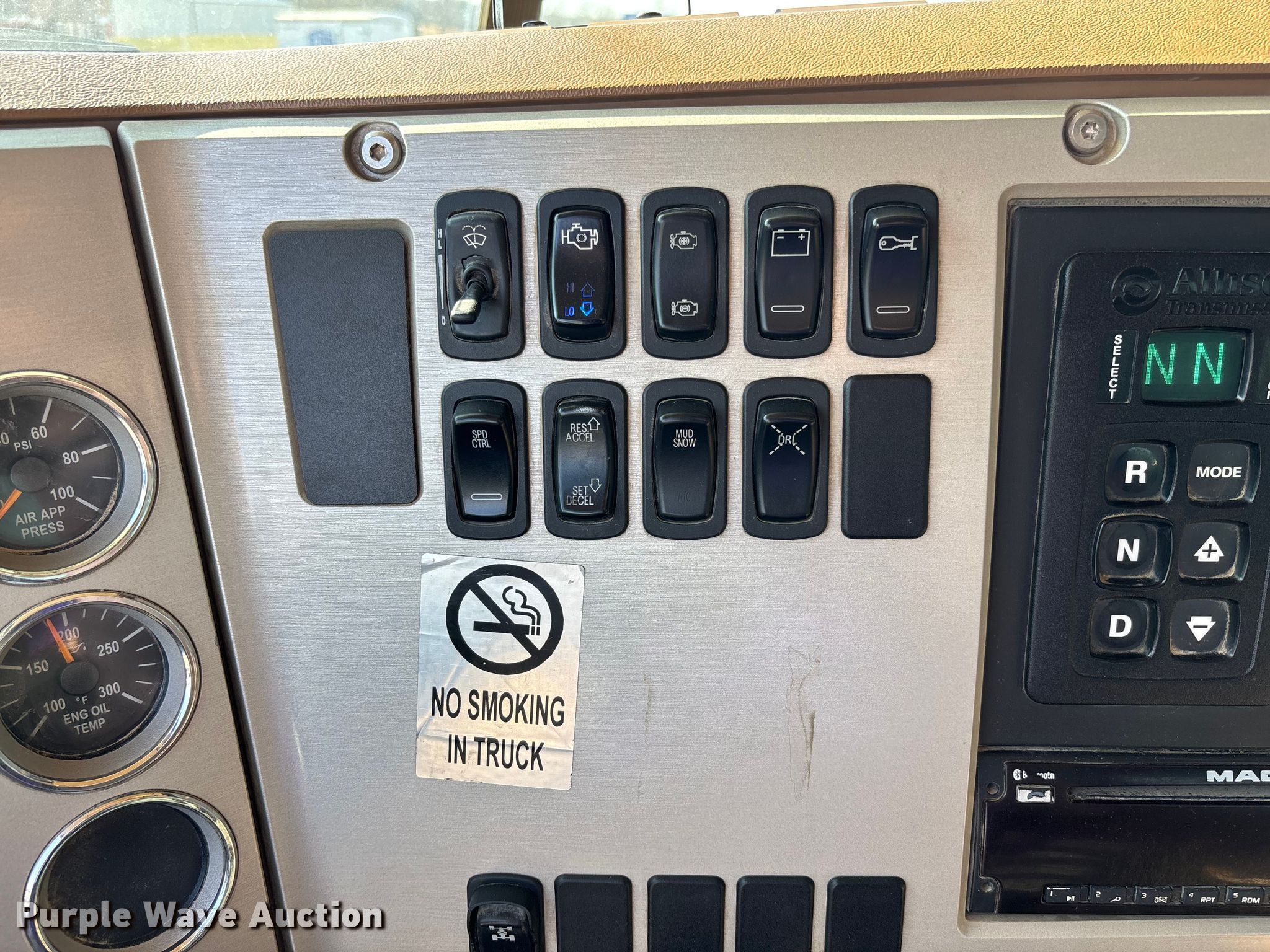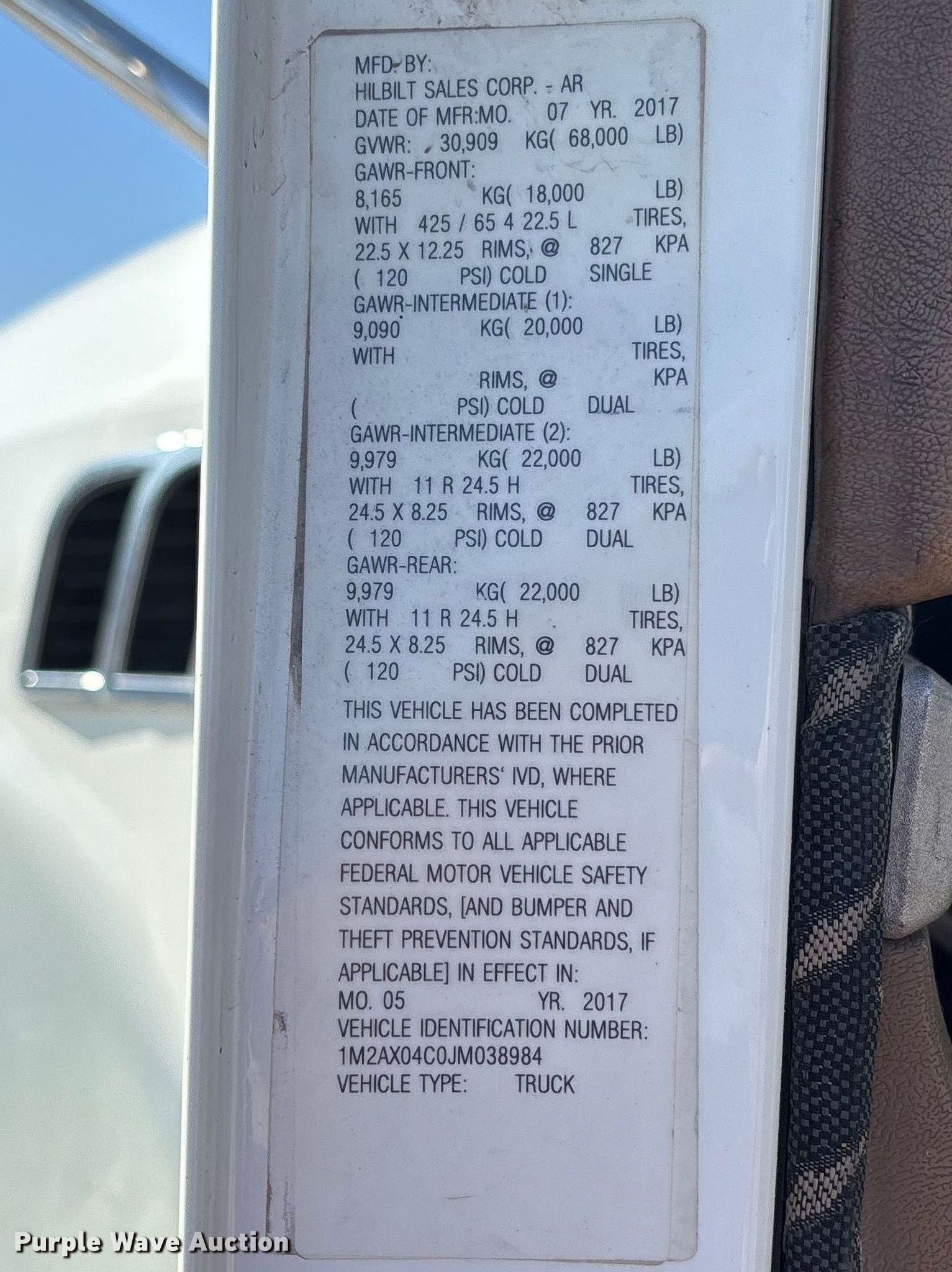 2018 Mack GU713 dump truck. Miles: 235,270 on odometer, Hours: 9,136 on meter, VIN: 1M2AX04COJM038984. Engine Mack MP7, Serial: 593048, Displacement: 10.8L, Cylinders: 6, Fuel type: Diesel, HP: 425, Engine brake. Transmission Allison, Automatic. Chassis Axles: Triple, Pusher axle Steerable, Differential lock: Inter-axle, Suspension: Camelback, Brakes: Air, PTO, GVWR: 62,000 lbs FAWR: 18,000 lbs, RAWR: 44,000 lbs, Wheelbase: 228". Interior AC, Heat, Cruise control. Features Bed Dump bed, Hilark 16'18, Serial: 63140-10323-0717, Length: 16', Width: 8' 1", Side height: 51", Bed type: Steel, Roll tarp, Ram: Single, End gate: Air operated. Tires Front: 425/65R22.5, Rear: 11R24.5, Lift axle: 295/75R22.5. Notes Dash warning indicator: Check engine. Missouri title. Title distribution may be delayed up to 30 days from verification of funds. Emery Sapp & Sons, Inc... Columbia, MO 65202