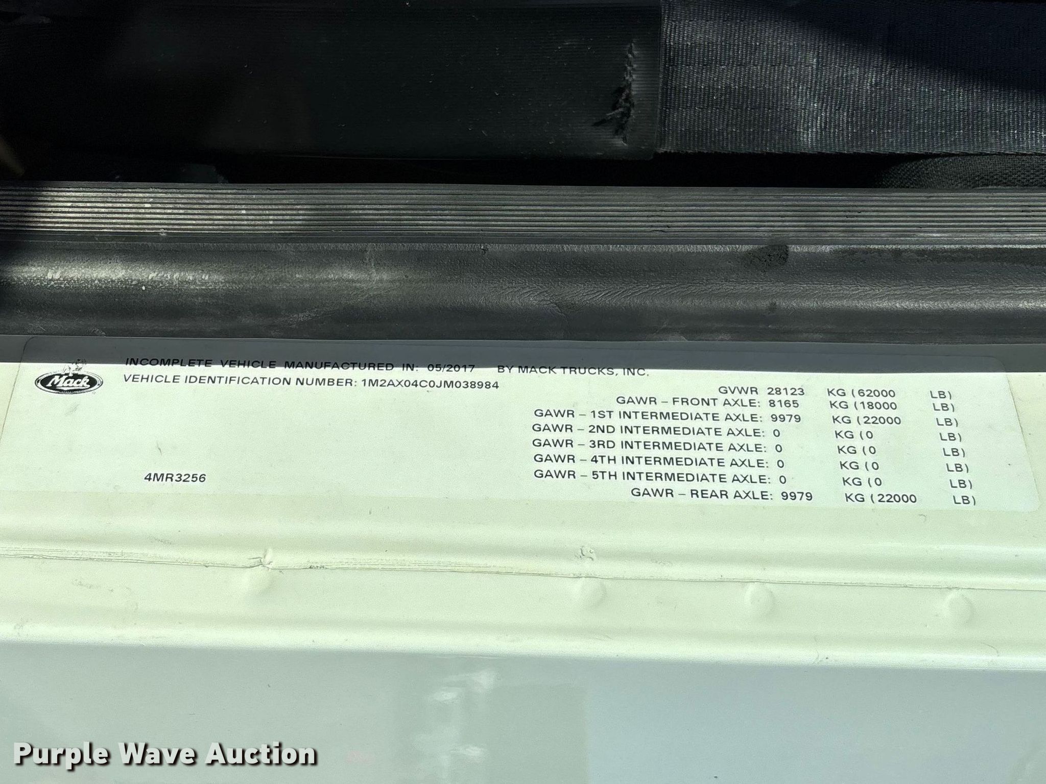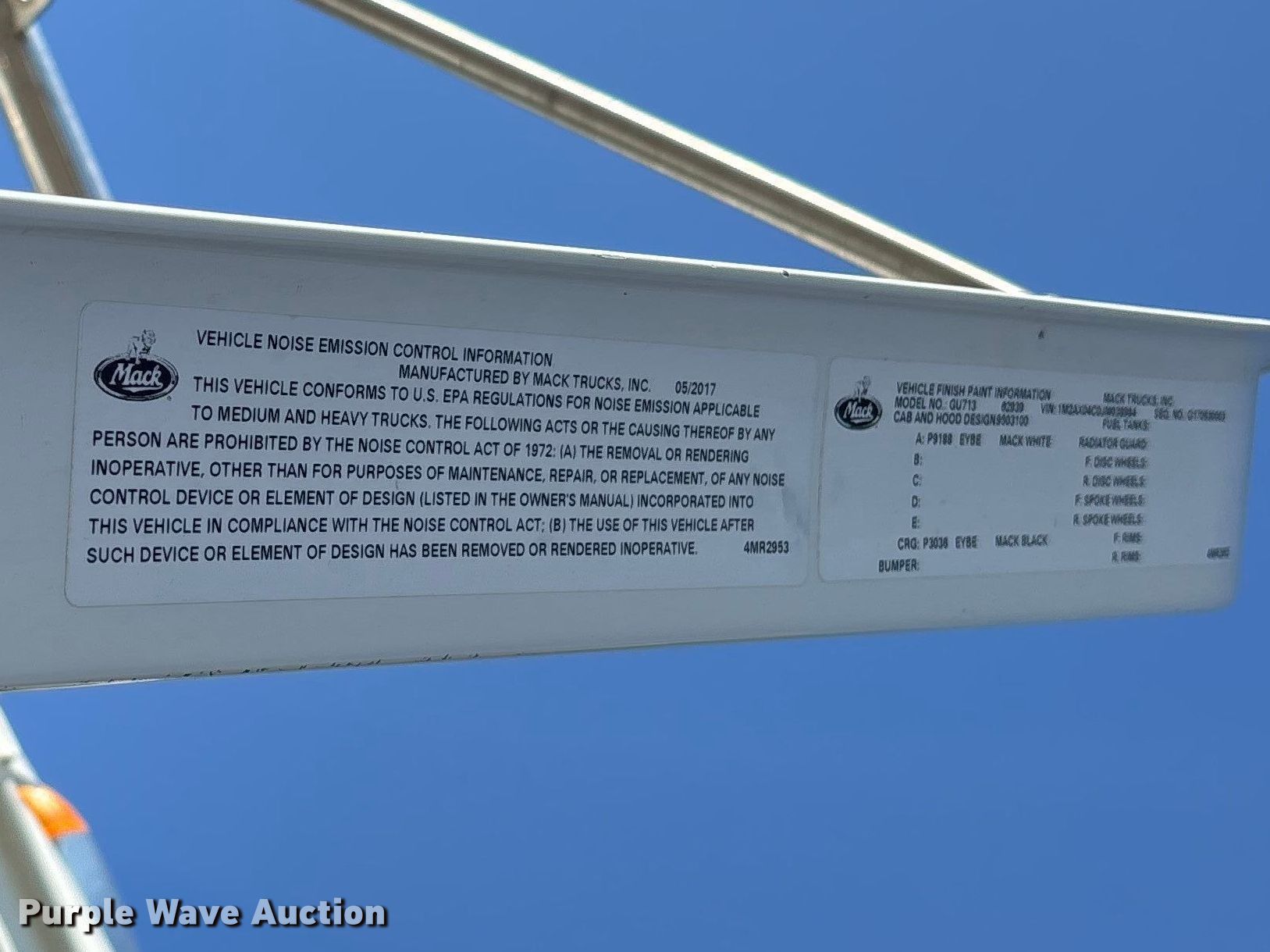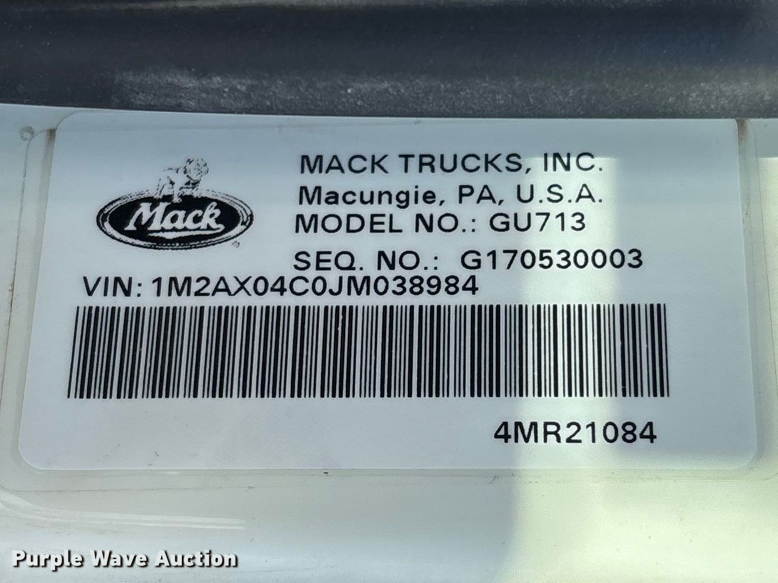 Take a look at this used 2018 Mack GU713 dump truck being sold on May 7th, 2026 in the Thursday May 07 Construction Equipment Auction made by Mack. Take a look at all of the item information below or take a look at similar auctions for Construction Trucks.