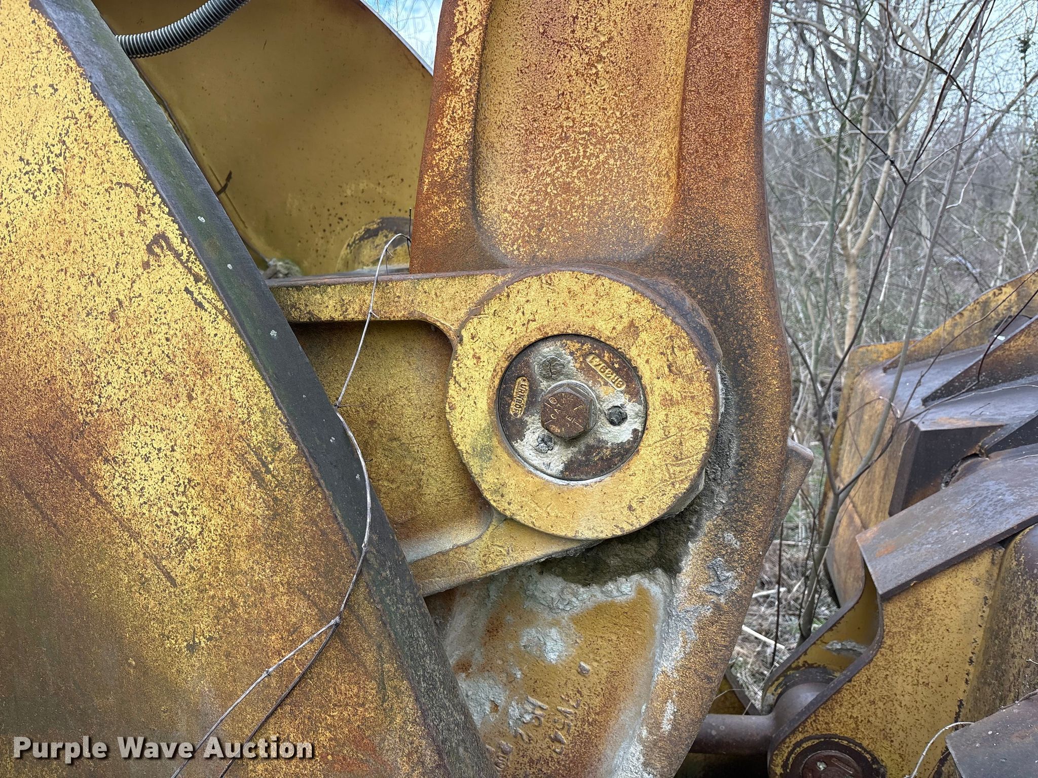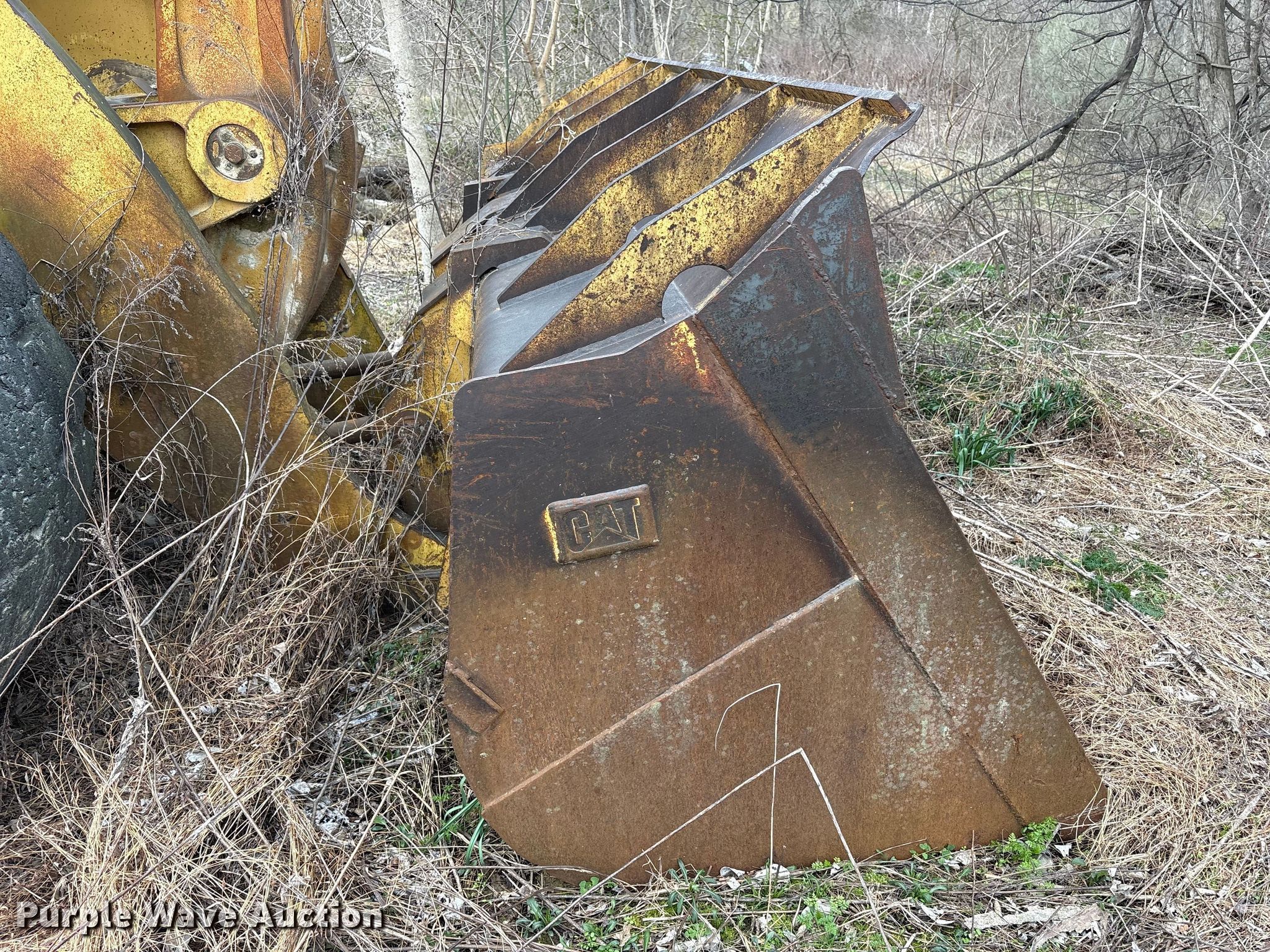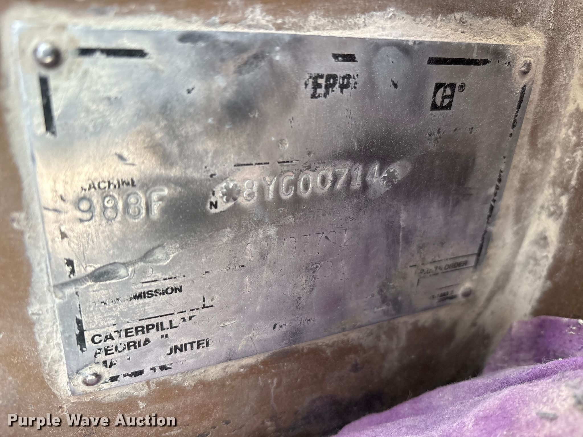 1994 Caterpillar 988F wheel loader. Hours: Unknown, Serial: 8YG00714. Engine Caterpillar 3408, Cylinders: 8, Fuel type: Diesel. Transmission Powershift, 4F - 3R. Operators station Enclosed cab, AC, Heat, Steering: Joystick, Bucket controls: Two-lever. Features Bucket Width: 144", Cutting edge: Bolt-on. Tires Size: 35/65-33. Notes Tire and wheel missing, Non-operational unit. Battletown Materials, LLC. Battletown, KY 40104