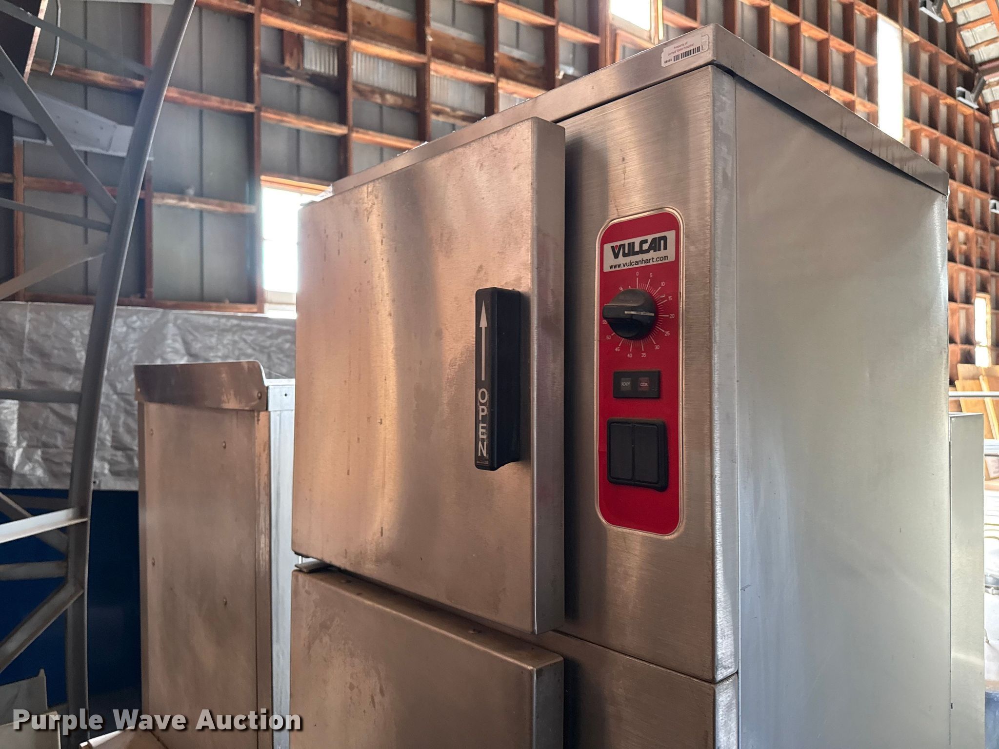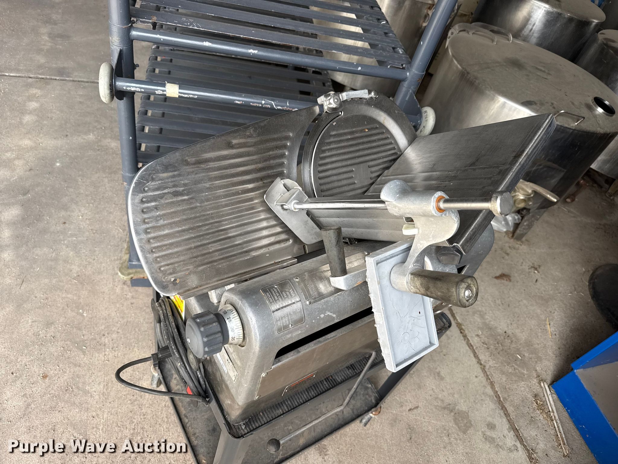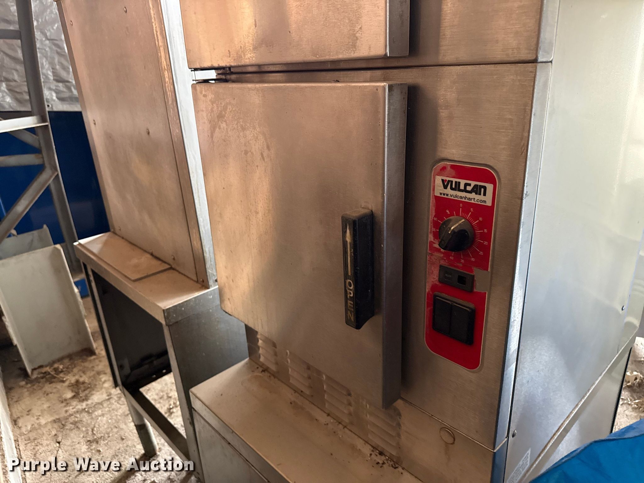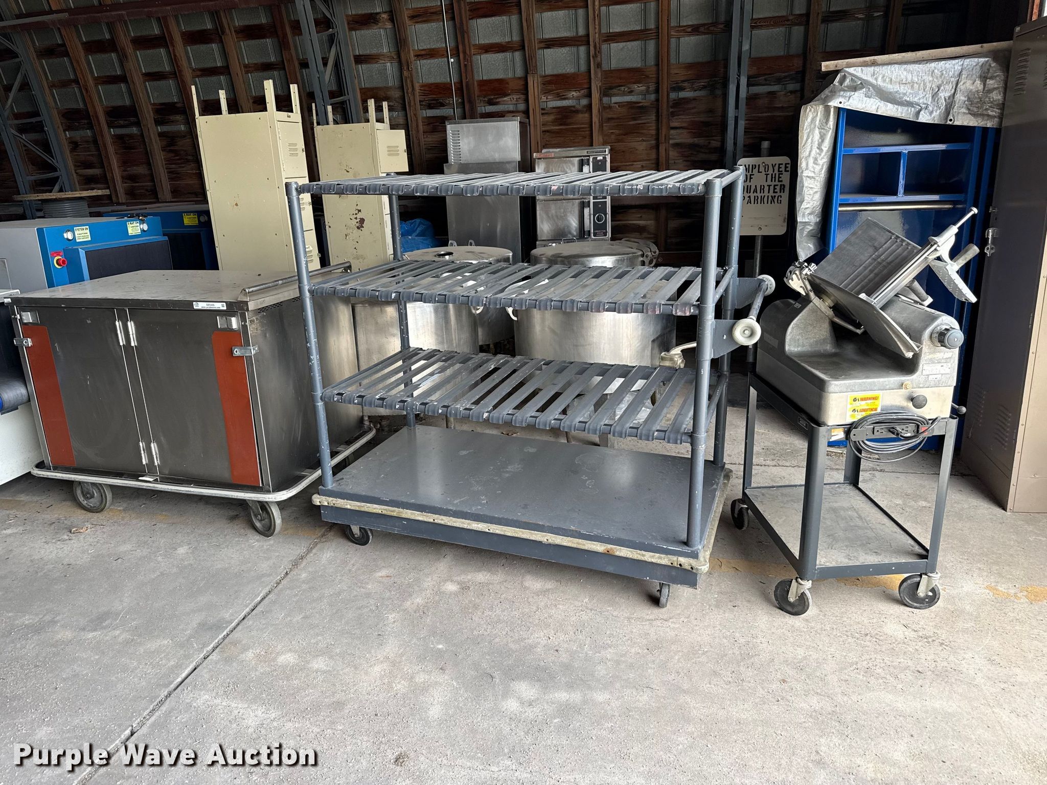 Purple Wave is selling a used Restaurant Equip. in Kansas. This item is a Kitchen equipment with the following: Hobart slicer, Volts: 115, Amps: 6.2, Storage rack, Carter-Hoffman food cart, (4) Vulcan natural gas kettles, Market Forge convection steam cooker, Vulcan steam cooker
