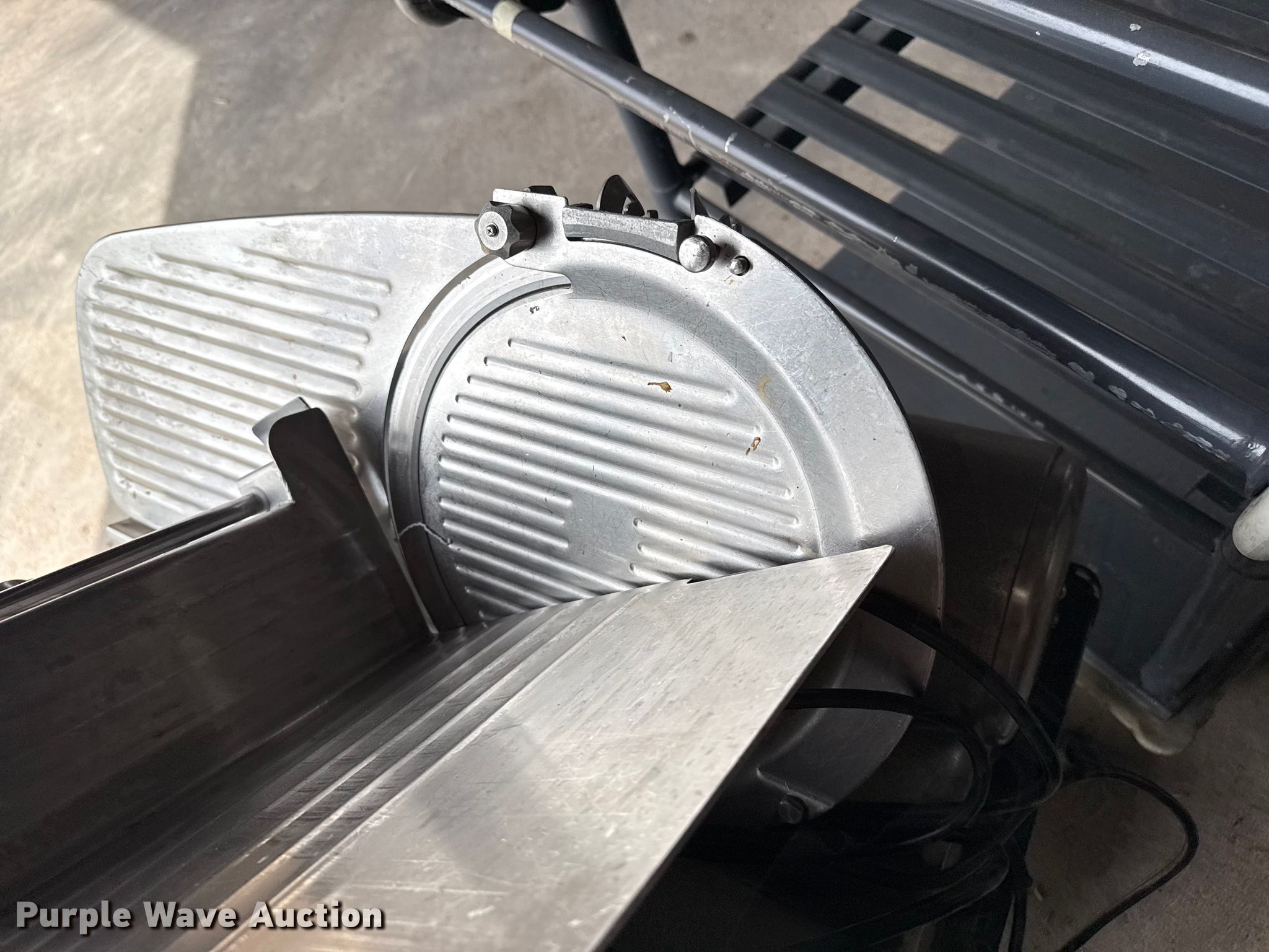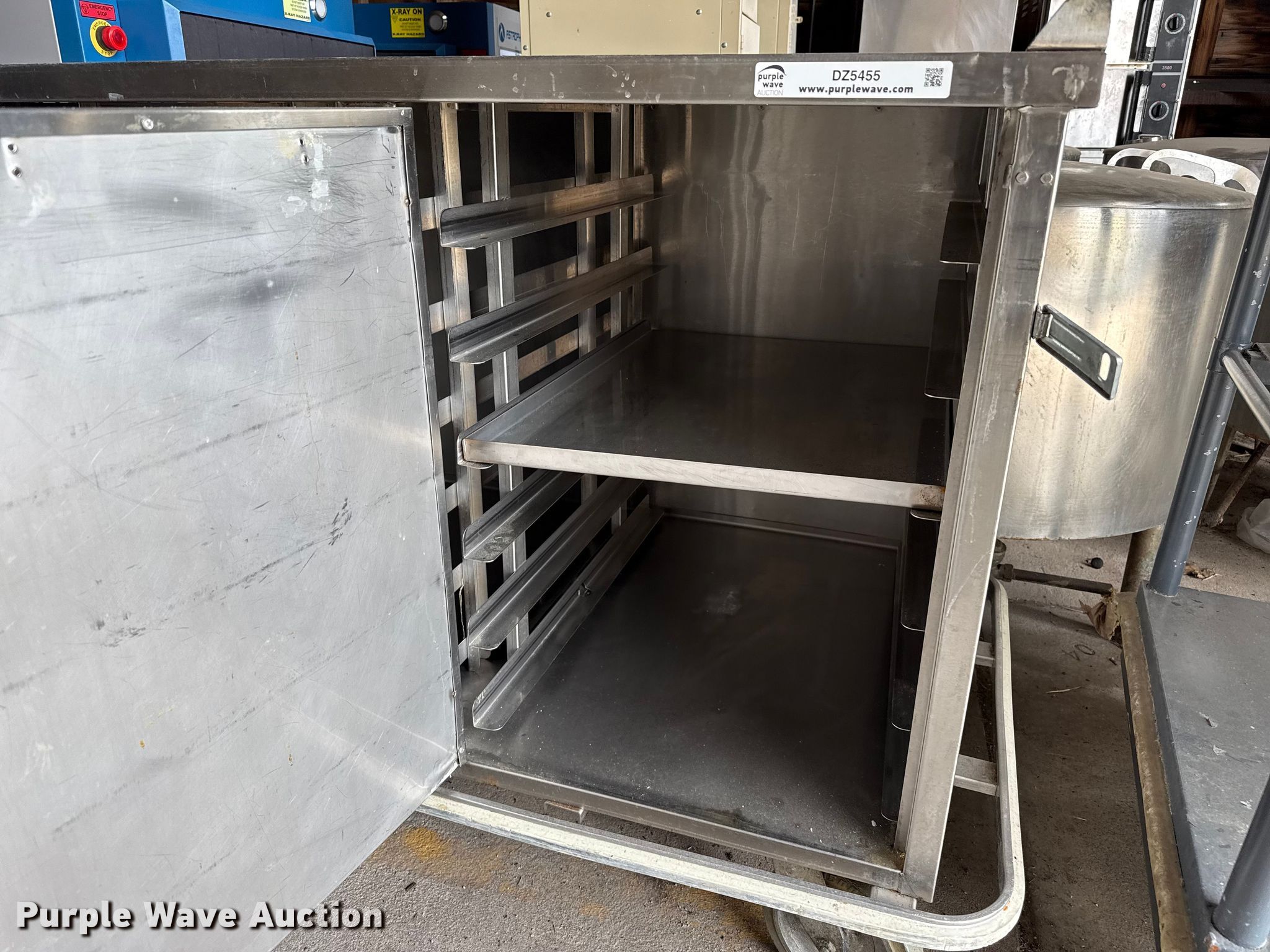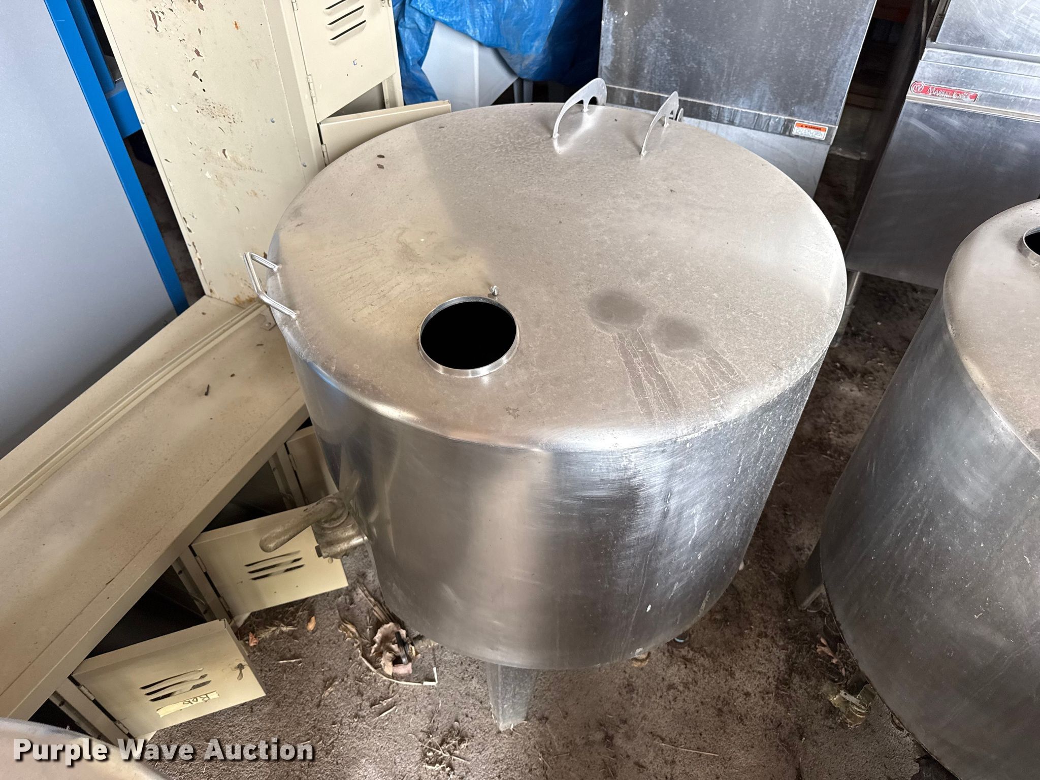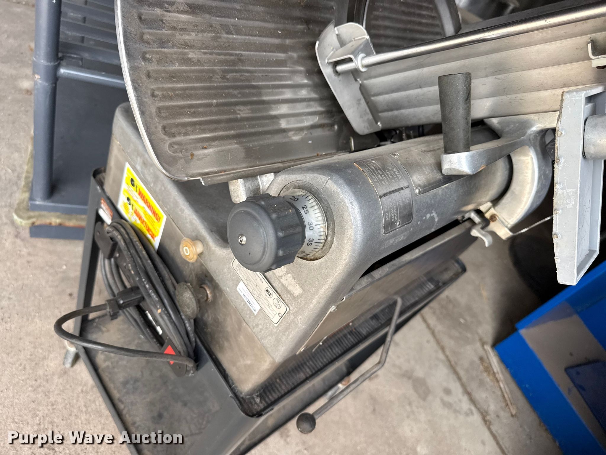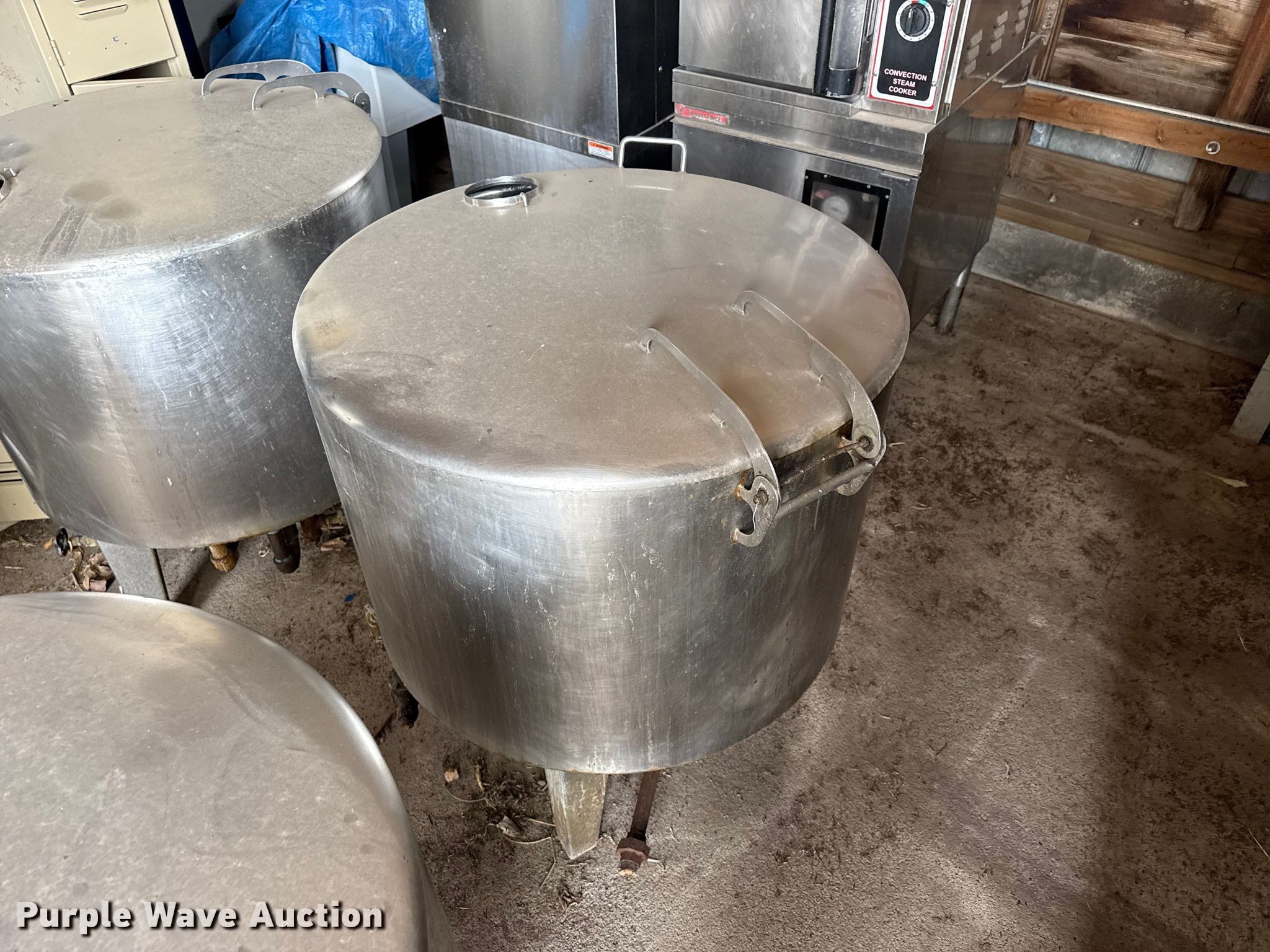 Purple Wave is selling a used Restaurant Equip. in Kansas. This item is a Kitchen equipment with the following: Hobart slicer, Volts: 115, Amps: 6.2, Storage rack, Carter-Hoffman food cart, (4) Vulcan natural gas kettles, Market Forge convection steam cooker, Vulcan steam cooker