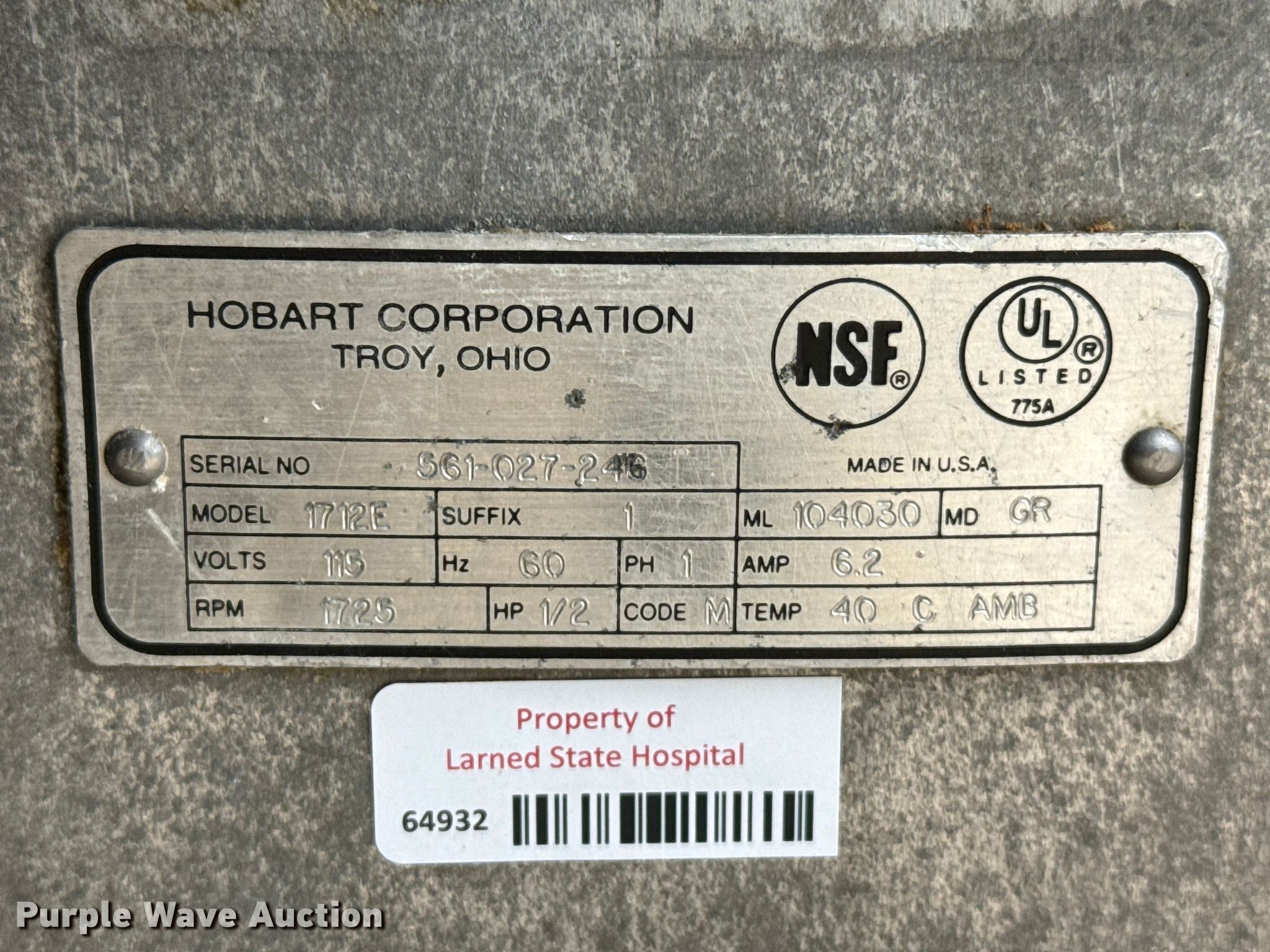 Kitchen equipment. Hobart slicer Volts: 115, Amps: 6.2, Storage rack, Carter-Hoffman food cart, (4) Vulcan natural gas kettles, Market Forge convection steam cooker, Vulcan steam cooker. Larned State Hospital. Larned, KS 67550