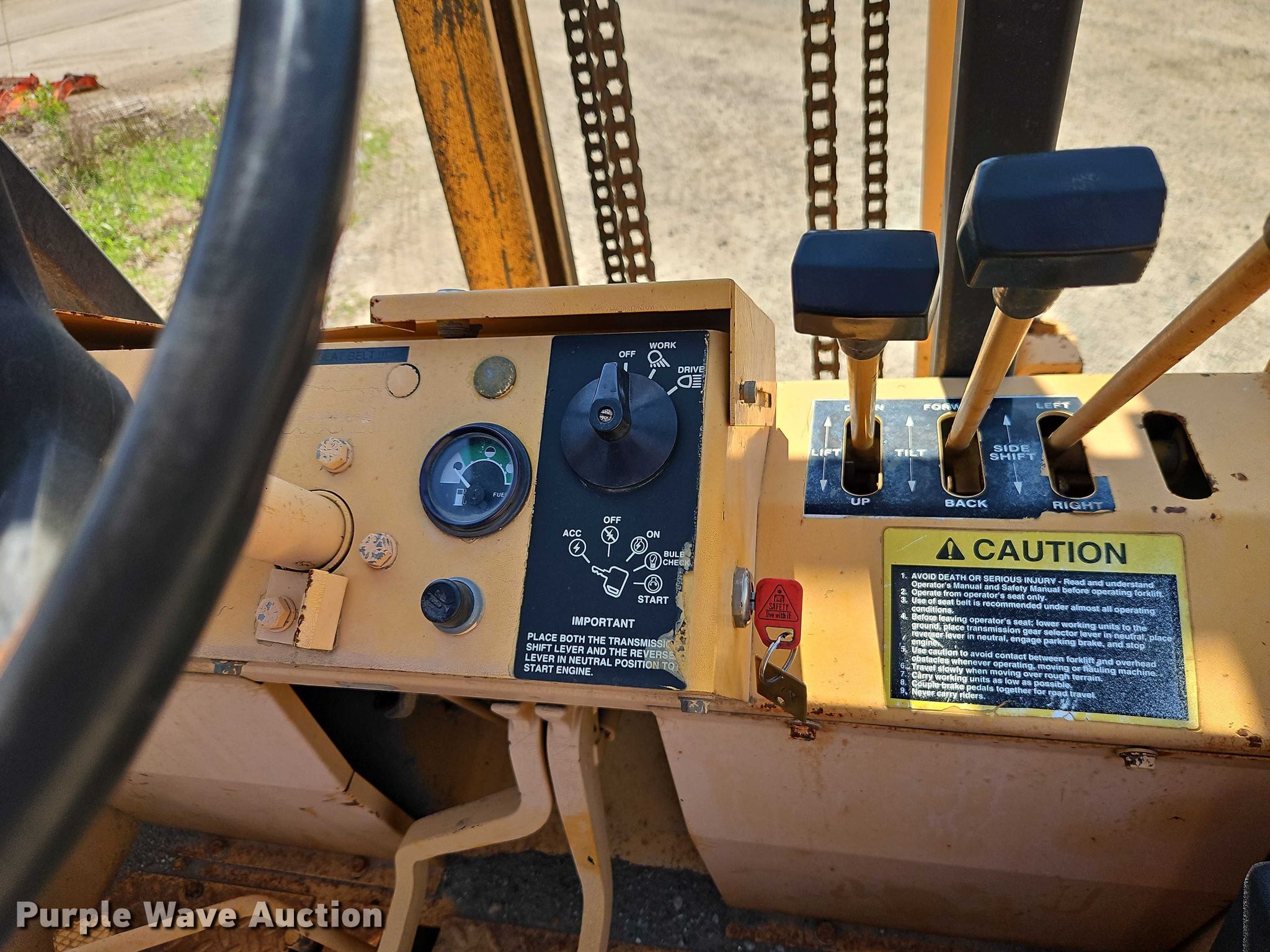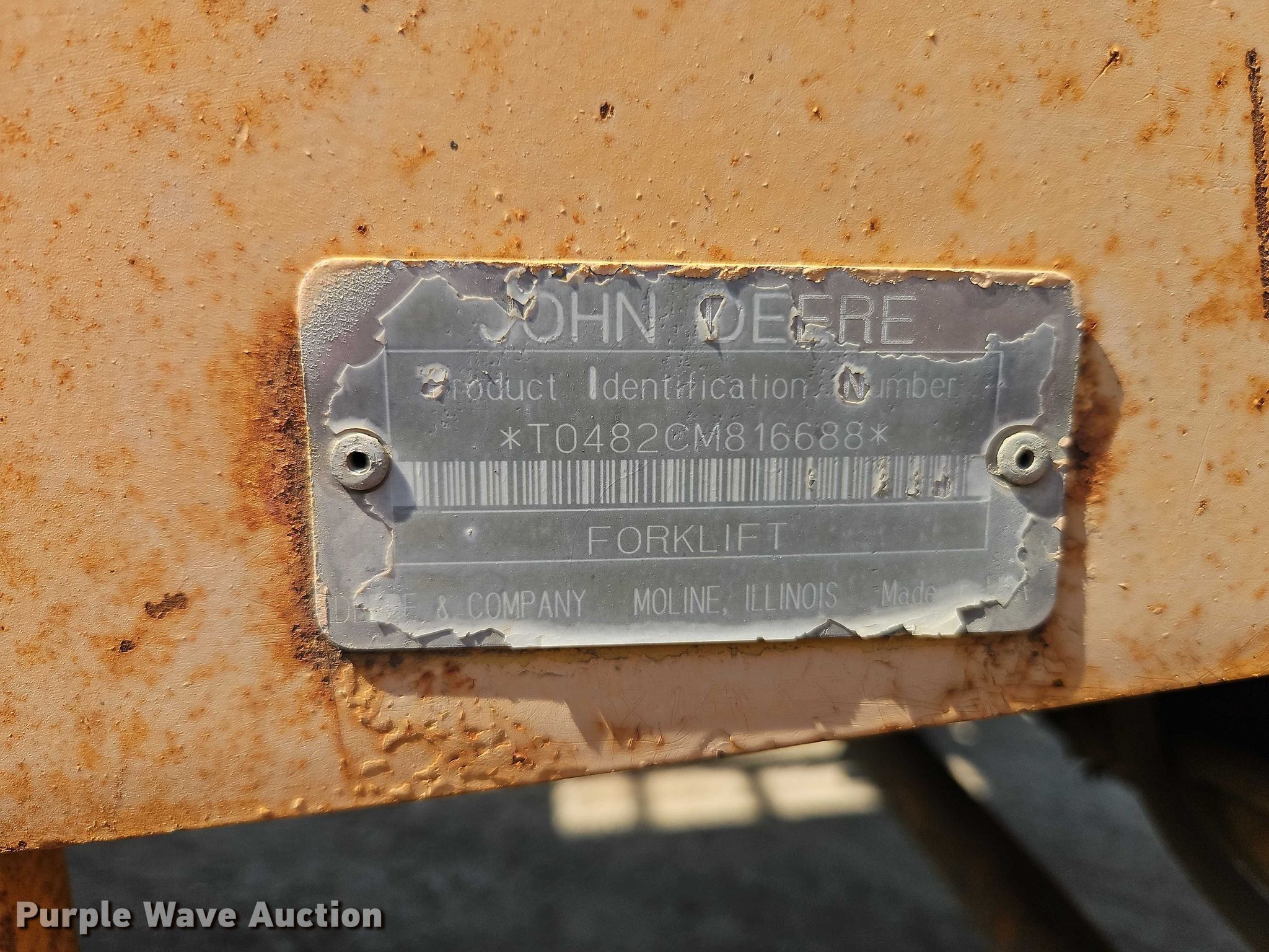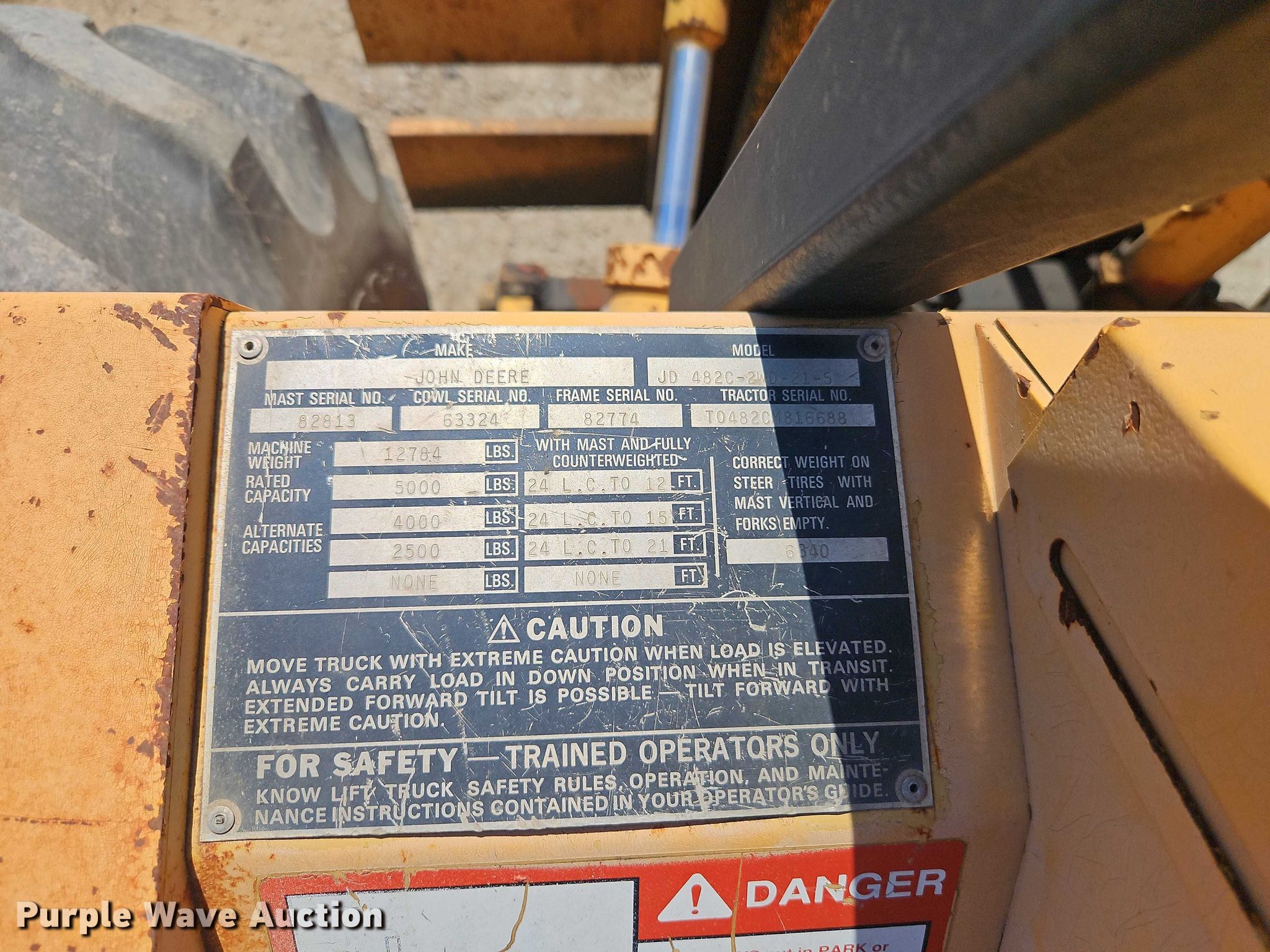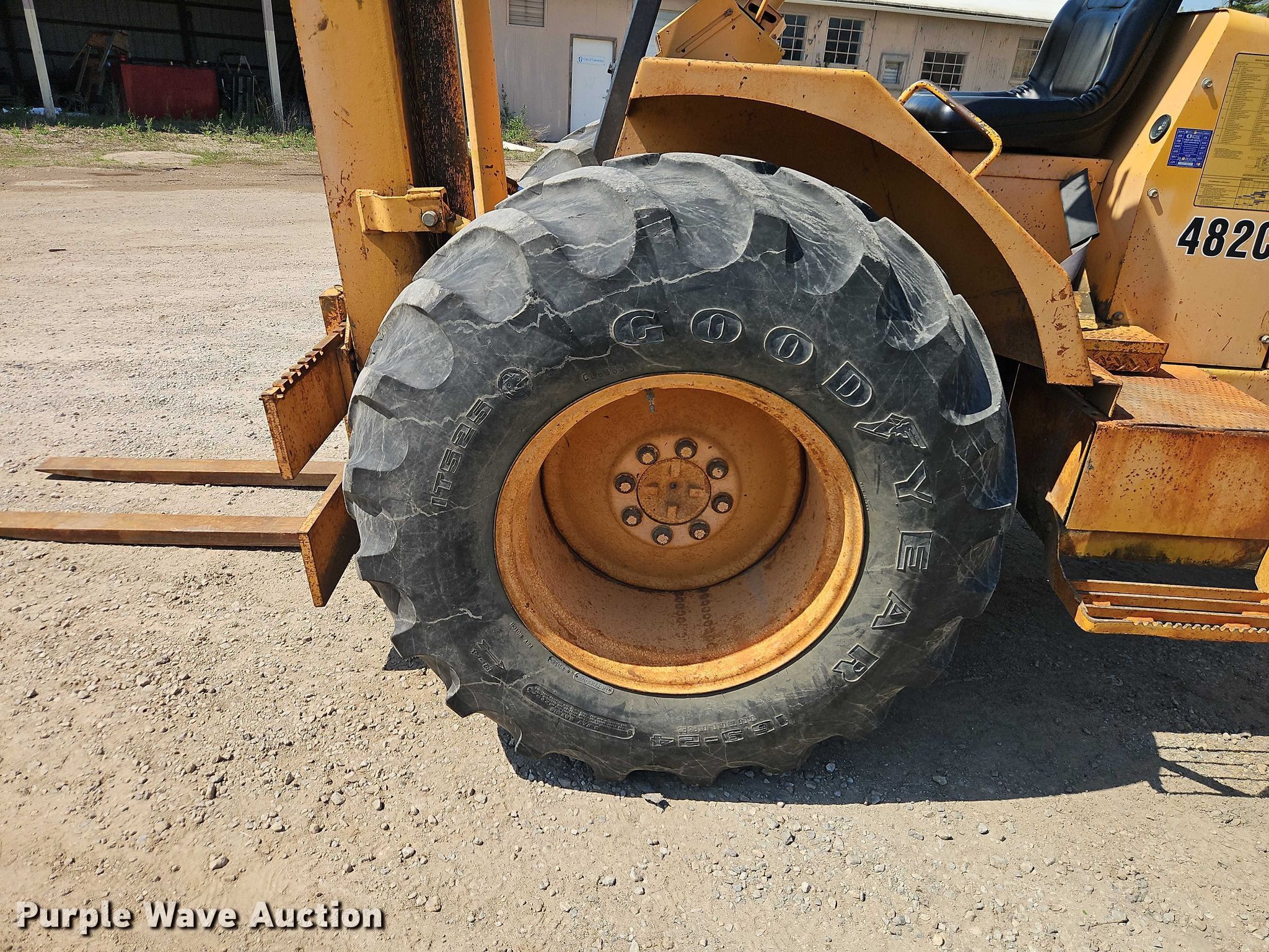 Purple Wave is selling a used Strt. Mast Rough Terr. Forklift in Kansas. This item is a John Deere 482C forklift with the following: Hours: 2,253 on meter, Serial: Y0482CM816688, Unit #: 777