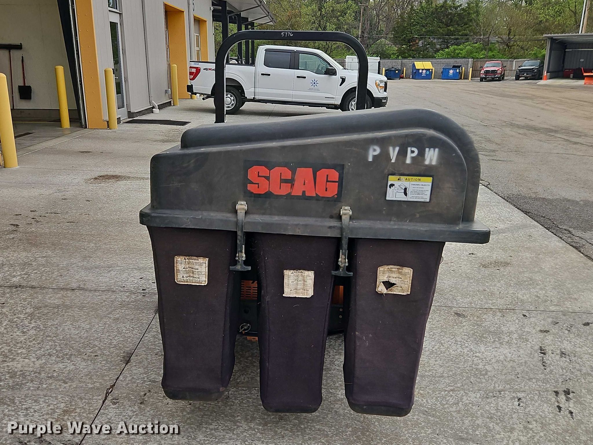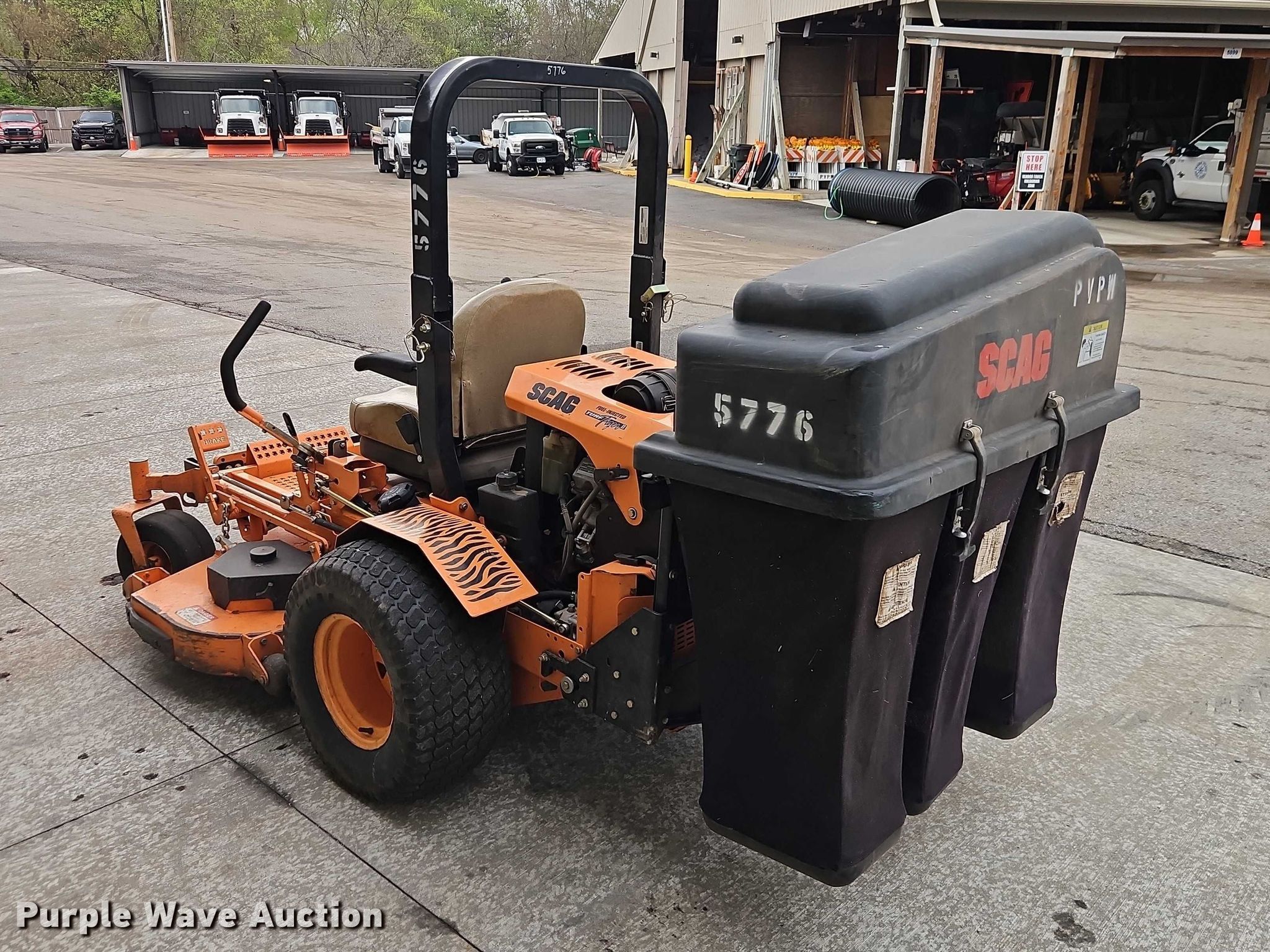 Scagg Turf Tiger II ZTR lawn mower. Hours: 894 on meter, Cutting width: 61", Serial: N0900133. Engine Kawasaki, Displacement: 824 cm³, Cylinders: 2, Fuel type: Gas. Transmission Hydrostatic. Operators station OROPS. Features Grass bagger, Width: 48", Scagg GC-3B, Mower deck Width: 61", Scagg SMT-61V, Serial: M1205650. Tires Front: 13x6.50-6, Rear: 26x12.00-12. City of Prairie Village KS. Prairie Village, KS 66208