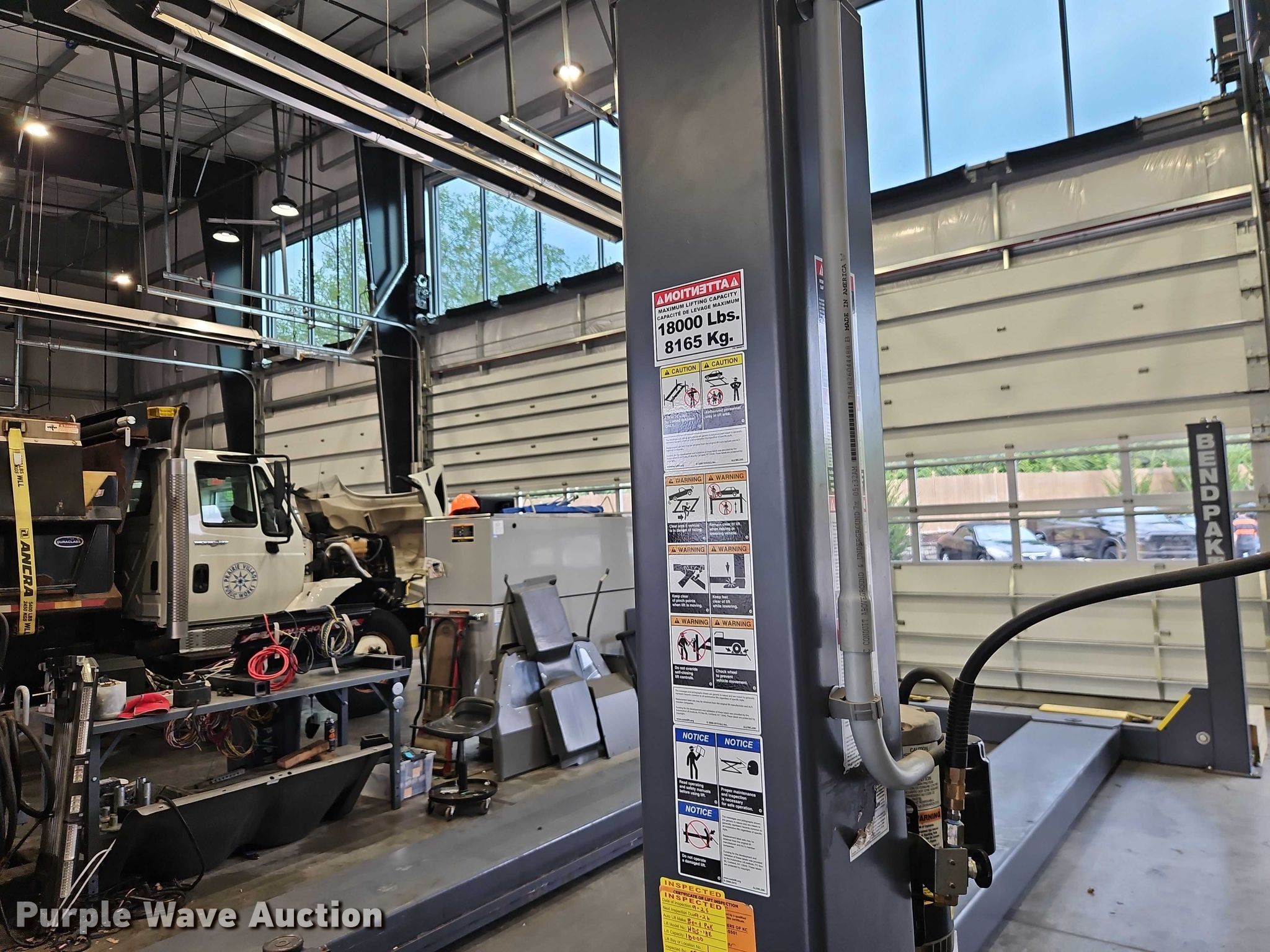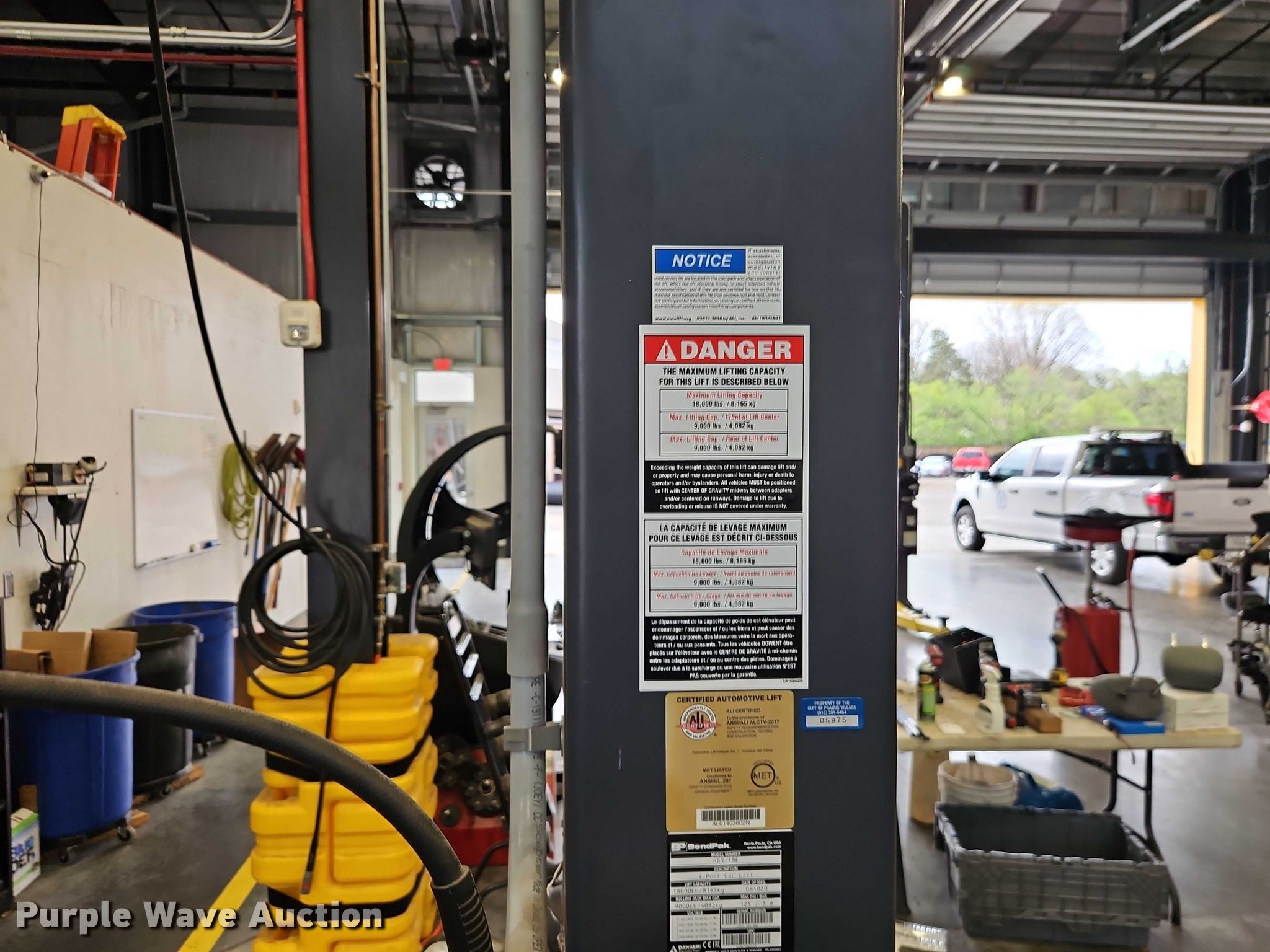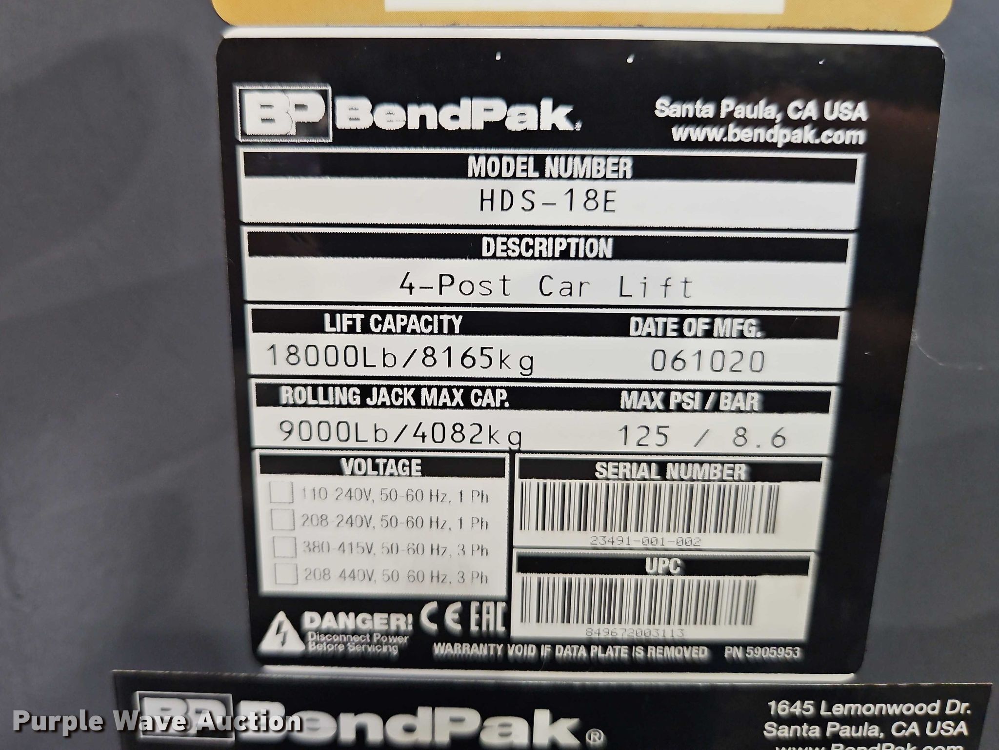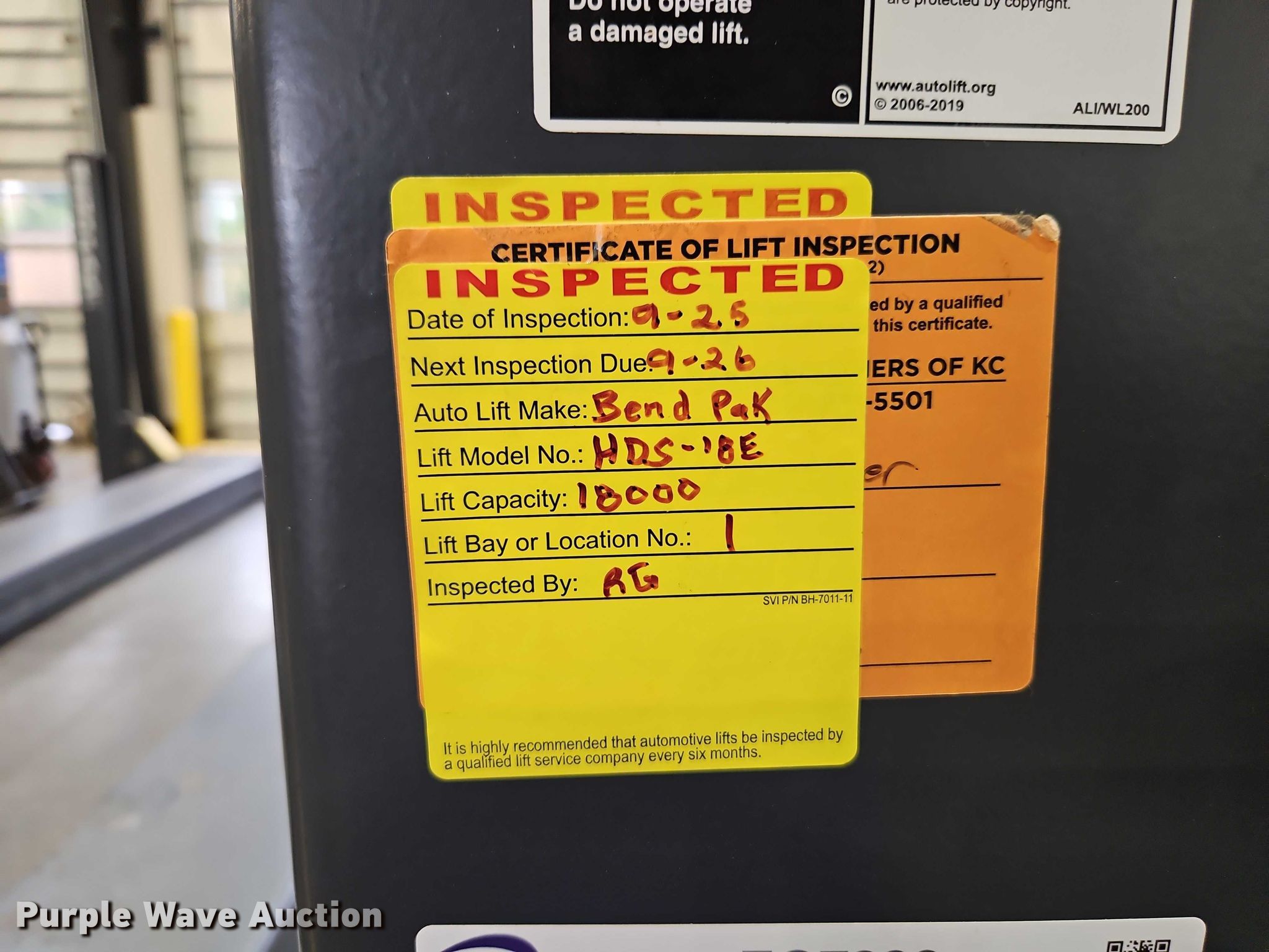 Purple Wave is selling a used Tools in Kansas. This item is a BendPak HDS-18E automotive lift with the following: Lift capacity: 18000lb, Rolling jack max capacity 9000lb