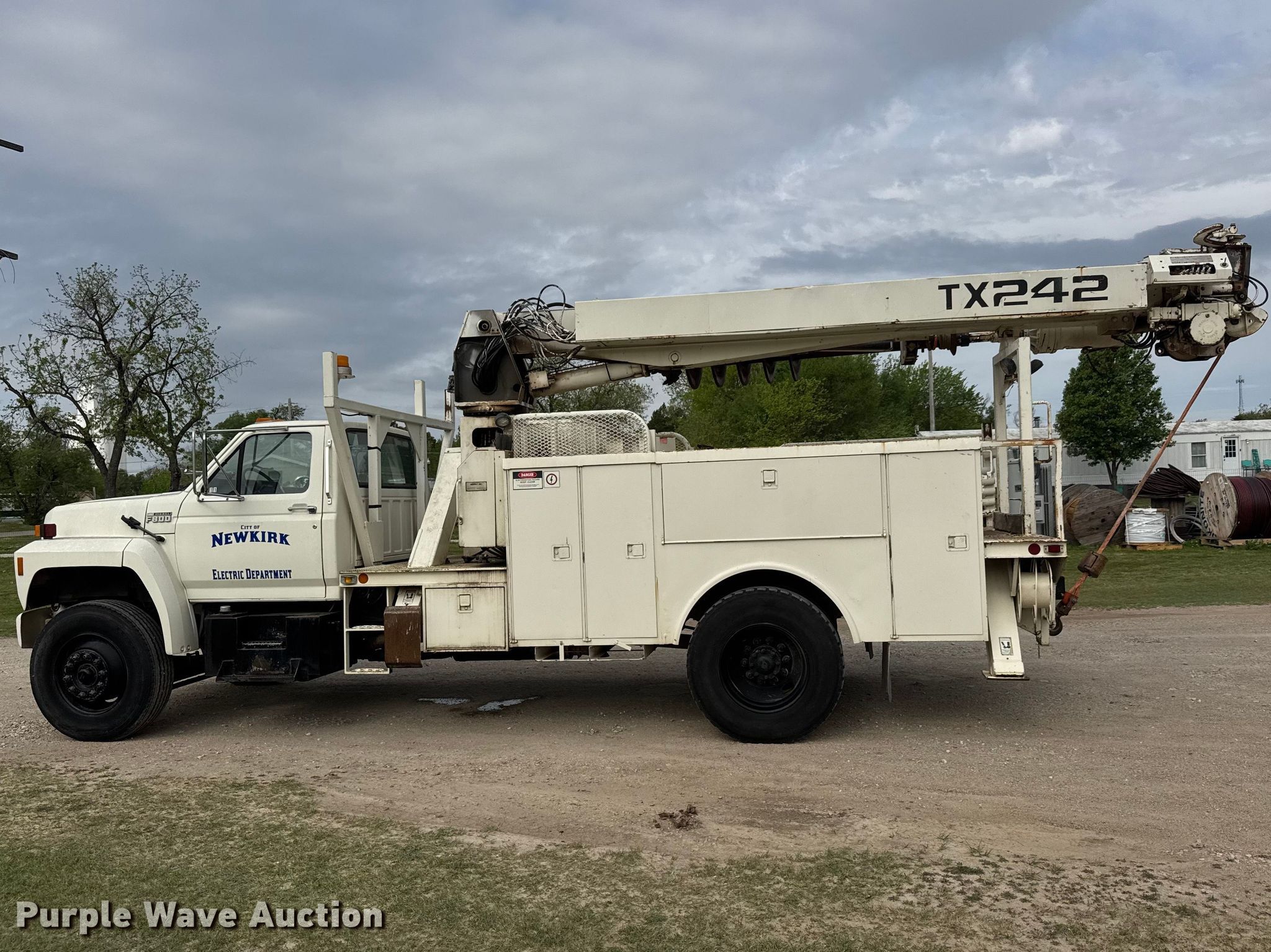 1991 Ford F800 digger derrick truck. Miles: 48,632 on odometer, Hours: 5,491 on meter, VIN: 1FDXK84A5MVA26303. Engine Ford, Serial: 7Z088521, Displacement: 7.8L, Cylinders: 6, Fuel type: Diesel. Transmission Automatic. Chassis Axles: Single, Suspension: Spring, Brakes: Air, PTO, GVWR: 33,000 lbs, Wheelbase: 190". Interior AC, Heat. Features Bed UEC, Length: 16', Width: 94", Boom Reedrill TX245B-2, Serial: 1055888, Maximum lift capacity: 14,497 lbs, Maximum lift height: 45', Boom type: Telescopic, Boom controls Platform, Material handler, Pole guide, Auger Diameter: 18".. Tires Size: 11R22.5. Notes Boom cylinder issues, leaks. Oklahoma title. Title distribution may be delayed up to 14 days from verification of funds. City of Newkirk, OK. Newkirk, OK 74647