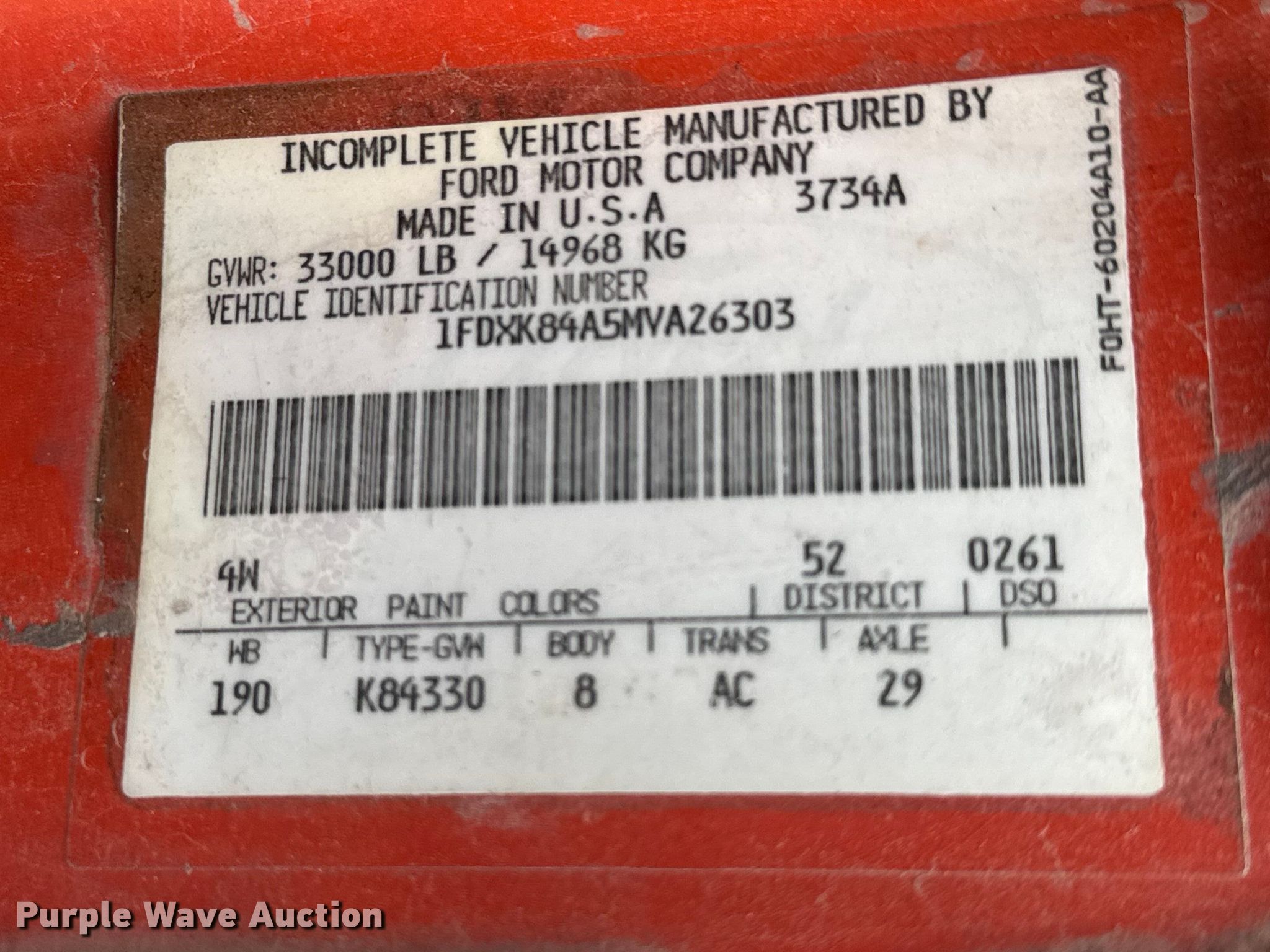 - VIN: 1FDXK84A5MVA26303