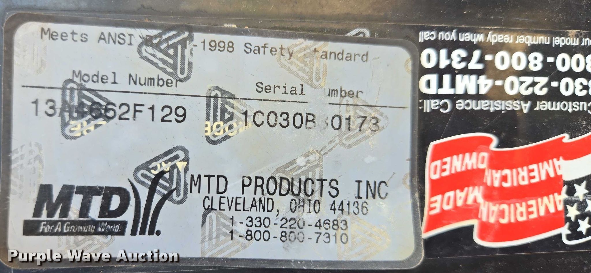 Purple Wave is selling a used Lawn Mower in South Dakota. This item is a MTD lawn mower with the following: Cutting width: 38", Serial: 1C030B30173