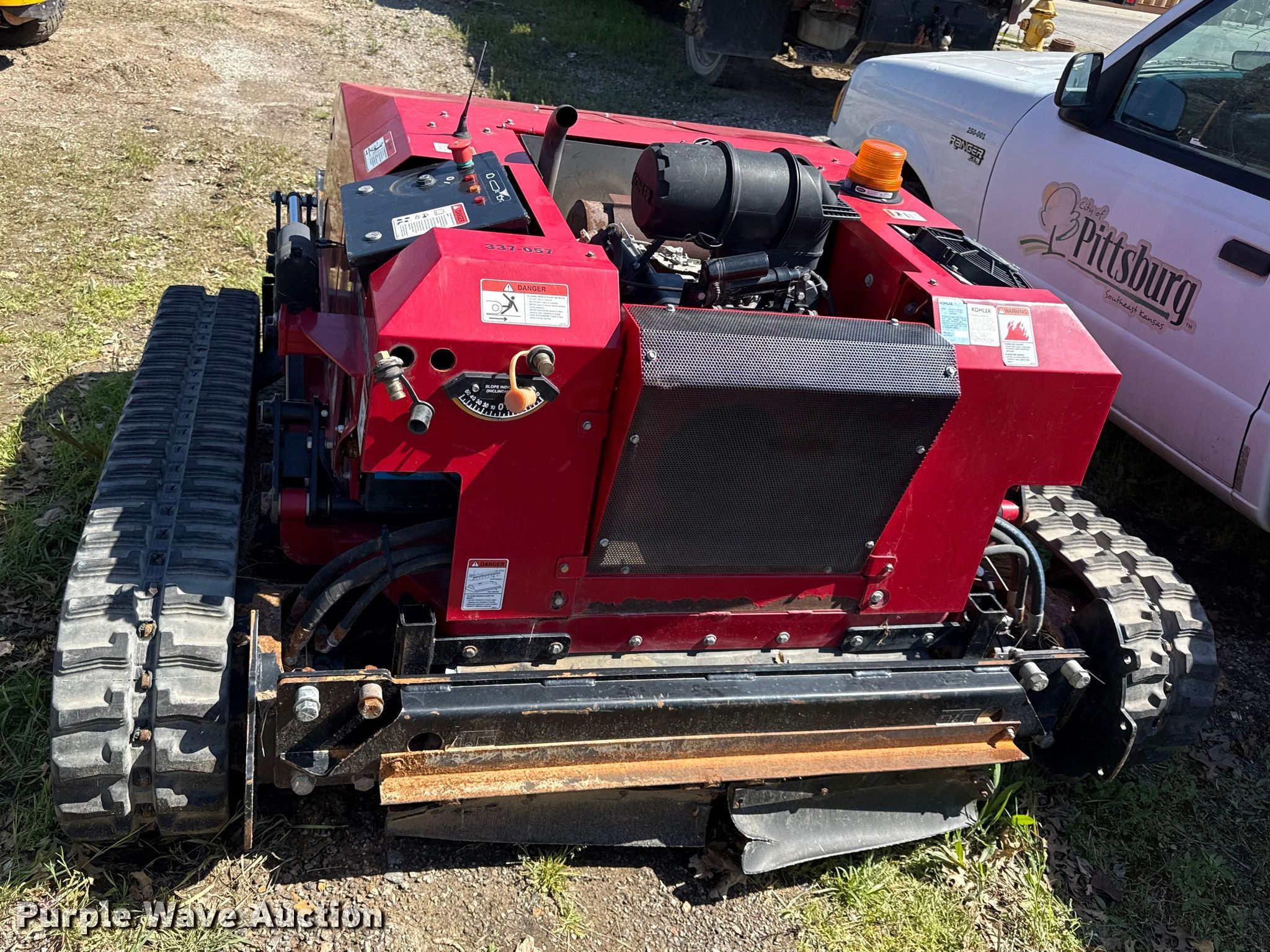 Tiger Slope Pro remote controlled slope mower. Cutting width: 54". Engine Kohler, Cylinders: 2, Fuel type: Gas. Transmission Hydrostatic. Tracks Width: 9". Notes Remote and mower batteries need replaced, Dead battery, Unknown operating condition. City of Pittsburg. Pittsburg, KS 66762