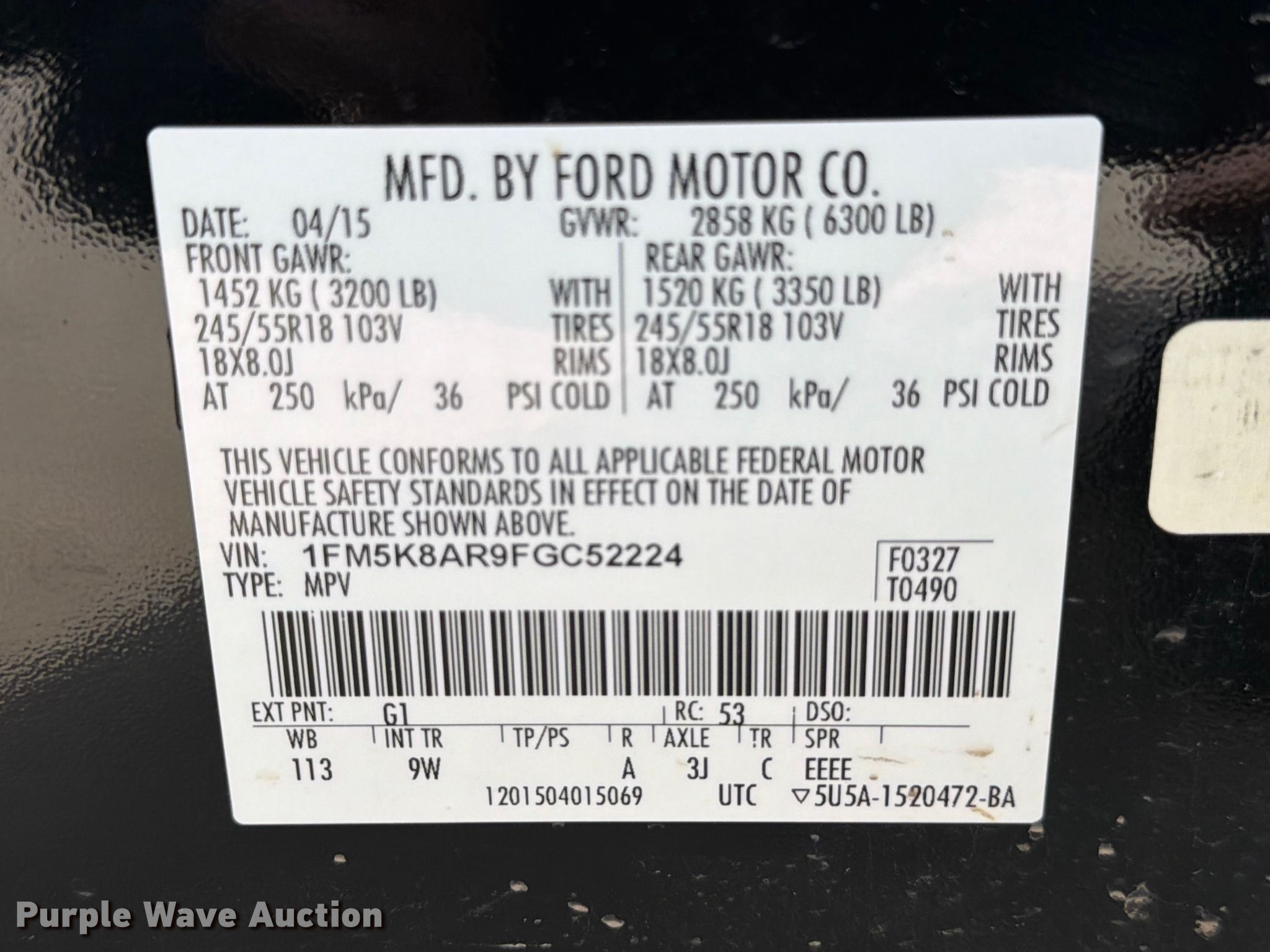 - VIN: 1FM5K8AR9FGC52224