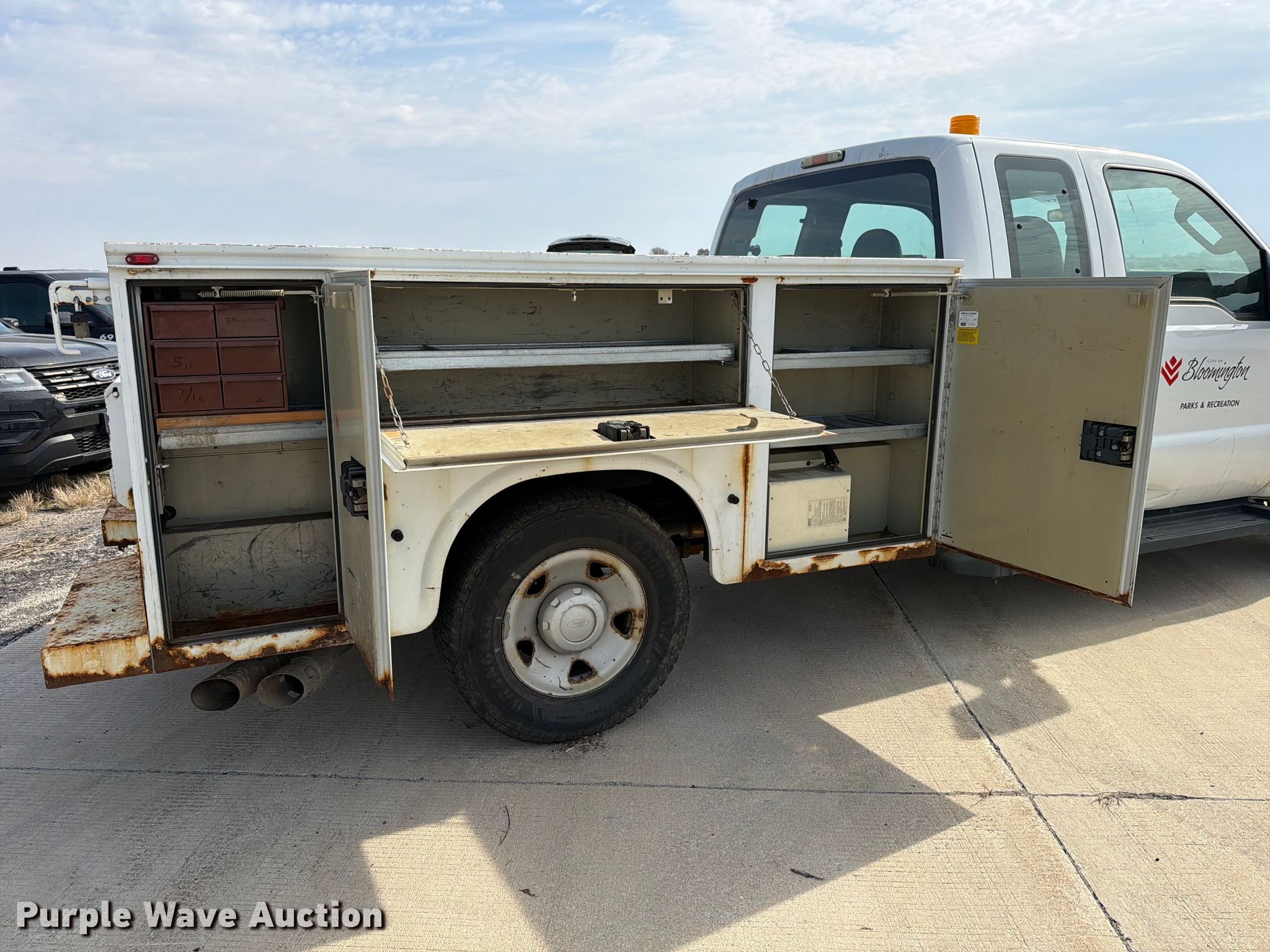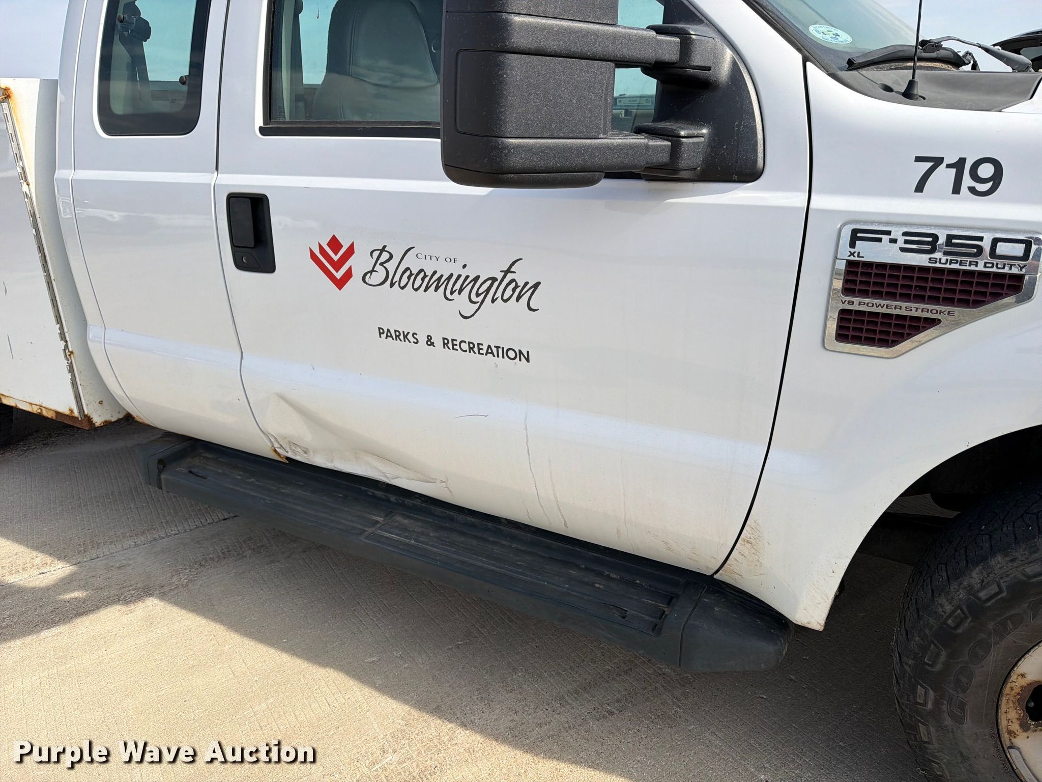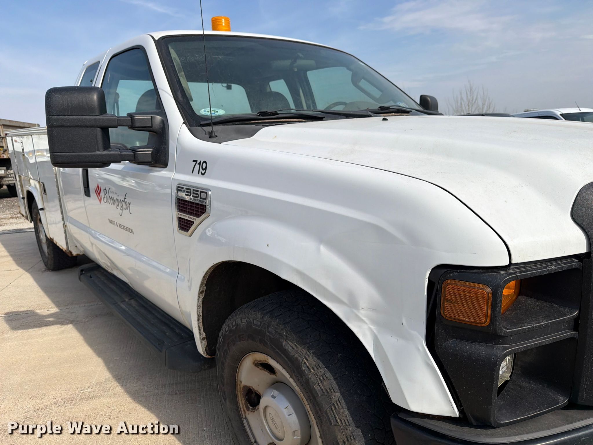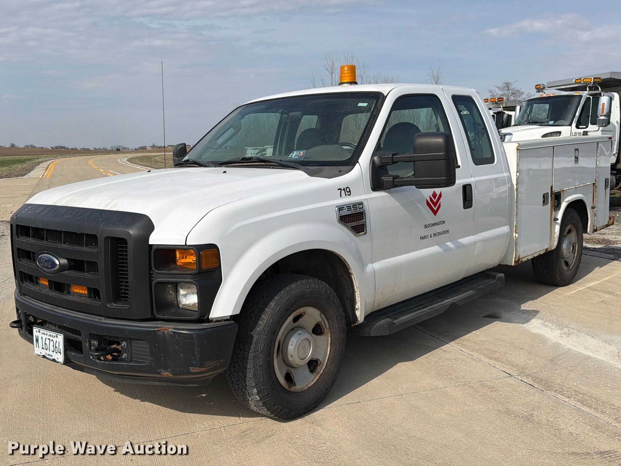 2008 Ford F350 Super Duty XL Ext. Cab utility bed pickup truck. Miles: 82,802 on odometer, VIN: 1FDWX30R48ED63420, Unit #: 719. Engine Displacement: 6.4L, Cylinders: 8, Fuel type: Diesel. Transmission Automatic. Interior AC, Heat, Brake controller. Features Bed Utility bed, Knapheide 696J, Serial: 20080325-0110868, Length: 8', Width: 78". Tires Size: 265/70R17. Notes Dash warning indicator: Check engine, Rear seat missing. Illinois title. Title distribution may be delayed up to 30 days from verification of funds. City of Bloomington. 2602 6 Points Road. Bloomington, IL 61705