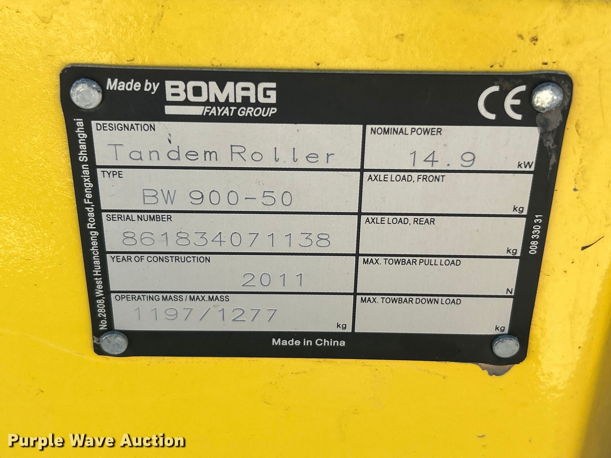 Purple Wave is selling a used Double Drum Roller Compactor in Missouri. This item is a 2011 Bomag BW900-50 double drum vibratory roller with the following: Hours: 4 on meter, Serial: 861834071138