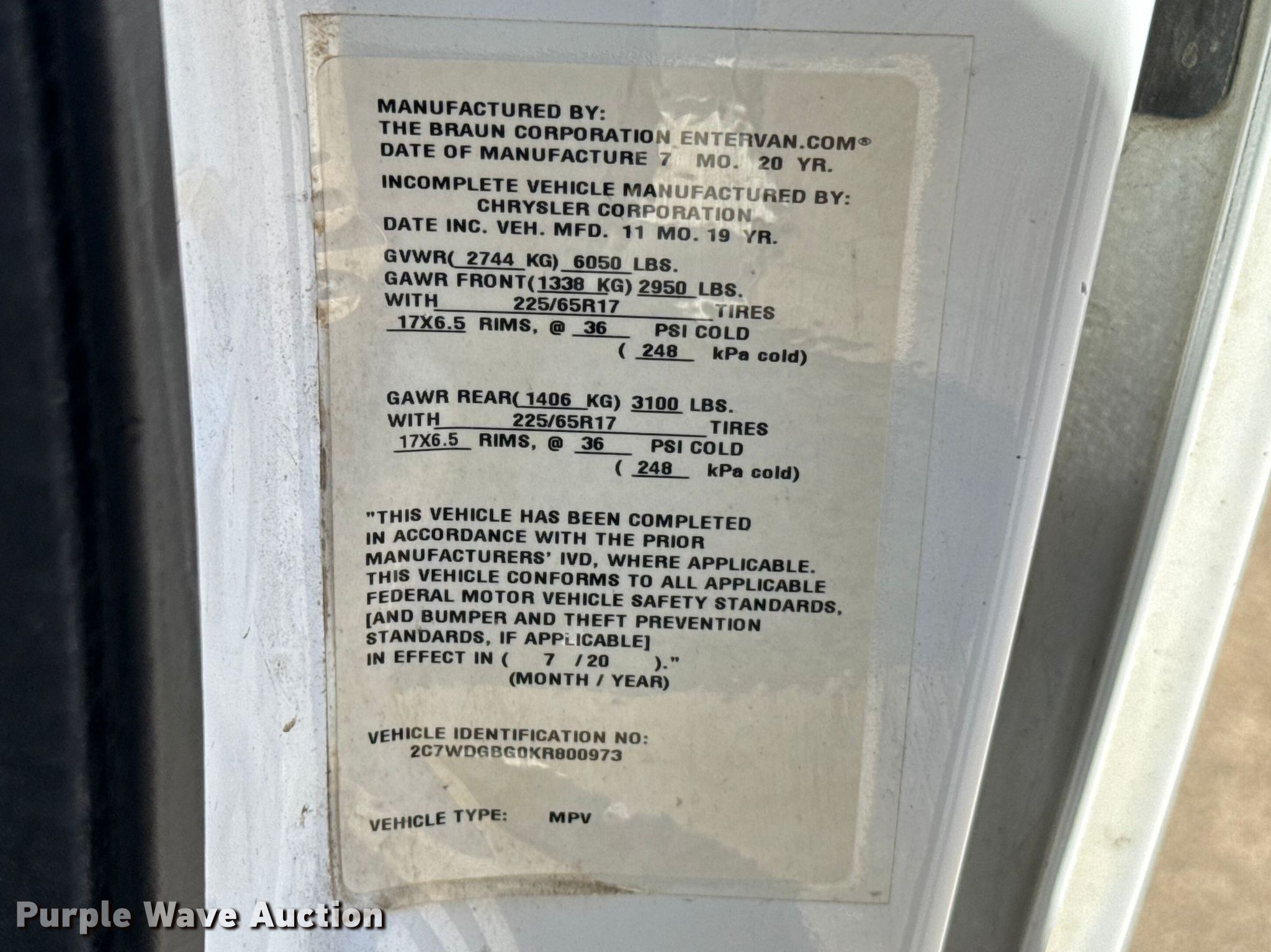 Purple Wave is selling a used Passenger Vehicle in Oklahoma. This item is a 2019 Dodge Grand Caravan handicap accessible van with the following: Miles: 202,415 on odometer, VIN: 2C7WDGBG0KR800973, Unit #: 270