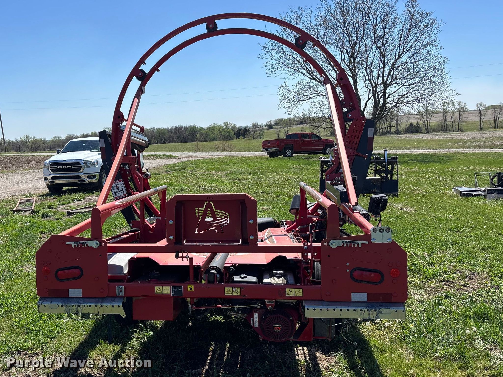 2016 Anderson IFX660 bale wrapper. Bales wrapped: 4,087, Serial: 7216077. Engine Honda GX 390, Cylinders: 1, Fuel type: Gas. Transmission Hydrostatic. Features Lazer auto steer, Bale capacity: 72" H. Tires Front: 11-15, Rear: 29x12.5-15. Notes Additional plastic included. Vermillion, KS 66544