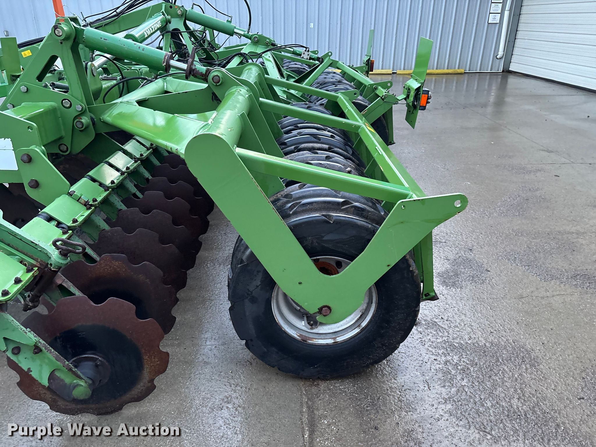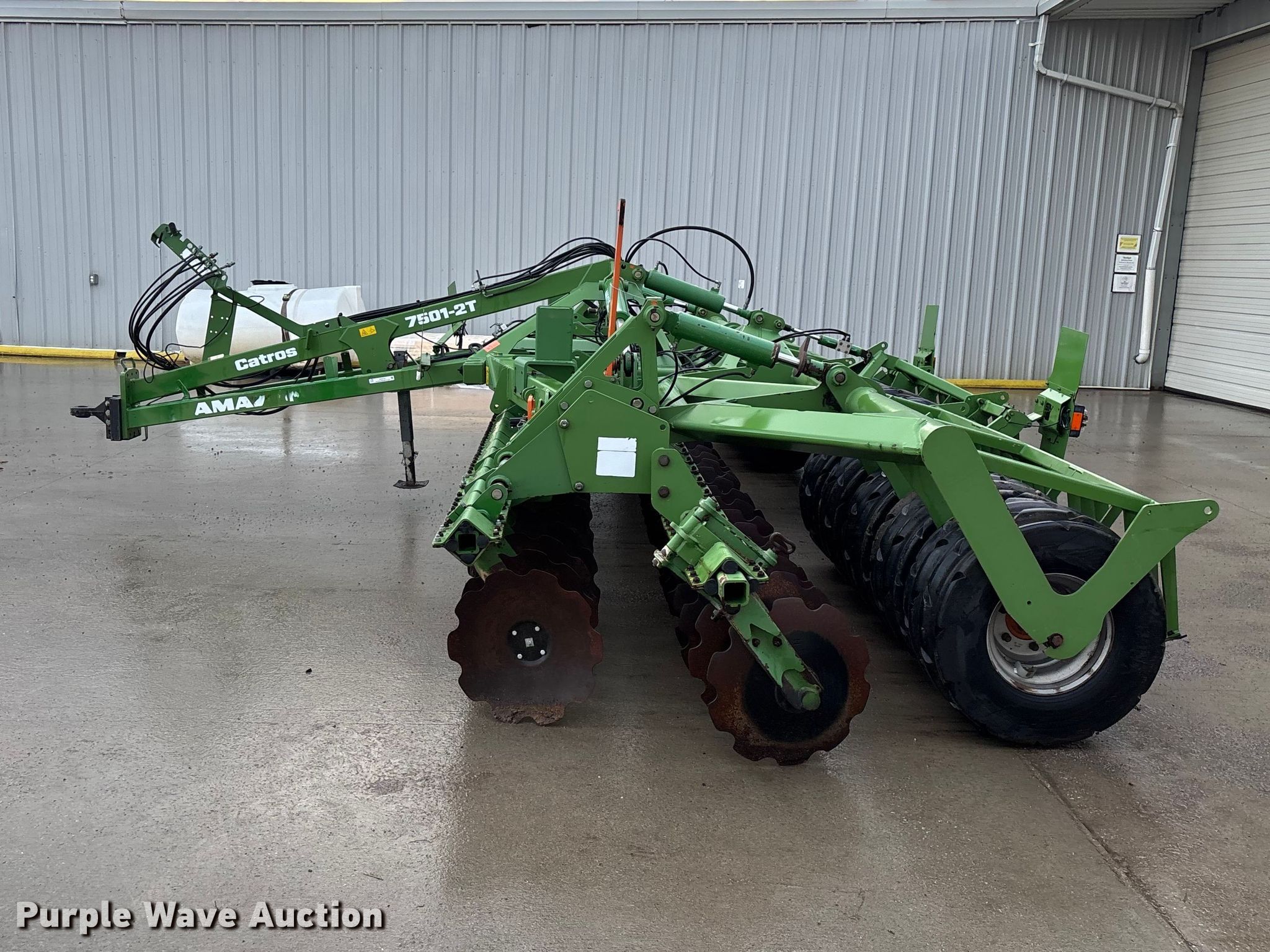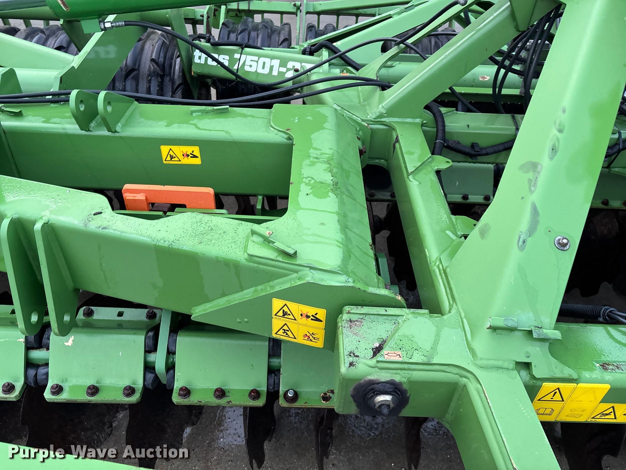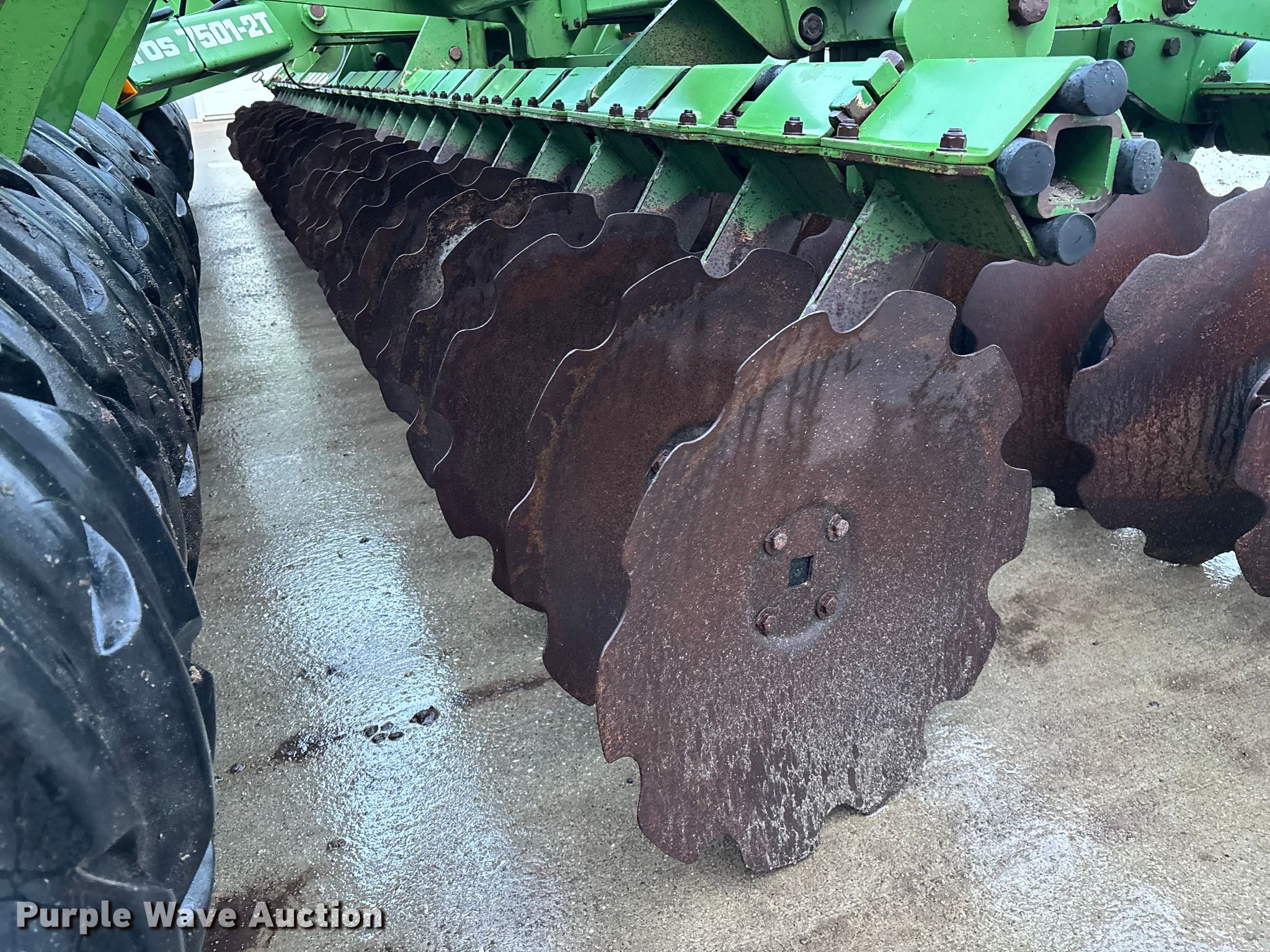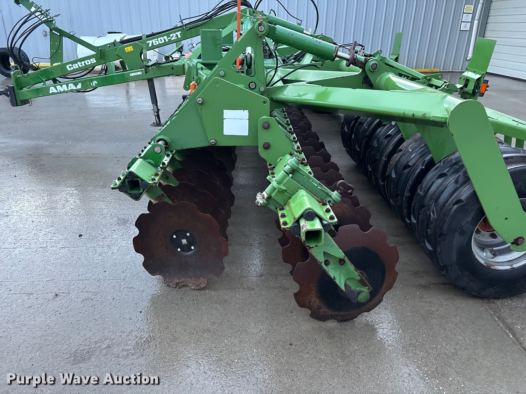 Amazone Catros 7501-2T disk. Overall width: 24' 6", Serial: CAT0018490. Features Front blades Diameter: 22", Spacing: 10", Rear blades Diameter: 22", Spacing: 10", Operation Hydraulic lift, Hydraulic fold, Leveler: Hydraulic, Attachments Transport lights. Tires Tire size: 400/50-15.5 IMP. Notes Trailer not included, Transport light damaged. Van Dyk Farms. Imlay City, MI 48444