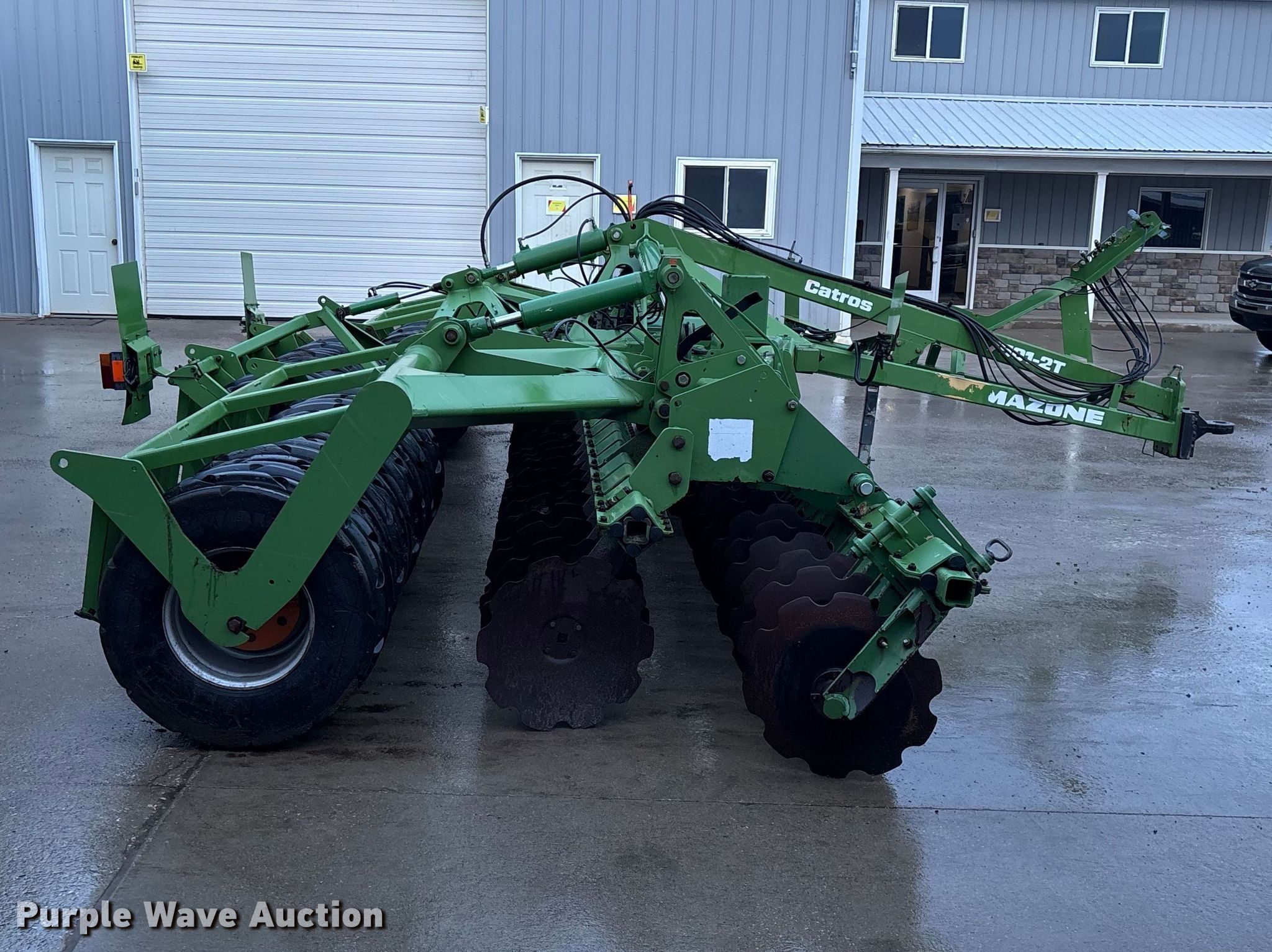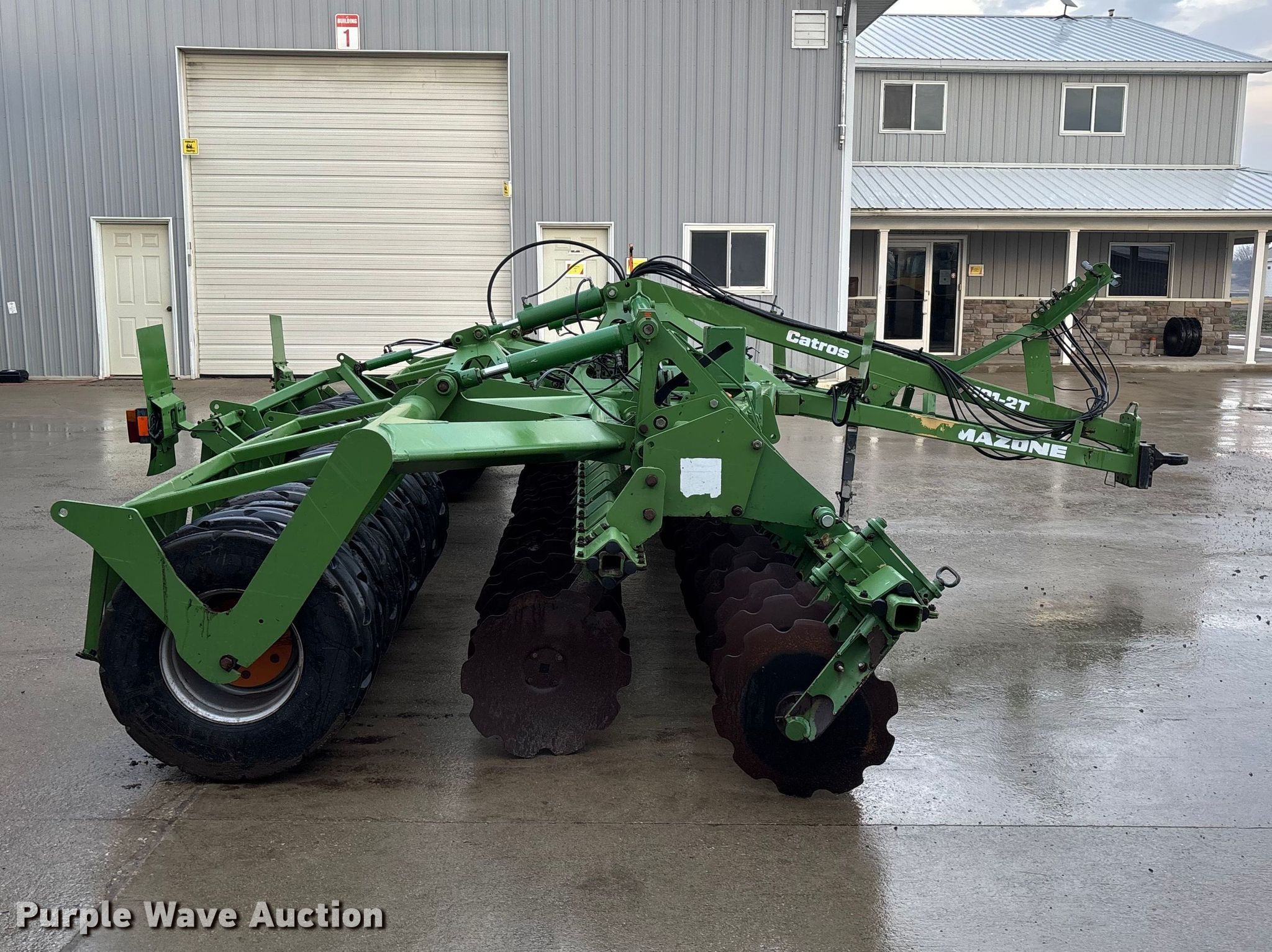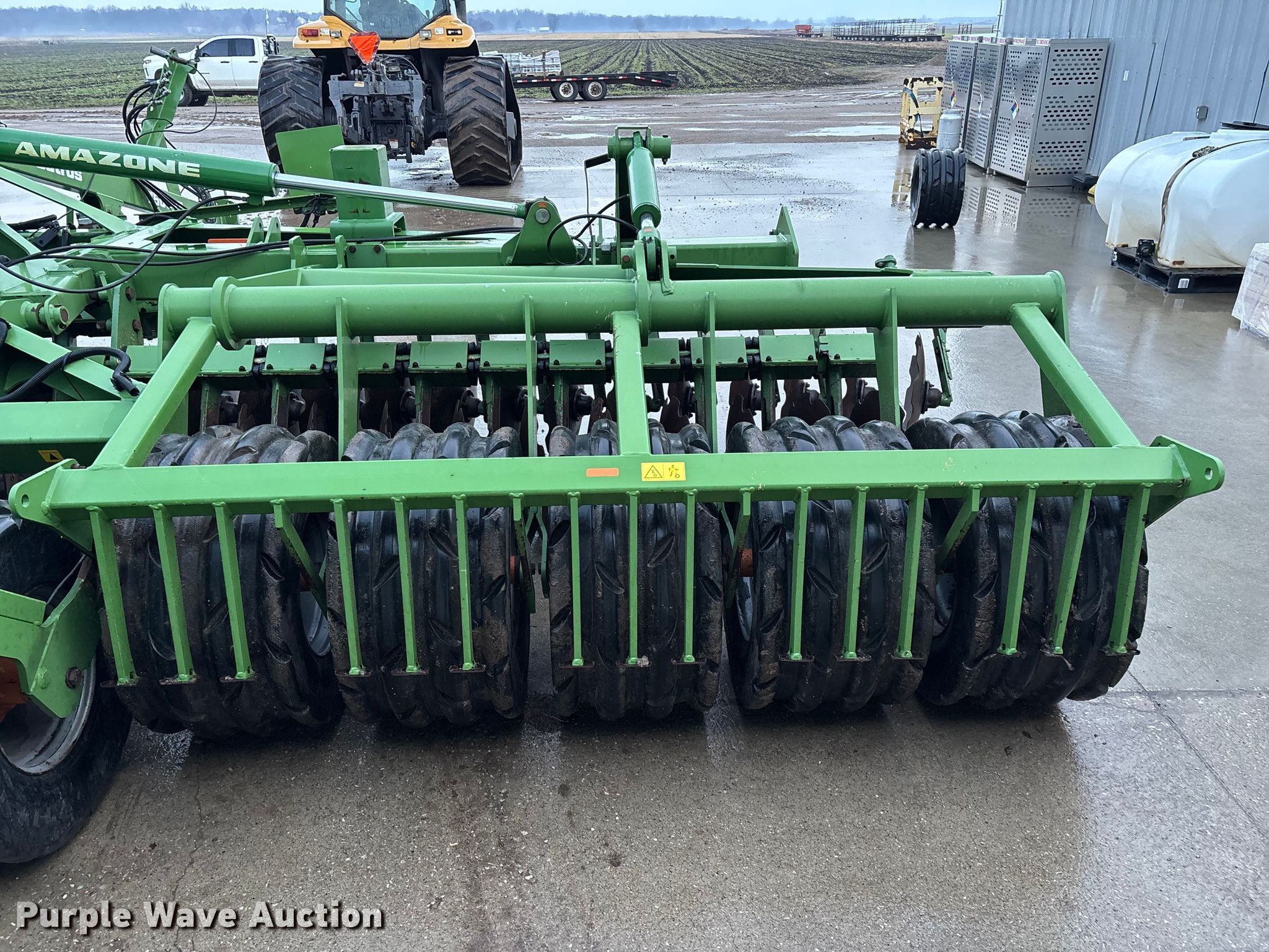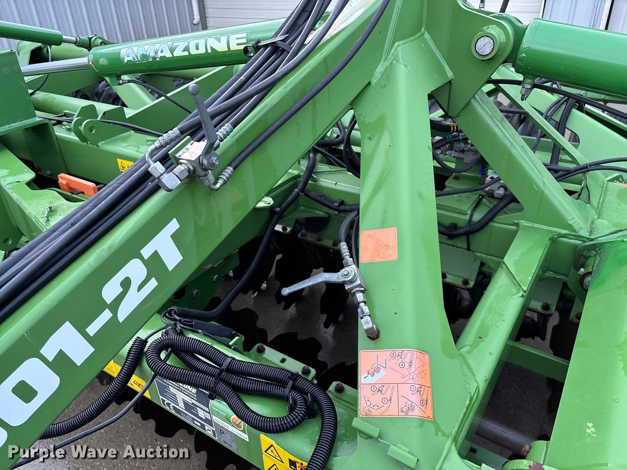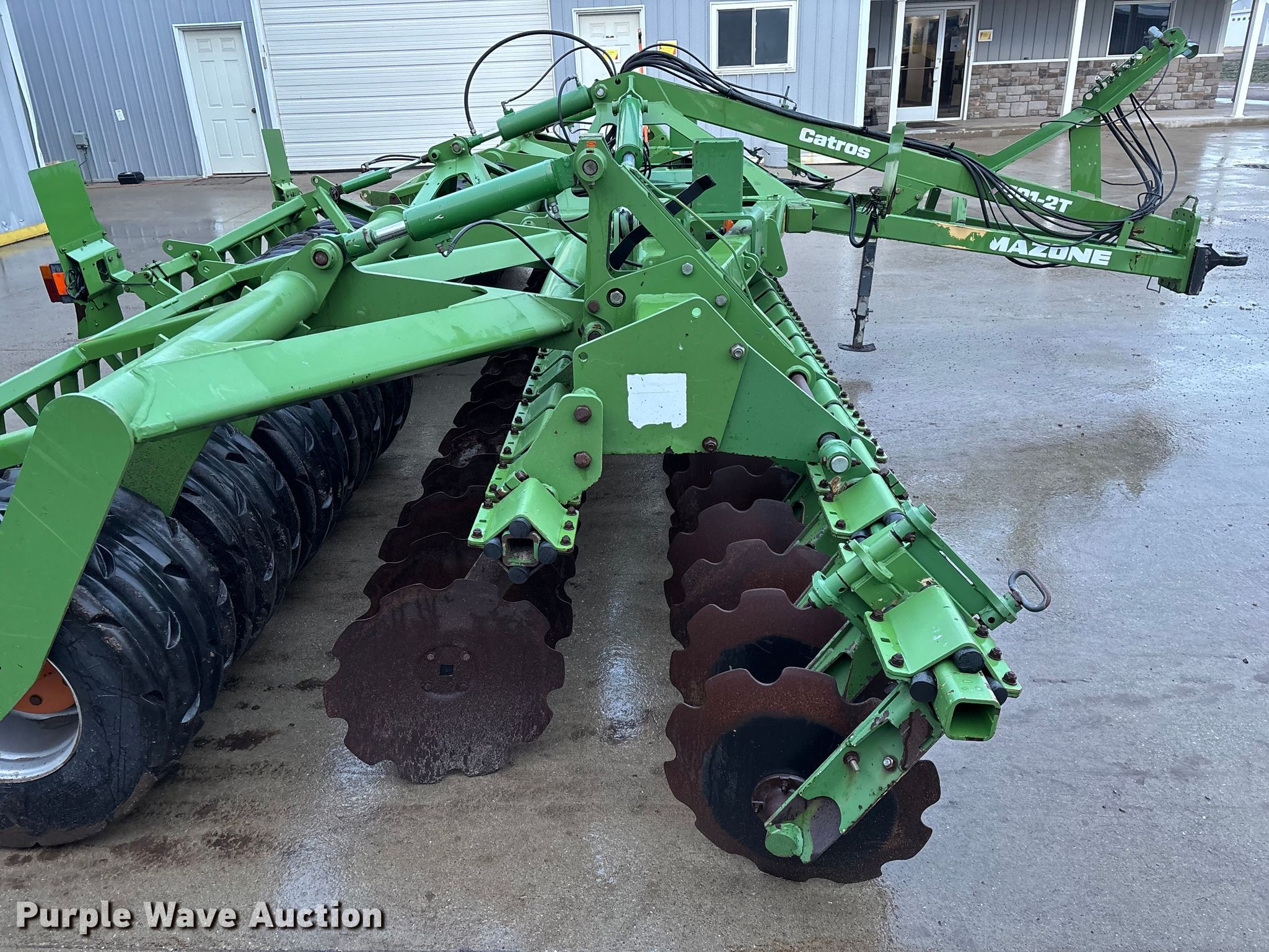 Amazone Catros 7501-2T disk. Overall width: 24' 6", Serial: CAT0018490. Features Front blades Diameter: 22", Spacing: 10", Rear blades Diameter: 22", Spacing: 10", Operation Hydraulic lift, Hydraulic fold, Leveler: Hydraulic, Attachments Transport lights. Tires Tire size: 400/50-15.5 IMP. Notes Trailer not included, Transport light damaged. Van Dyk Farms. Imlay City, MI 48444