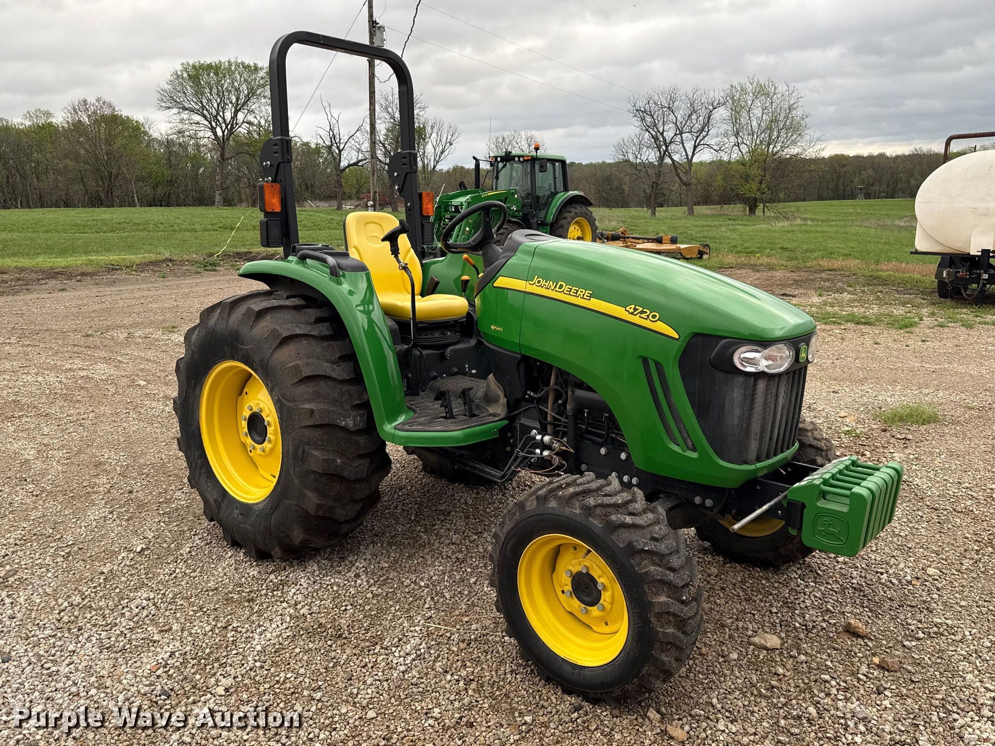 2013 John Deere 4720 MFWD tractor. Hours: 633 on meter, Serial: 1LV4720HPDH916349. Engine John Deere, Displacement: 2.4L, Cylinders: 4, Fuel type: Diesel. Transmission Hydrostatic, Differential lock. Features PTO: 540, Hydraulic remote sets Rear: 1. Tires Front: 10x16.5, Rear: 16.9-24. Blue Mound, KS 66010