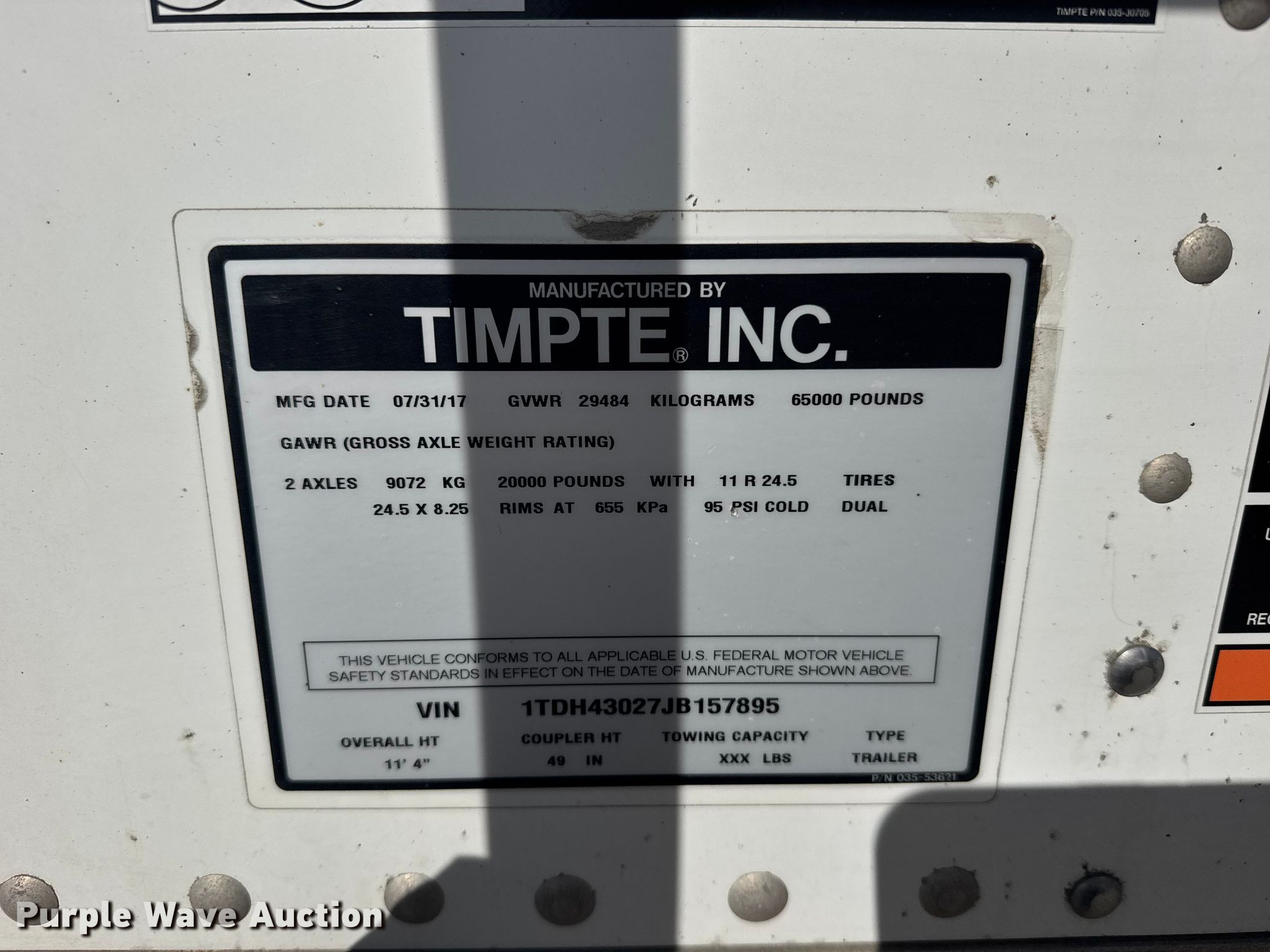 2018 Timpte, Inc Timpte grain trailer. VIN: 1TDH43027JB157895. Dimensions Overall Length: 44', Width: 102", Body Length: 43', Width: 102", Side height: 68". Features Body type: Aluminum, Hoppers: Double Trap gates: Air operated, Roll tarp. Chassis Landing gear: Dual, Suspension: Air, Brakes: Air, Axles: Tandem, GVWR: 65,000 lbs, GAWR: 20,000 lbs. Tires Aluminum wheels, Size: 295/75R22.5. Kansas title. Title distribution may be delayed up to 30 days from verification of funds. Wilson Bulk Transport. Abilene, KS 67410