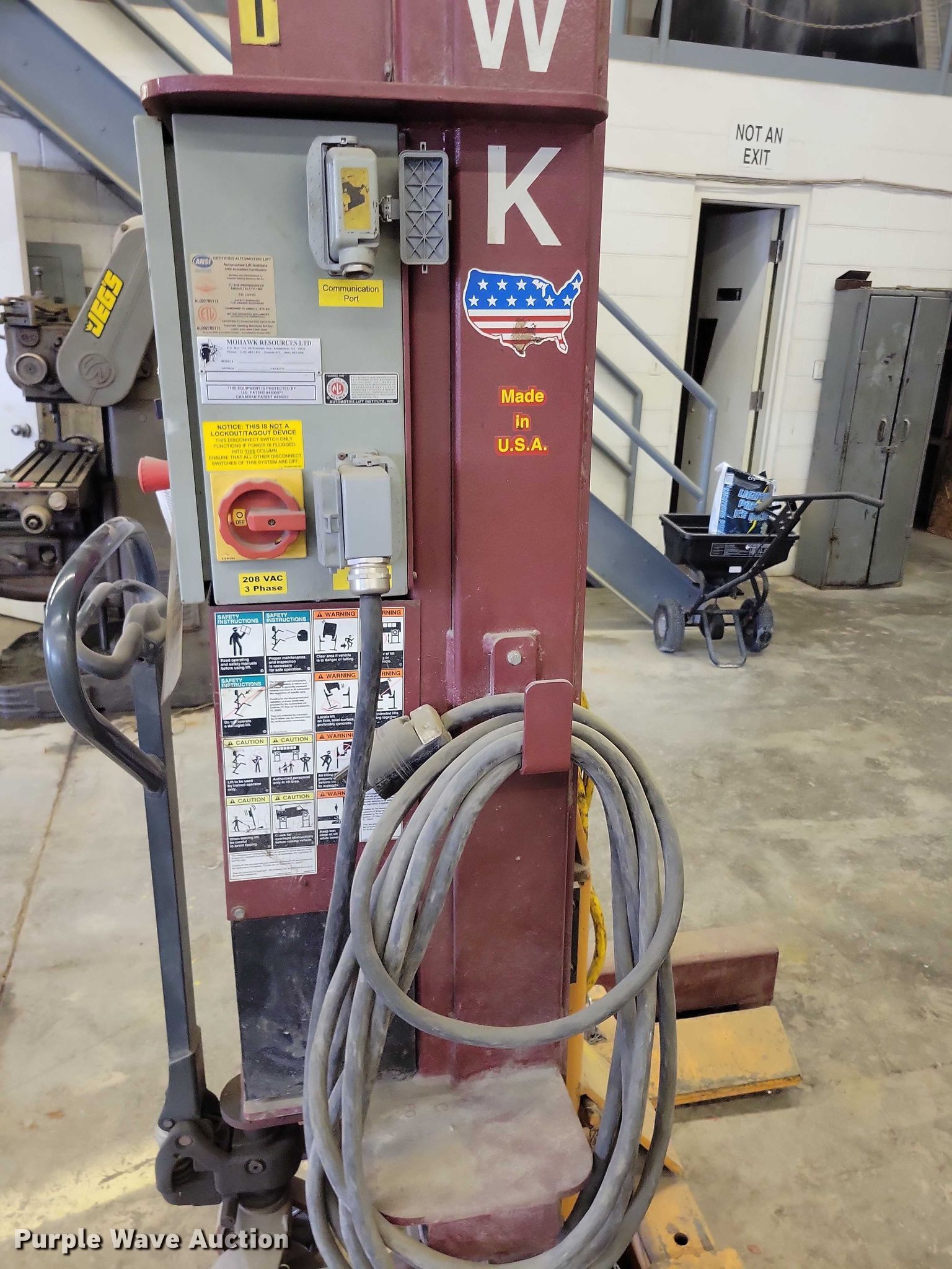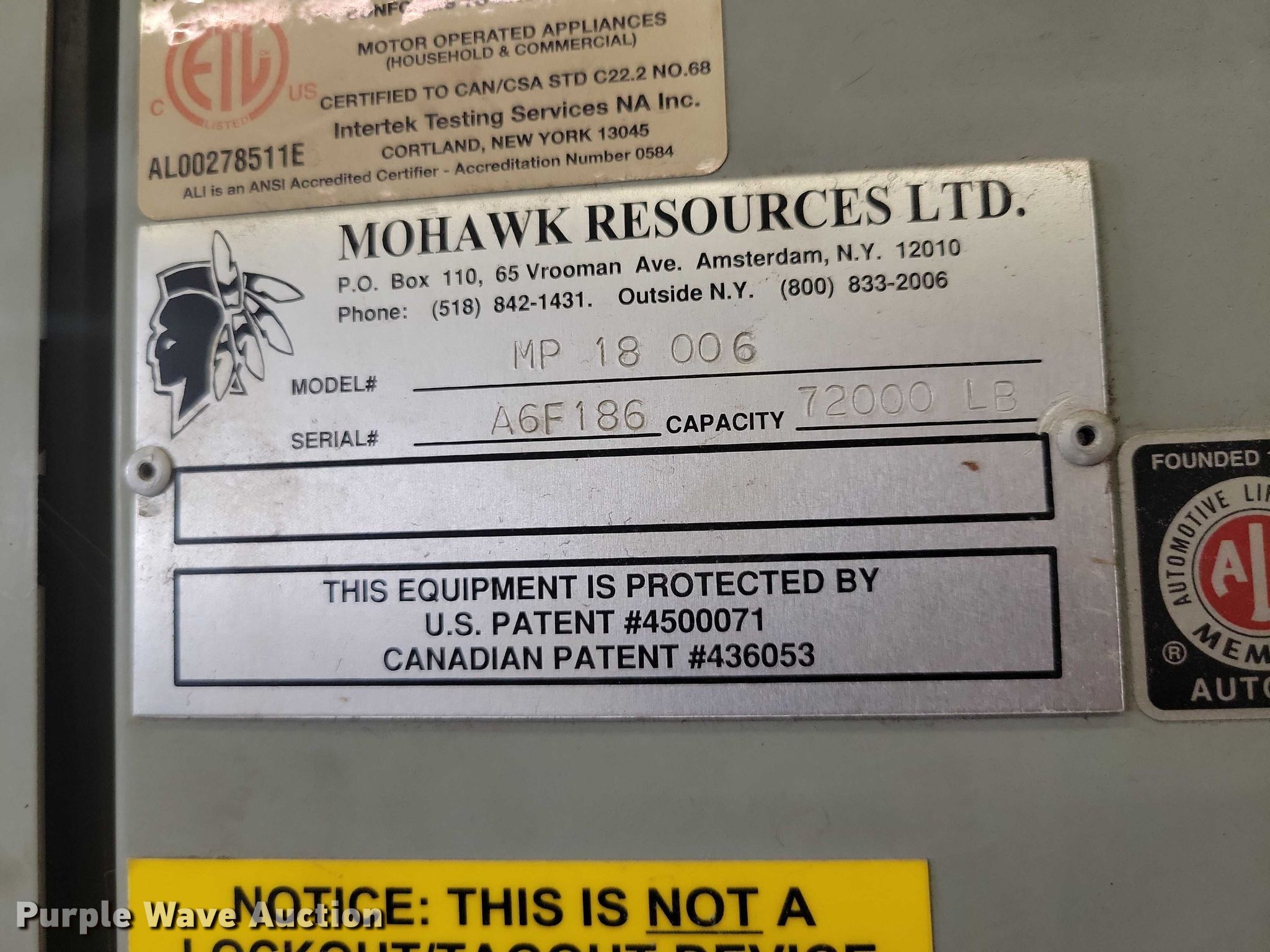 Mohawk MP18006 four post lift. Serial: A6F186. Features (4) jack stands, Capacity: 72,000 lbs, Volts: 208, Phase: Three. Cedar Valley Corp, LLC. Waterloo, IA 50703