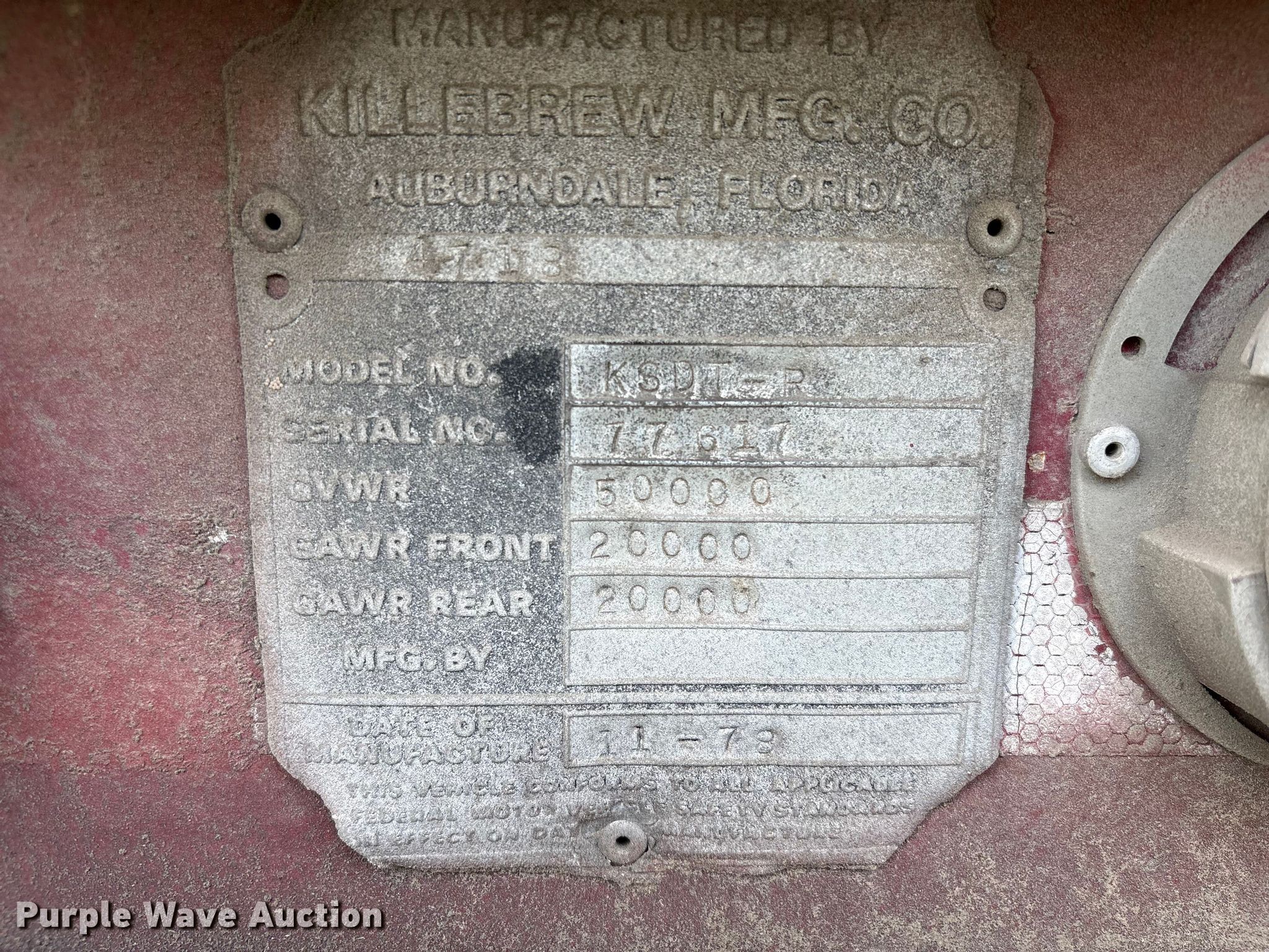 1979 Killebrew fertilizer delivery trailer. VIN: 77617. Dimensions Overall Length: 36'. Features Capacity: 22 tons, Body type: Stainless steel, Compartments: 3, Self-contained hydraulics. Chassis Landing gear: Dual, Suspension: Spring, Brakes: Air, Axles: Tandem. Tires Steel wheels, Size: 11R24.5. Notes Axle missing Air lines capped, Tires missing. Texas title. Title distribution may be delayed up to 30 days from verification of funds. American Plant Food Corp.. Galena Park, TX 77547