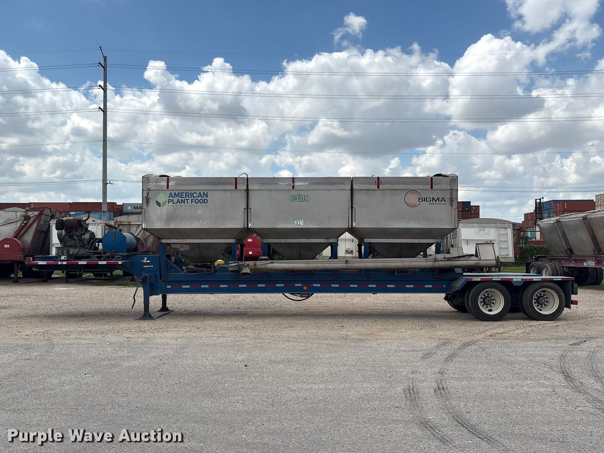 2013 Behnke Enterprises fertilizer delivery trailer. VIN: 4L5AB4228DF028484. Dimensions Overall Length: 24', Width: 8' 6". Features Capacity: 24 tons, Body type: Stainless steel, Compartments: 3, Roll tarp, Discharge auger Length: 20', Diameter: 10", Self-contained hydraulics. Chassis Landing gear: Hydraulic, Suspension: Spring, Brakes: Air, Axles: Tandem. Tires Steel wheels, Size: 255/70R22.5. Texas title. Title distribution may be delayed up to 30 days from verification of funds. American Plant Food Corp.. Galena Park, TX 77547