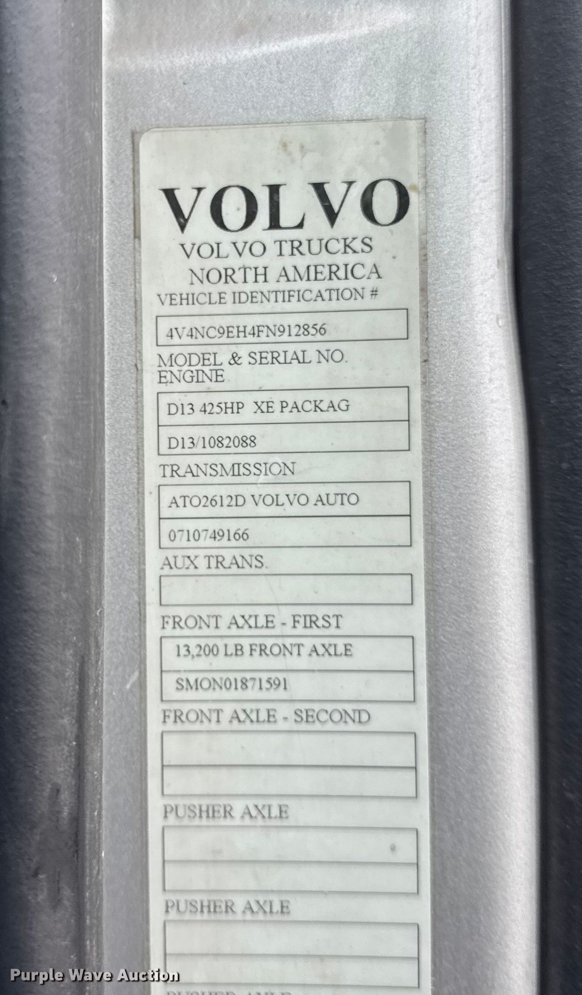 2015 Volvo VNL semi truck. Miles: Unknown, VIN: 4V4NC9EH4FN912856. Engine Volvo D13, Displacement: 12.8L, Cylinders: 6, Fuel type: Diesel, HP: 425, Engine brake. Transmission Automated manual. Chassis Axles: Tandem, Differential lock: Inter-axle, Suspension: Air, Brakes: Air, GVWR: 51,200 lbs FAWR: 13,200 lbs, IAWR: 19,000 lbs, RAWR: 19,000 lbs. Interior AC, Heat, Cruise control, Air ride cab Beds: Double bunk, Rear climate control. Features Fifth wheel type: Air operated, Sliding, Fuel tank: Dual. Tires Size: 295/75R22.5. Notes Parts missing, ECM removed, Headlights missing, Oil cap damaged, Door electrical switches missing, Non-operational Unit must be towed or hauled. Illinois title. Mileage has not been verified. Odometer discrepancy will be marked on the title. Title distribution may be delayed up to 14 days from verification of funds. White City Logistics. East Dundee, IL 60118