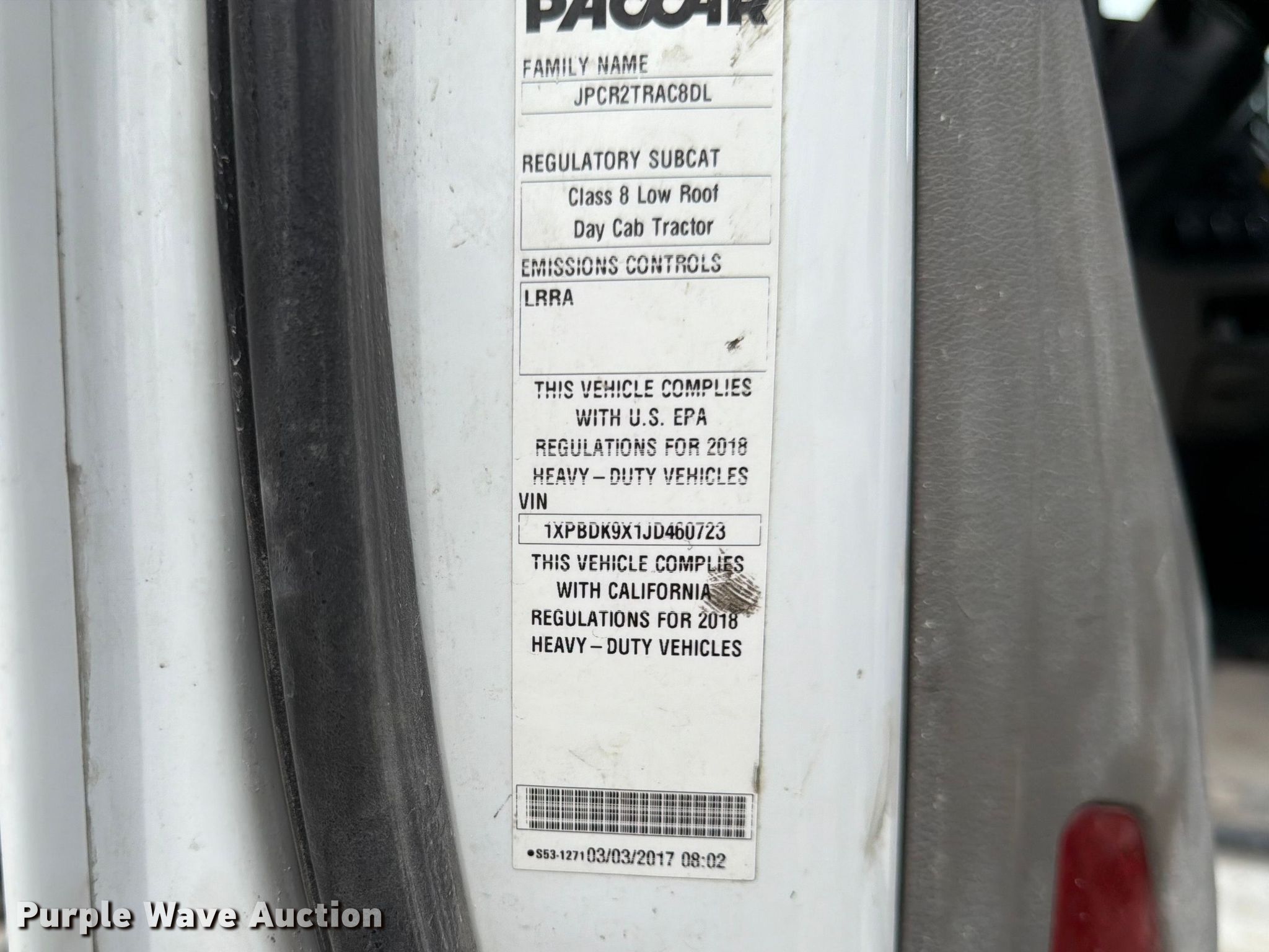 2018 Peterbilt 579 semi truck. Miles: 395,823 on odometer, Hours: 16,368 on meter, VIN: 1XPBDK9X1JD460723. Engine Paccar MX-11, Cylinders: 6, Fuel type: Diesel, Engine brake. Transmission Eaton Fuller, Manual, Speed: 10. Chassis Axles: Tandem, Differential lock: Inter-axle, Suspension: Air Dump valves, Brakes: Air, GVWR: 50,000 lbs FAWR: 12,000 lbs, IAWR: 19,000 lbs, RAWR: 19,000 lbs. Interior AC, Heat, Heated mirrors, Power windows, Power locks, Cruise control, Air ride cab. Features Deck plate: Aluminum, Fifth wheel type: Air operated, Sliding, Fuel tank: Single. Tires Size: 295/75R22.5. Notes Dash warning indicator: Check engine. Kentucky title. Title distribution may be delayed up to 14 days from verification of funds. Bulk First LLC. Louisville, KY 40211