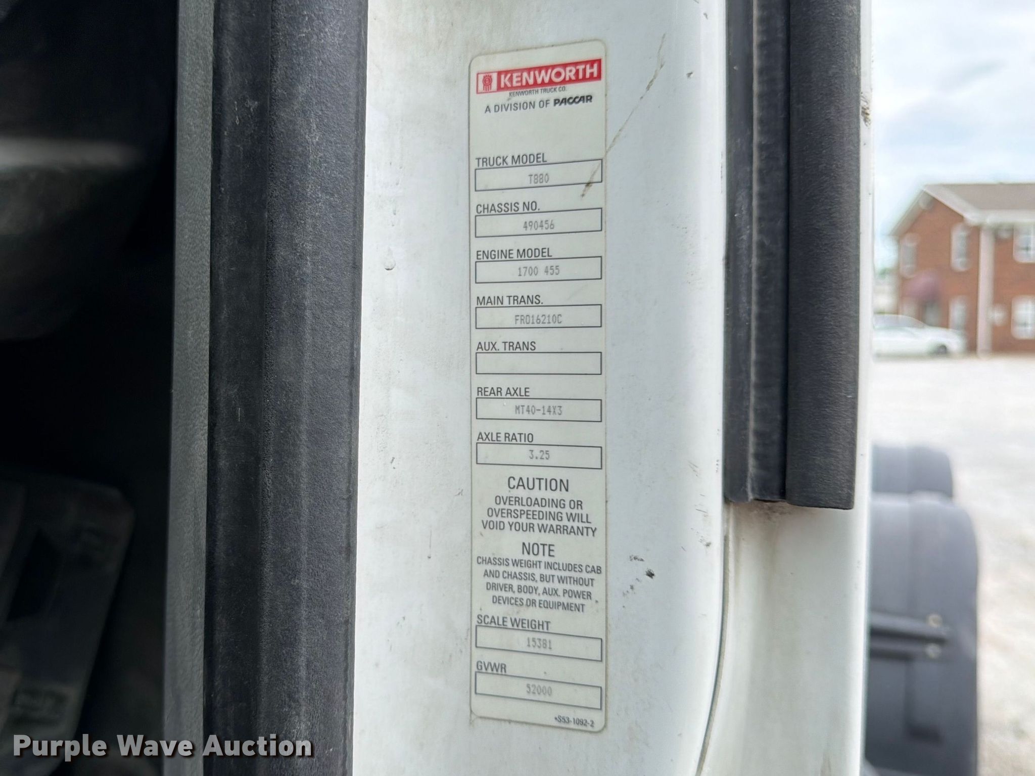 2016 Kenworth T880 semi truck. Miles: 807,357 on odometer, Hours: 22,806 on meter, VIN: 1XKZDP9X6GJ490456. Engine Paccar MX-13, Serial: Y075143, Displacement: 12.9L, Cylinders: 6, Fuel type: Diesel, HP: 455, Engine brake. Transmission Eaton Fuller FRO16210C, Manual, Speed: 10. Chassis Axles: Tandem, Gear ratio: 3.25, Differential lock: Inter-axle, Suspension: Air Dump valves, Brakes: Air, GVWR: 52,000 lbs FAWR: 12,000 lbs, IAWR: 20,000 lbs, RAWR: 20,000 lbs. Interior AC, Heat, Heated mirrors, Power windows, Power locks, Cruise control, Air ride cab. Features Deck plate: Aluminum, Fifth wheel type: Air operated, Sliding, Fuel tank: Single. Tires Size: 295/75R22.5. Notes Dash warning indicator: Check engine. Kentucky title. Title distribution may be delayed up to 14 days from verification of funds. Bulk First LLC. Louisville, KY 40211