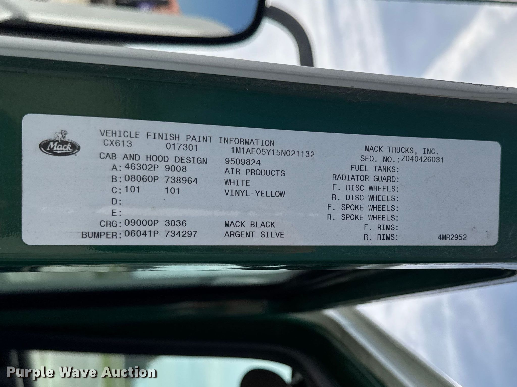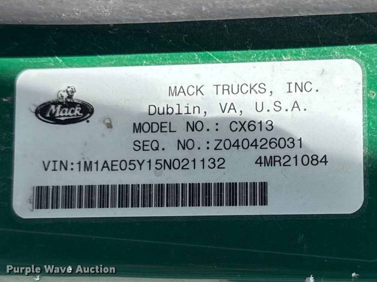 Take a look at this used 2005 Mack CX613 semi truck being sold on May 14th, 2026 in the Thursday May 14 Truck and Trailer Auction made by Mack. Take a look at all of the item information below or take a look at similar auctions for Trucks.