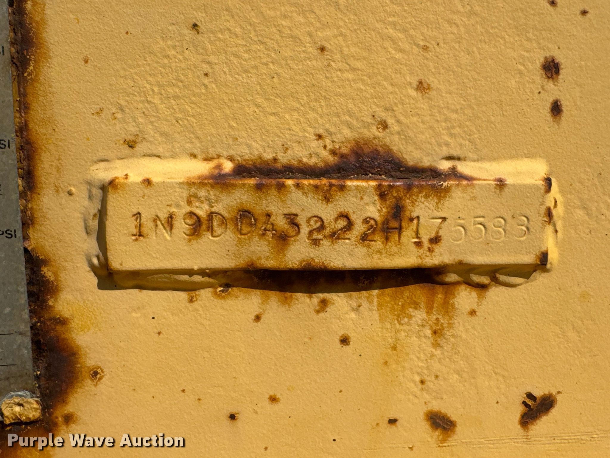 2002 Neville Built drop deck equipment trailer. VIN: 1N9DD43222H175588, Unit #: 15.423K. Dimensions Overall Length: 43', Width: 102", Deck Length: 29' 2", Width: 102", Top deck length: 12' 2", Deck height: 35", Tail length: 42". Features Deck type: Steel, Wood. Chassis Landing gear: Dual, Suspension: Spring, Brakes: Air, Axles: Tandem, GVWR: 80,000 lbs, GAWR: 20,000 lbs. Tires Steel wheels, Size: 235/75R17.5. Notes Deck board damaged. Kansas title. Title distribution may be delayed up to 30 days from verification of funds. Sherwood Construction Company. Wichita, KS 67277