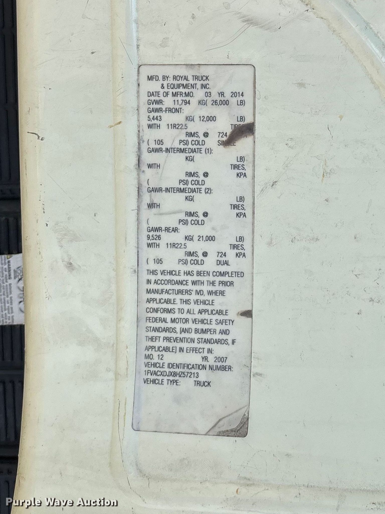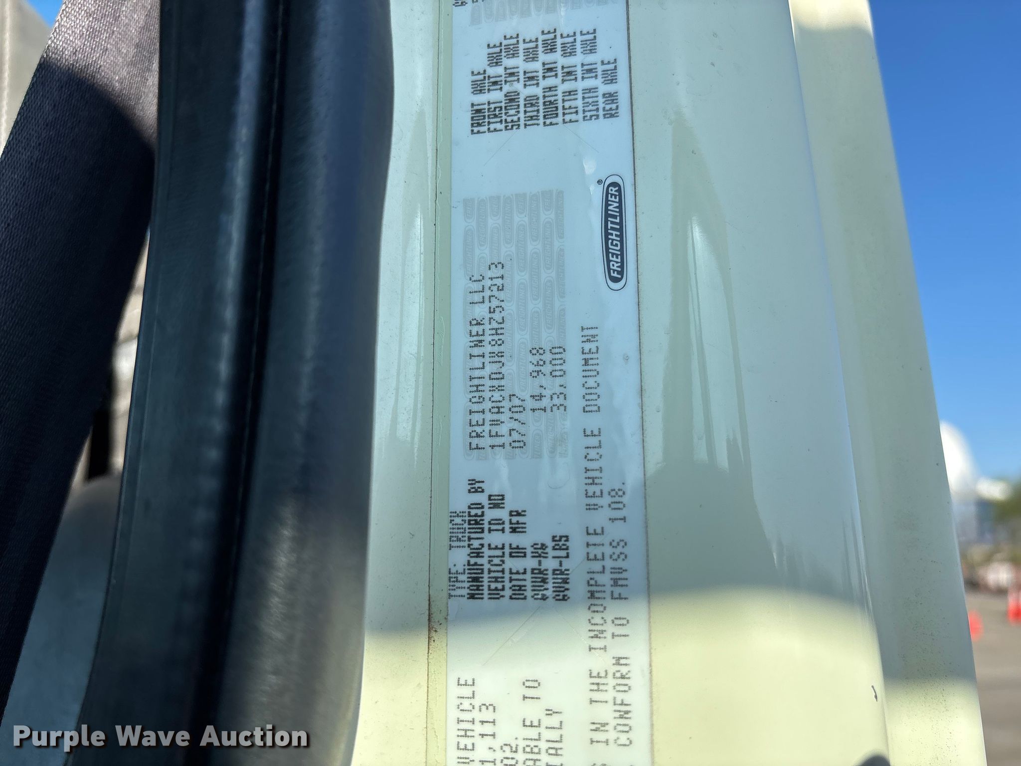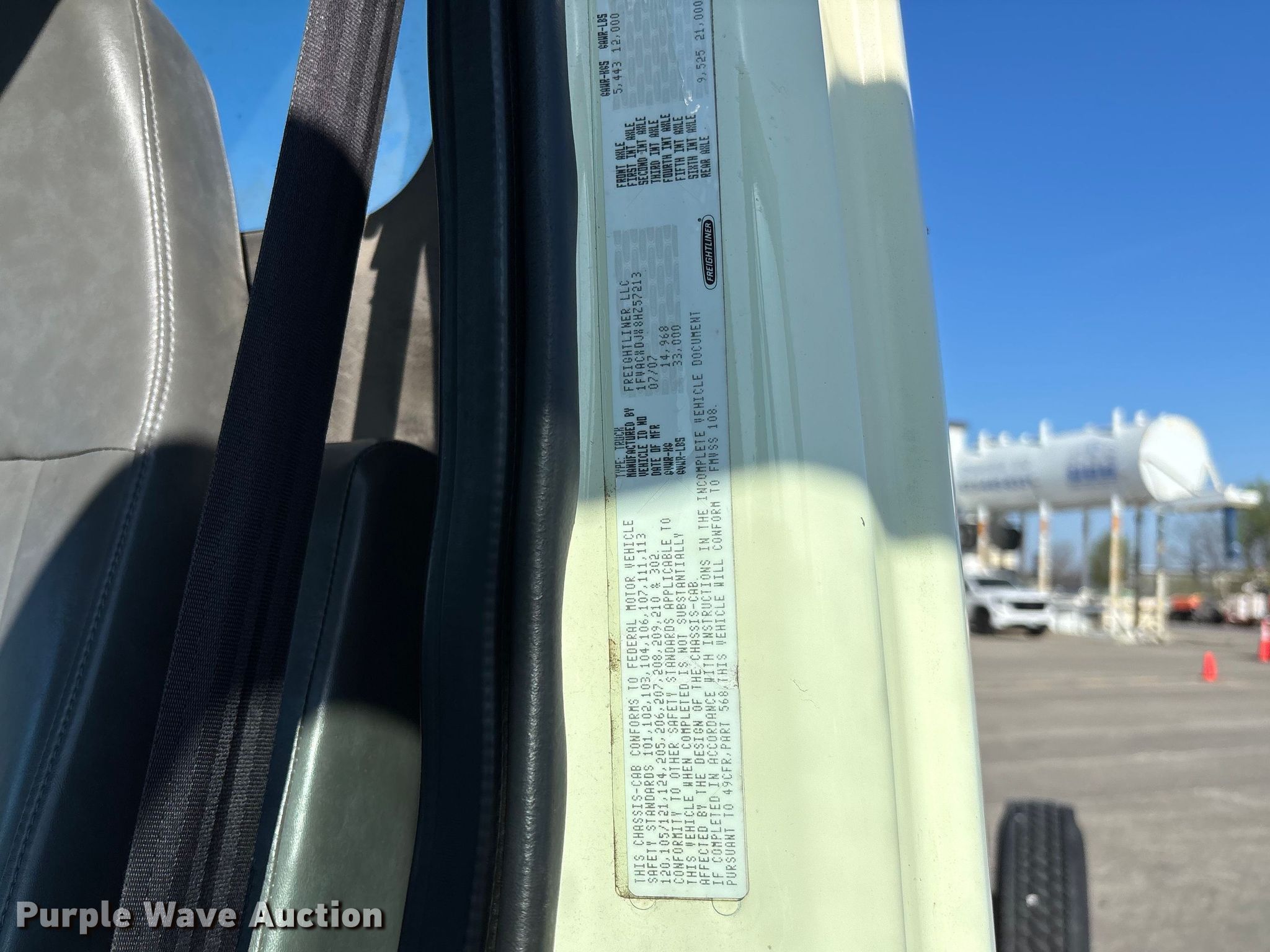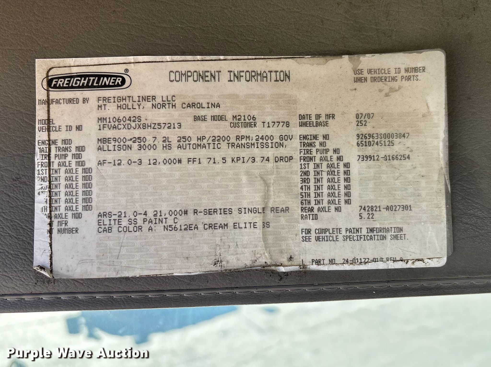 2008 Freightliner M2106 truck cab and chassis. Miles: 225,040 on odometer, Hours: 7,108 on meter, VIN: 1FVACXDJX8HZ57213, Unit #: 5-111. Engine Mercedes-Benz MBE900, Serial: 926963S0003847, Displacement: 7.2L, Cylinders: 6, Fuel type: Diesel, HP: 250, Engine brake. Transmission Allison 3000, Automatic. Chassis Axles: Single, Suspension: Air Dump valves, Brakes: Air, Truck chassis: 17' 5", GVWR: 33,000 lbs FAWR: 12,000 lbs, RAWR: 21,000 lbs, Wheelbase: 202". Interior AC, Heat, Heated mirrors, Power windows, Power locks, Cruise control. Features Fuel tank: Single. Tires Size: 295/75R22.5. Notes Windshield chipped or cracked. Missouri title. Title distribution may be delayed up to 30 days from verification of funds. Emery Sapp & Sons, Inc... Columbia, MO 65202