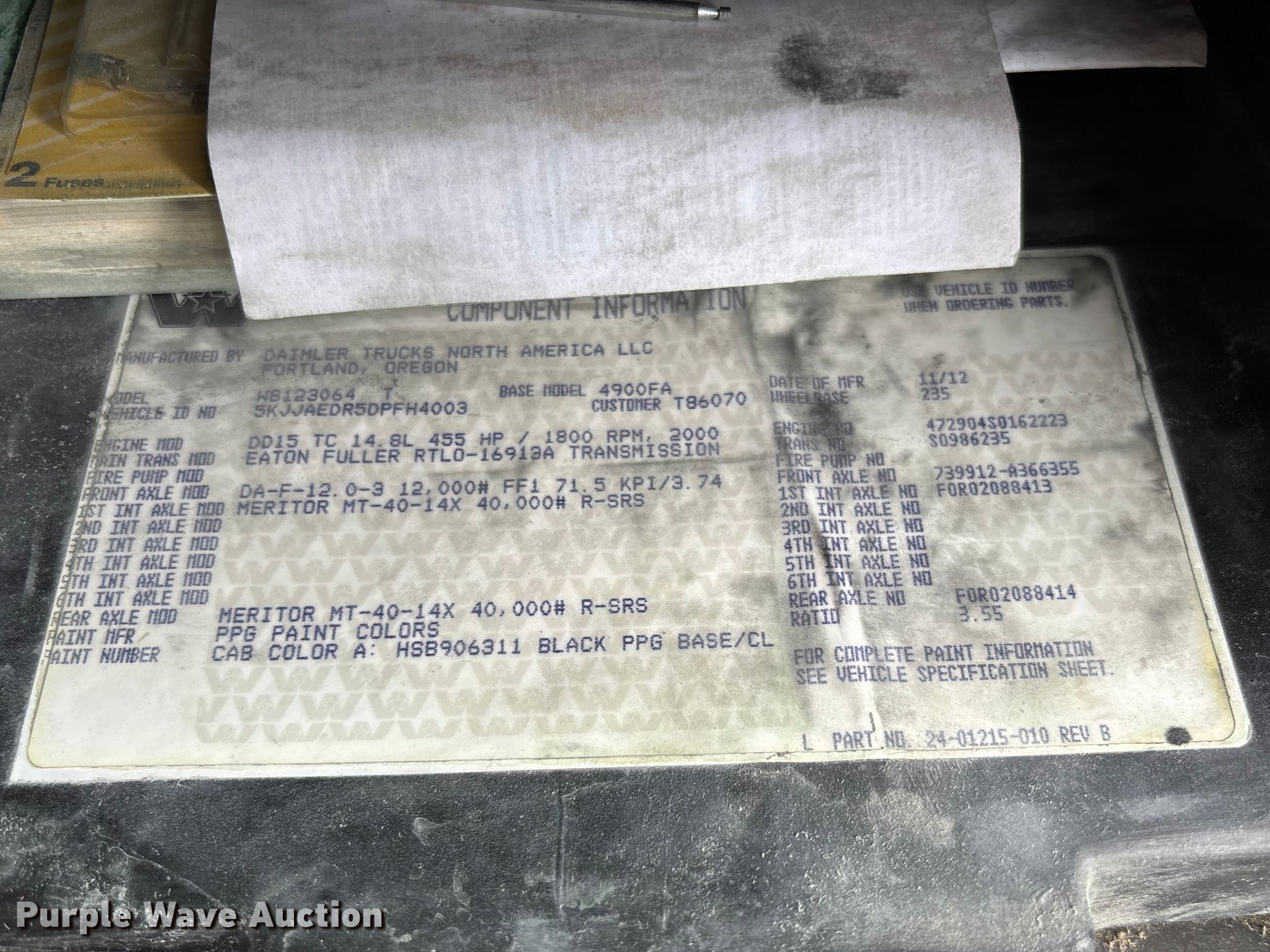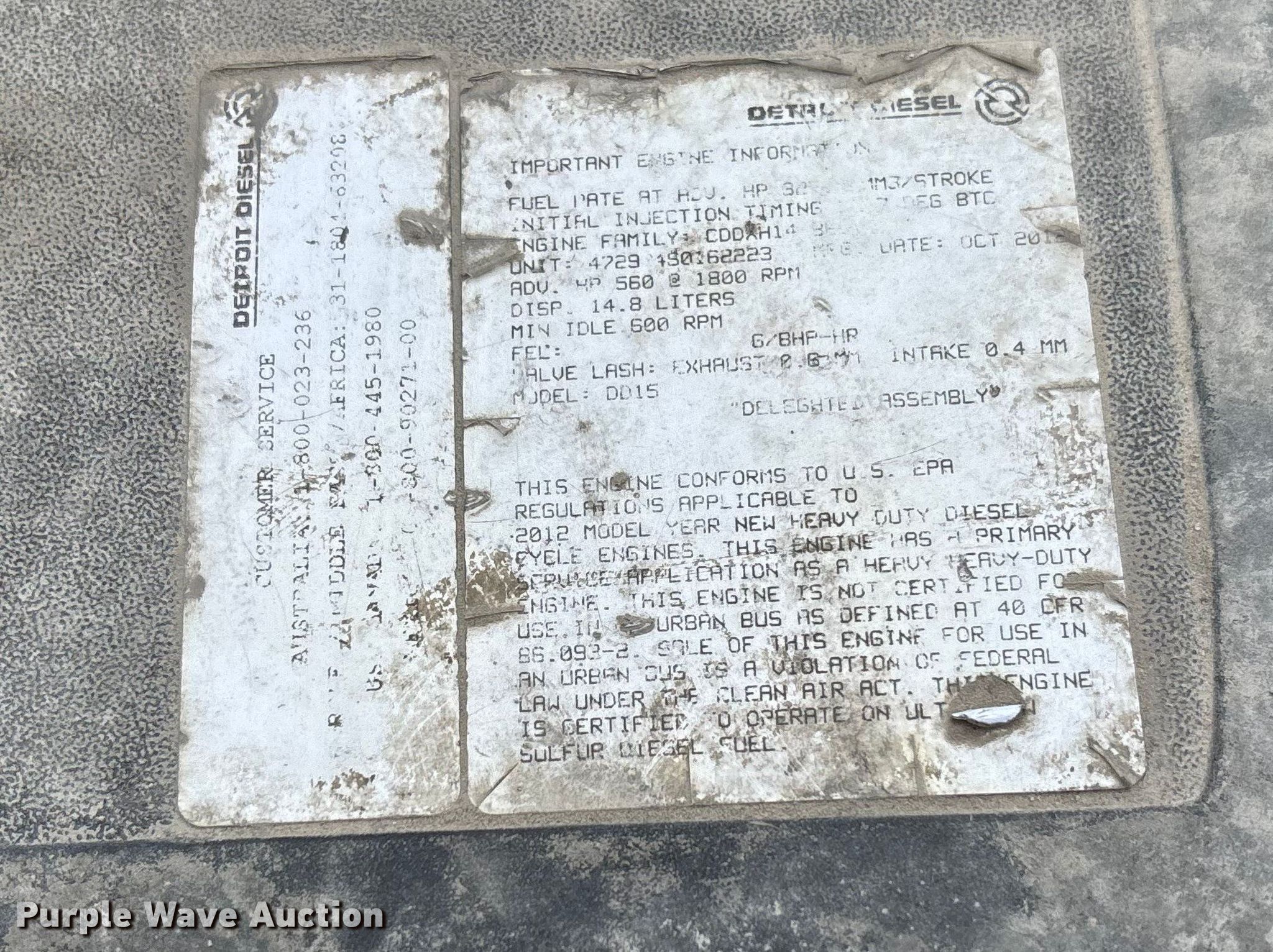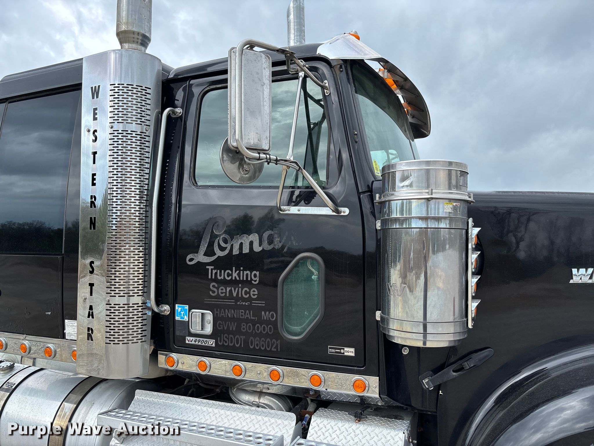 2013 Western Star 4900 semi truck. Miles: 25,439 on odometer, VIN: 5KJJAEDR5DPFH4003. Engine Detroit DD15, Displacement: 14.8L, Cylinders: 6, Fuel type: Diesel, HP: 455, Engine brake. Transmission Eaton Fuller RTLO-16913A, Manual, Speed: 13. Chassis Axles: Tandem, Gear ratio: 3.55, Differential lock: Inter-axle, Suspension: Air Dump valves, Brakes: Air, PTO, Wet kit, Truck chassis: 13' 2", GVWR: 52,000 lbs FAWR: 12,000 lbs, RAWR: 40,000 lbs, Wheelbase: 235". Interior AC, Heat, Heated mirrors, Power windows, Cruise control, Air ride cab, Brake controller, Sleeper Sleeper length: 48", Beds: Single, Rear climate control. Features Deck plate: Aluminum, Fifth wheel type: Air operated, Sliding, Fuel tank: Dual. Tires Size: 11R22.5. Notes Dash warning indicator: Check engine, Windshield chipped or cracked. Missouri title. Title distribution may be delayed up to 14 days from verification of funds. Lomax Trucking Service Inc.. Hannibal, MO 63401