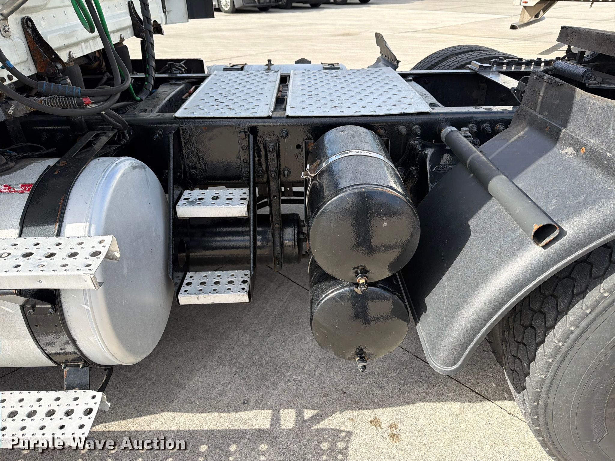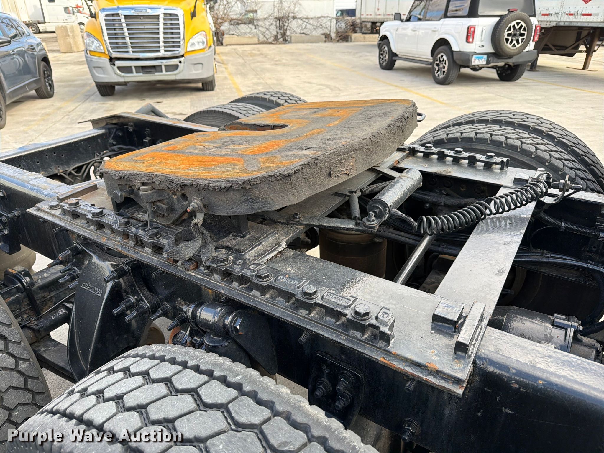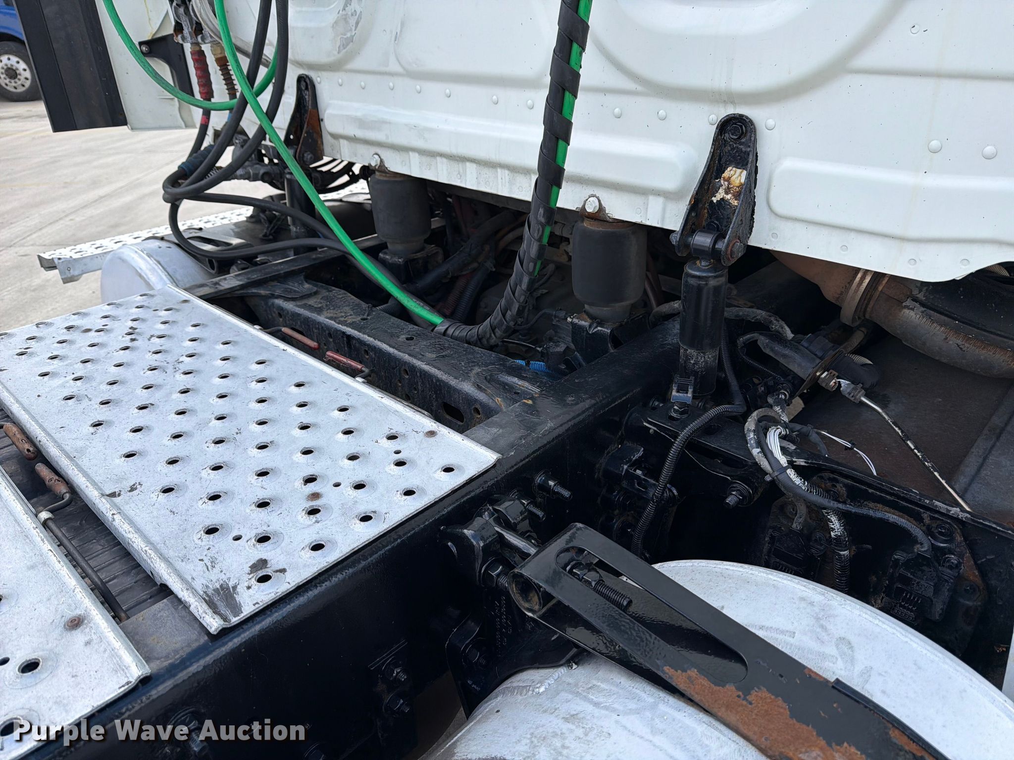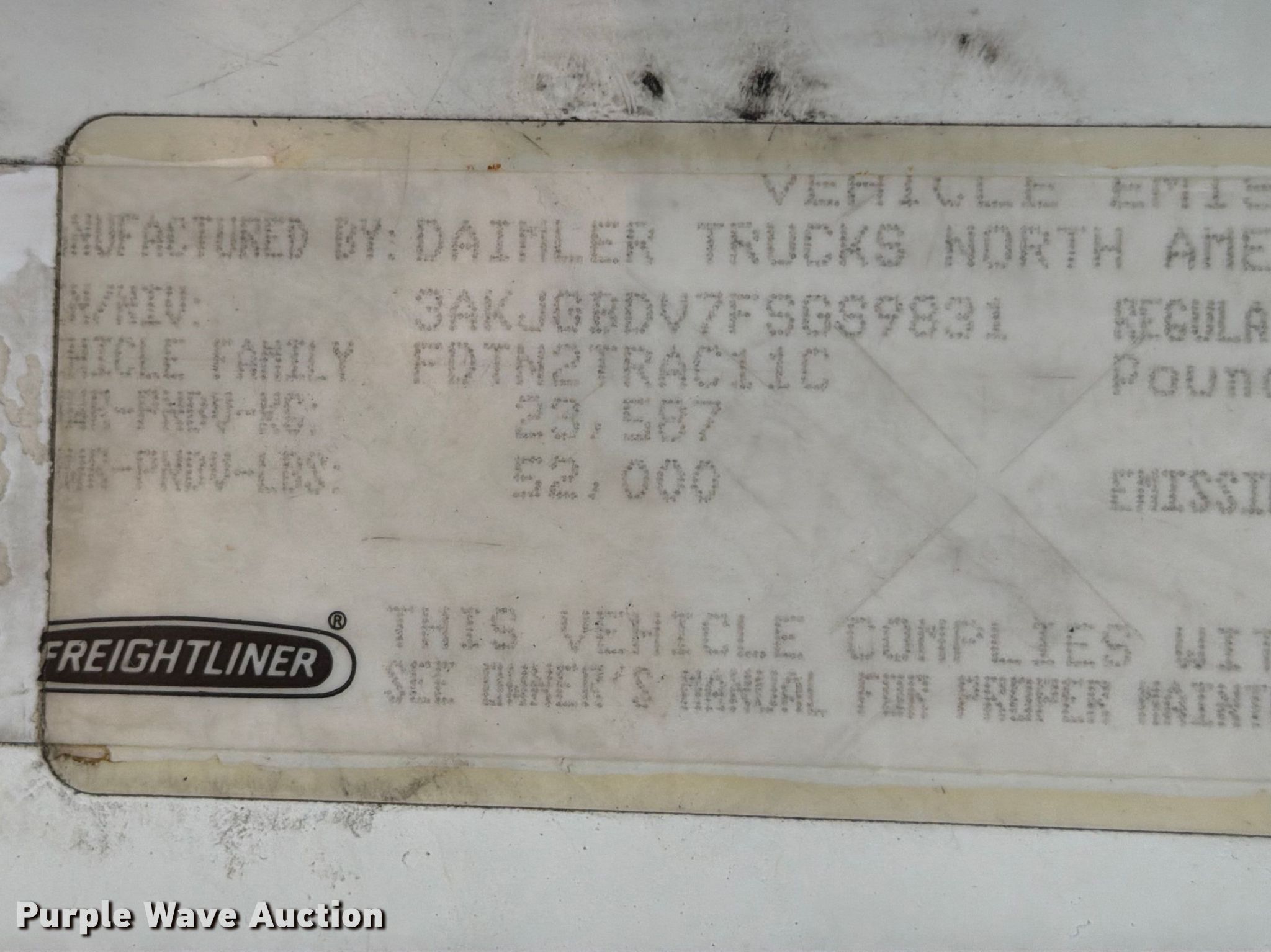 2015 Freightliner Cascadia semi truck. Miles: 658,841 on odometer, VIN: 3AKJGBDV7FSGS9831, Unit #: 68-047. Engine Detroit Diesel DD13, Displacement: 12.8L, Cylinders: 6, Fuel type: Diesel, HP: 450, Engine brake. Transmission Automated manual. Chassis Axles: Tandem, Gear ratio: 3.55, Differential lock: Inter-axle, Suspension: Air Dump valves, Brakes: Air, GVWR: 52,000 lbs FAWR: 12,000 lbs, IAWR: 20,000 lbs, RAWR: 20,000 lbs, Wheelbase: 166". Interior AC, Heat, Heated mirrors, Power windows, Power locks, Cruise control, Air ride cab. Features Deck plate: Aluminum, Fifth wheel type: Air operated, Sliding, Fuel tank: Dual. Tires Size: 11R22.5. Notes Dash warning indicator: Check engine, Windshield chipped or cracked. Illinois title. Title distribution may be delayed up to 30 days from verification of funds. CTI CHI Trucking Inc. Bedford Park, IL 60638