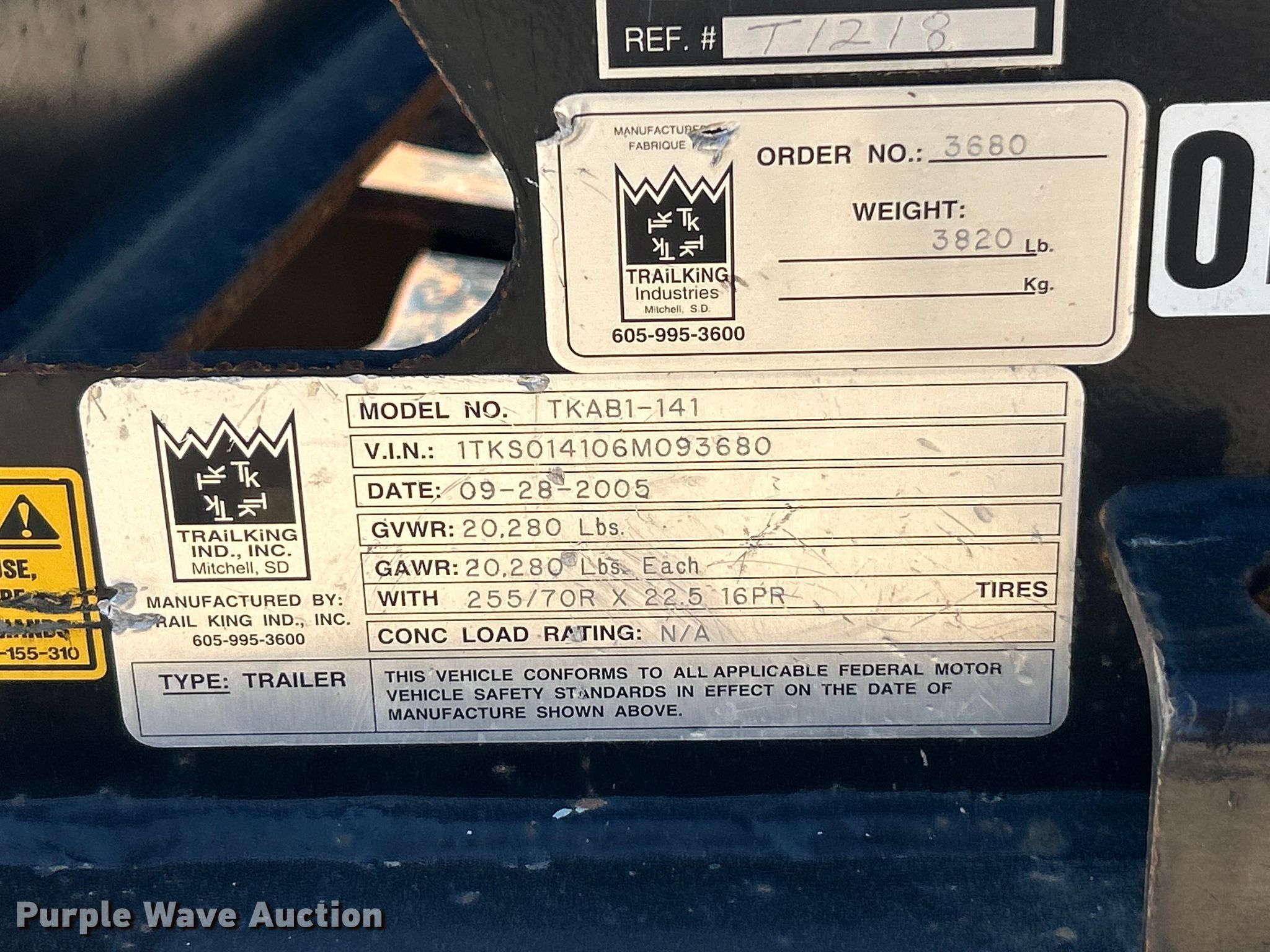 2006 Trail King TK110HDG-533 lowboy equipment trailer. VIN: 1TKJ053346M093249. Dimensions Overall Length: 53', Width: 102", Deck Length: 26', Rear deck length: 14'. Features Deck type: Wood, Outriggers: Swing-out Board size: 12", Neck type: Detachable. Chassis Suspension: Air, Brakes: Air, Axles: Triple, GVWR: 132,320 lbs, GAWR: 20,280 lbs. Tires Steel wheels, Size: 255/70R22.5. 2006 Trail King TKAB1-141 stinger axle VIN: 1TKS014106M093680. Dimensions Overall Length: 14', Width: 102". Chassis Suspension: Air, Brakes: Air, GVWR: 20,280 lbs, GAWR: 20,280 lbs. Tires Steel wheels, Size: 255/70R22.5. Trailer- Missouri Title. Stinger- Bill of Sale.. Title distribution may be delayed up to 14 days from verification of funds. Kuesel Excavating Company. O'Fallon, MO 63366