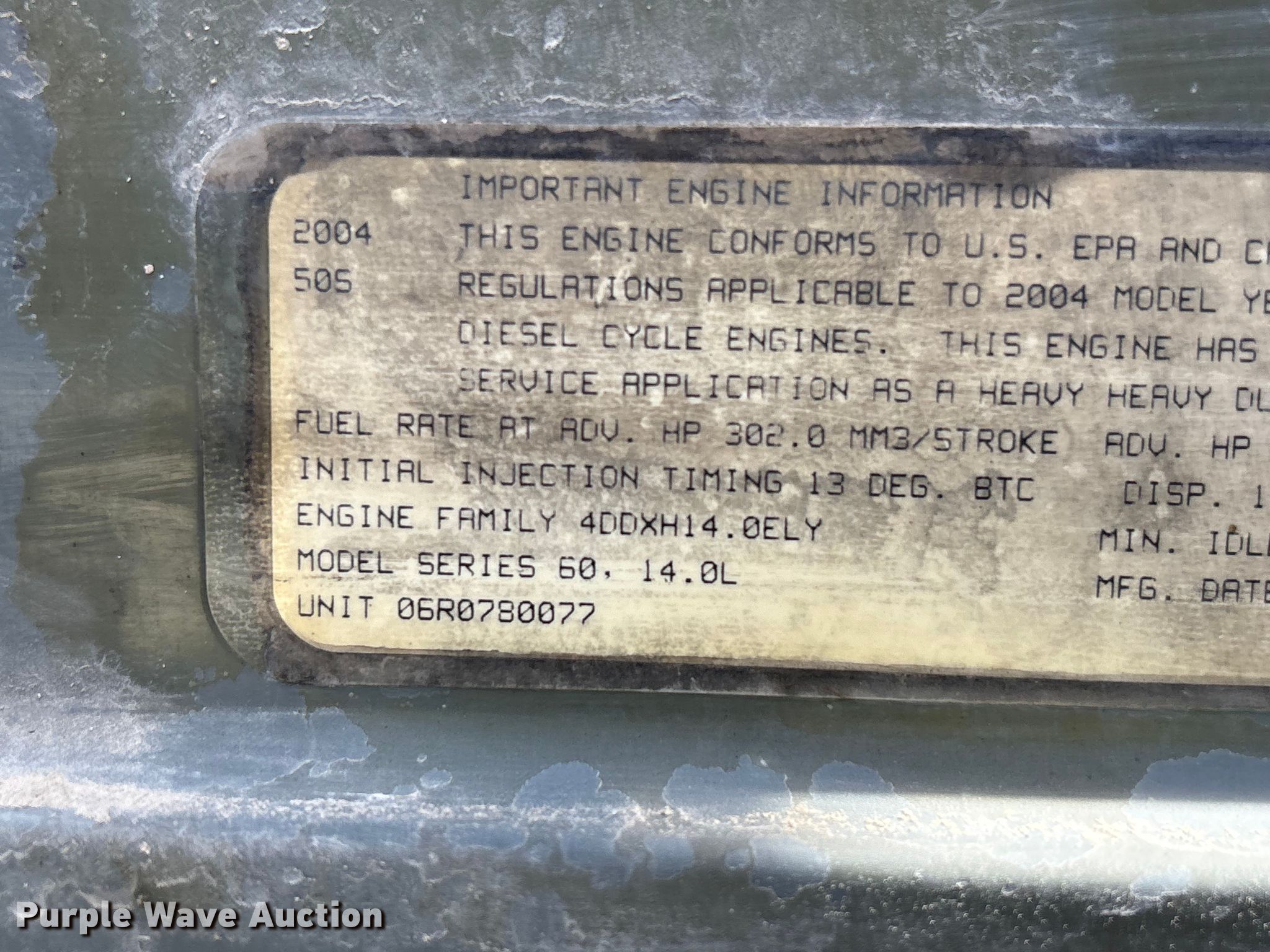 2005 Freightliner Columbia semi truck. Miles: 600,845 on odometer, VIN: 1FUJA6CK95LN65170. Engine Detroit Diesel Series 60, Serial: 06R0780077, Displacement: 14.0L, Cylinders: 6, Fuel type: Diesel, HP: 515. Transmission Automatic. Chassis Axles: Tandem, Suspension: Air, Brakes: Air. Interior AC, Heat, Heated mirrors, Cruise control, Air ride cab, Auxiliary controls. Features Deck plate: Aluminum, Fifth wheel type: Air operated, Sliding, Fuel tank: Dual. Tires Size: 295/75R22.5. Missouri title. Title distribution may be delayed up to 14 days from verification of funds. Fertilizer Service Co.. Fairfax, MO 64446
