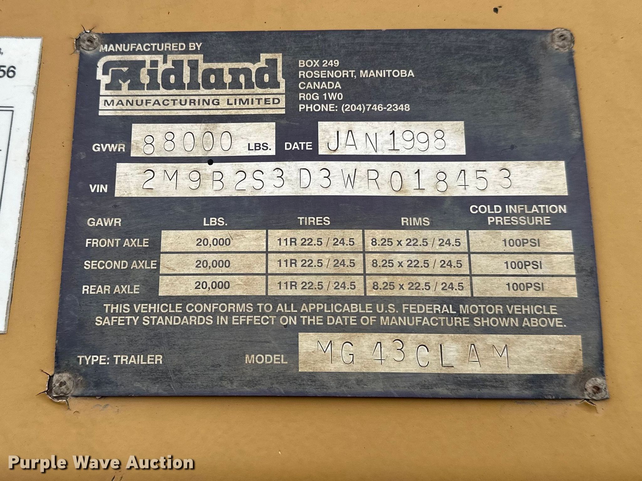 1998 Midland Mfg Ltd MG43Clam bottom dump trailer. VIN: 2M9B2S3D3WR018453. Dimensions Overall Length: 43', Width: 8' 6", Body Length: 16', Side height: 6' 6", Sideboard height: 5". Features Body type: Steel, Ram: Dual, Clamshell gate: Air operated, Rear push block. Chassis Landing gear: Dual, Suspension: Spring, Brakes: Air, Axles: Triple, GVWR: 88,000 lbs, GAWR: 20,000 lbs. Tires Steel wheels, Size: 295/75R22.5. Notes Truck not included. North Dakota title. Title distribution may be delayed up to 14 days from verification of funds. Witzel Construction. Langdon, ND 58249