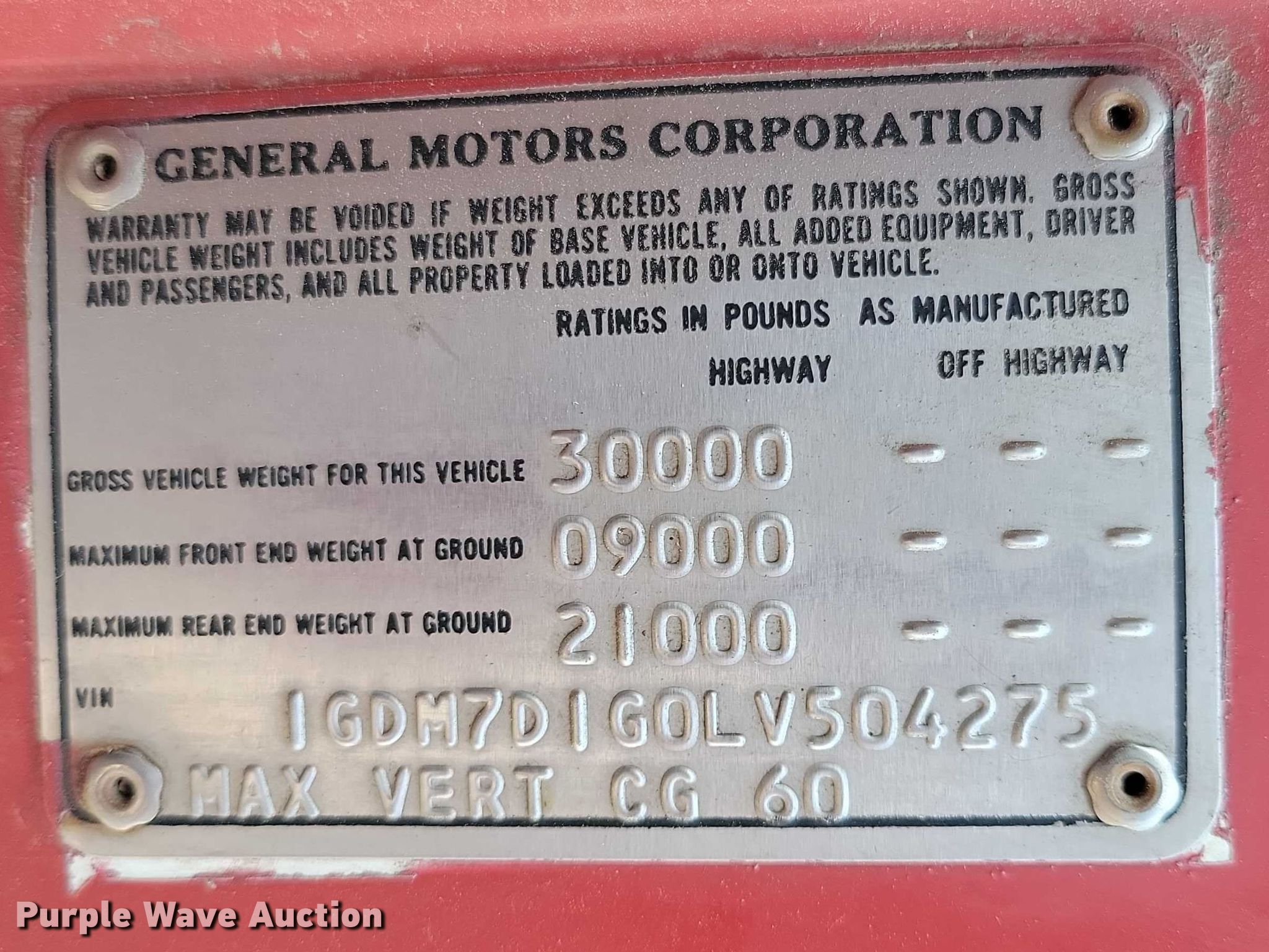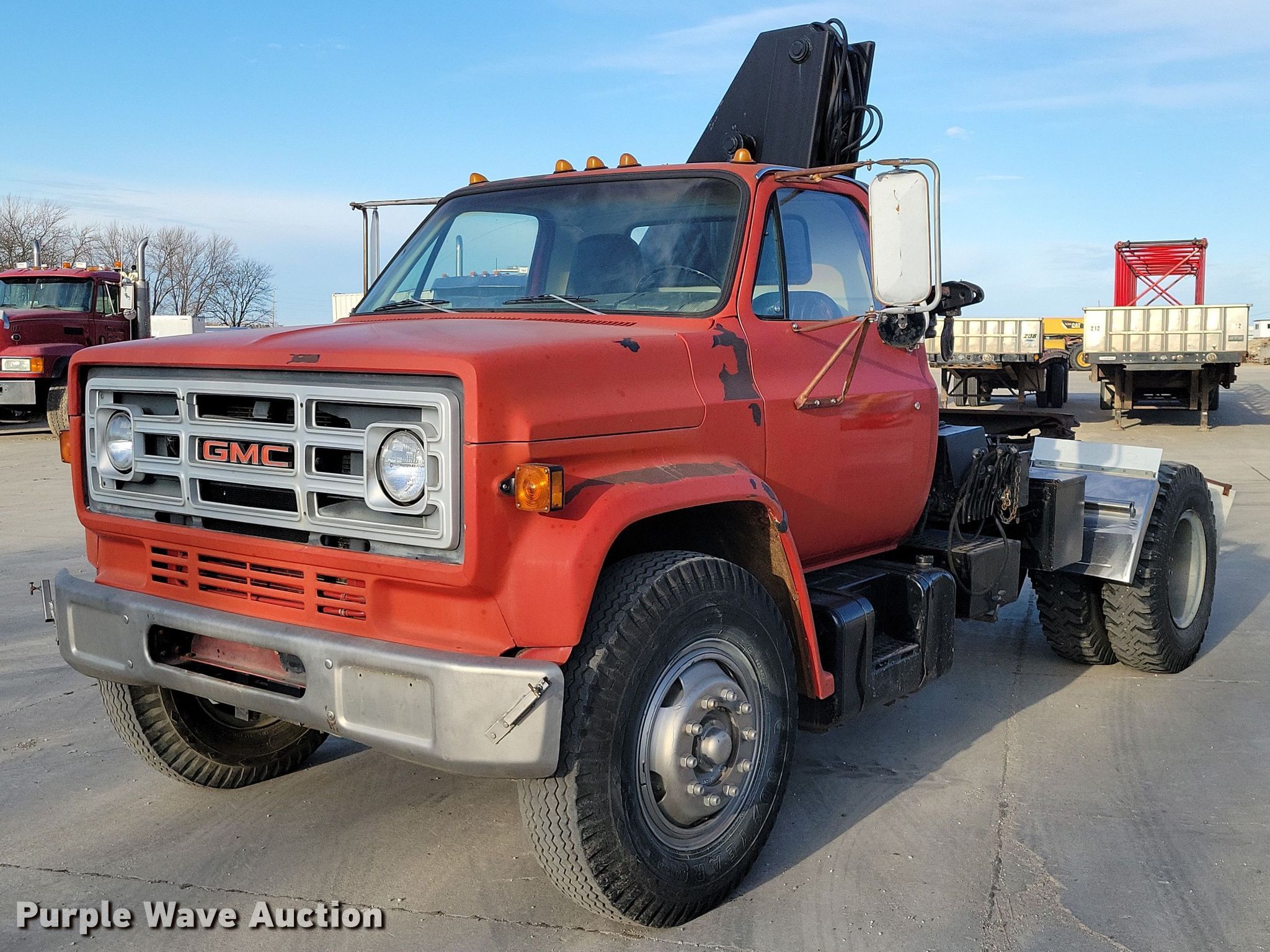 1990 GMC Sierra crane truck. Miles: 38,836 on odometer, VIN: 1GDM7D1G0LV504275. Engine Displacement: 8.2L, Cylinders: 8, Fuel type: Diesel. Transmission Automatic. Chassis Axles: Single, Suspension: Spring, Brakes: Air, PTO, GVWR: 30,000 lbs FAWR: 9,000 lbs, RAWR: 210,000 lbs. Interior Heat. Features Deck plate: Steel, Fifth wheel type: Sliding, Fuel tank: Dual. Tires Size: 10-20. Notes Unknown operating condition crane. Iowa title. Title distribution may be delayed up to 14 days from verification of funds. Godbersen Smith Construction Co.. Ida Grove, IA 51445