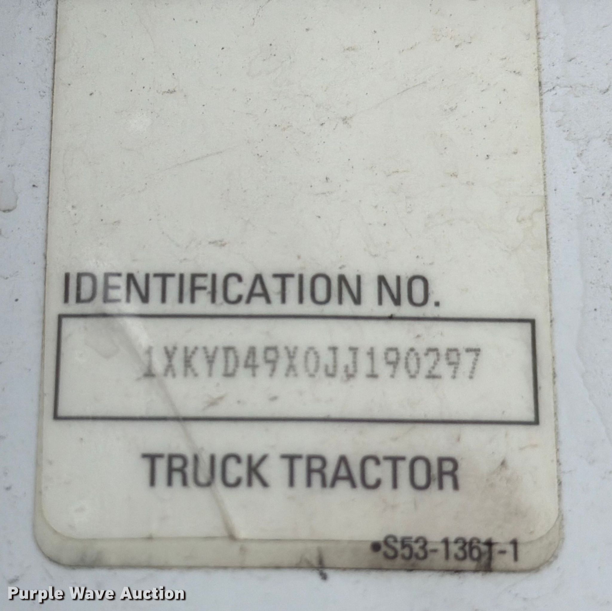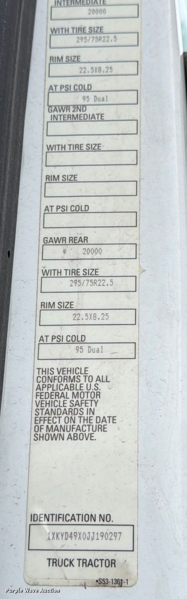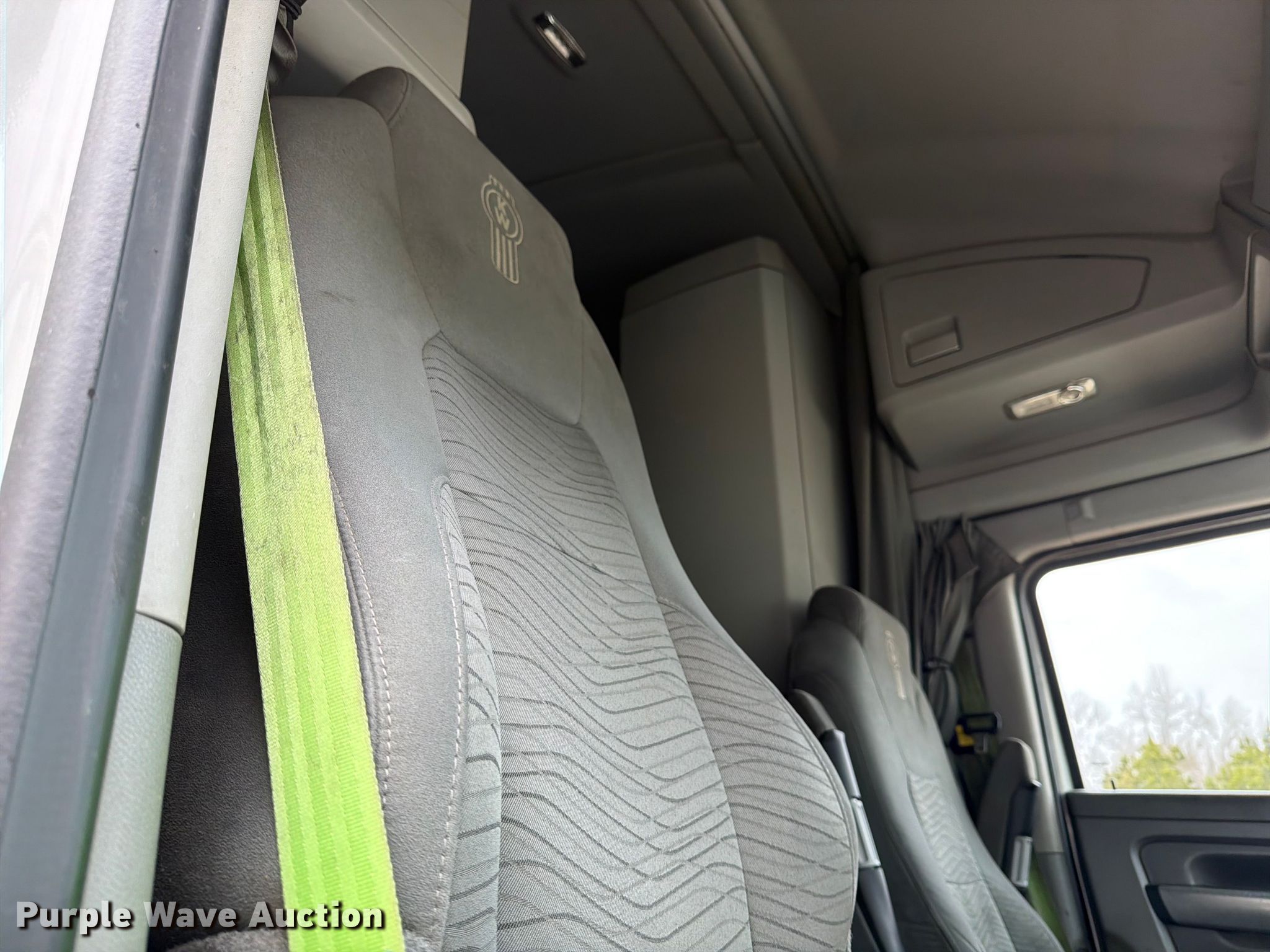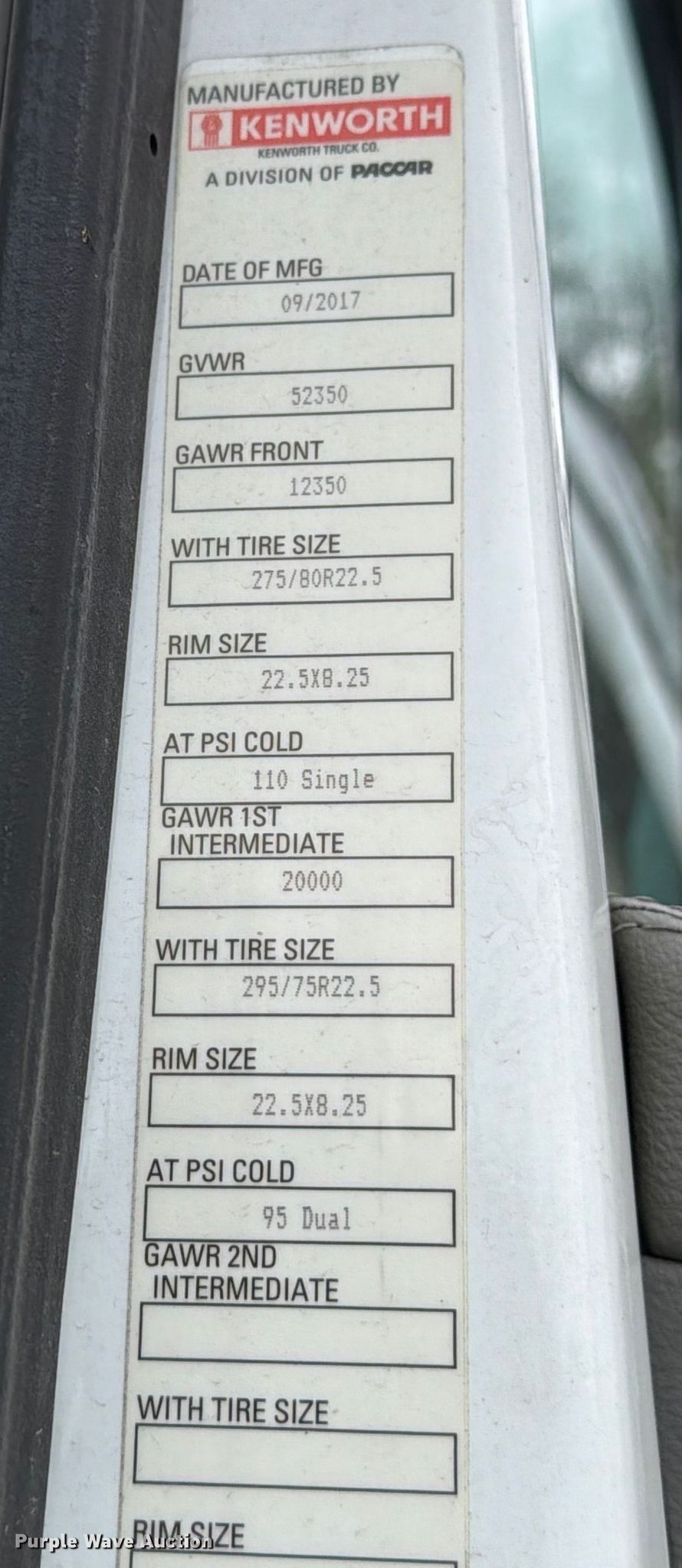 2018 Kenworth T680 semi truck. Miles: 732,610 on odometer, Hours: 28,815 on meter, VIN: 1XKYD49X0JJ190297, Unit #: 97110285. Engine Cummins X15 450SA, Displacement: 15.0L, Cylinders: 6, Fuel type: Diesel, HP: 450, Engine brake. Transmission Eaton Fuller, Automatic. Chassis Axles: Tandem, Gear ratio: 2.64, Differential lock: Inter-axle, Suspension: Air Dump valves, Brakes: Air, GVWR: 52,350 lbs FAWR: 12,350 lbs, IAWR: 20,000 lbs, RAWR: 20,000 lbs. Interior AC, Heat, Heated mirrors, Power windows, Power locks, Cruise control, Air ride cab, Sleeper Sleeper length: 64", Beds: Double bunk, Rear climate control. Features Deck plate: Aluminum, Fifth wheel type: Air operated, Sliding, Fuel tank: Dual. Tires Size: 295/75R22.5. Notes Dash warning indicator: Check engine, Windshield chipped or cracked. Repossessed item, stored at a secured facility. Please review REQUIRED REMOVAL INSTRUCTIONS. Titles will be distributed after confirmation of payment and removal. Indiana title. Title distribution may be delayed up to 30 days from verification of funds. Lender Owned. 6300 Chambers Road. Charles City, VA 23030