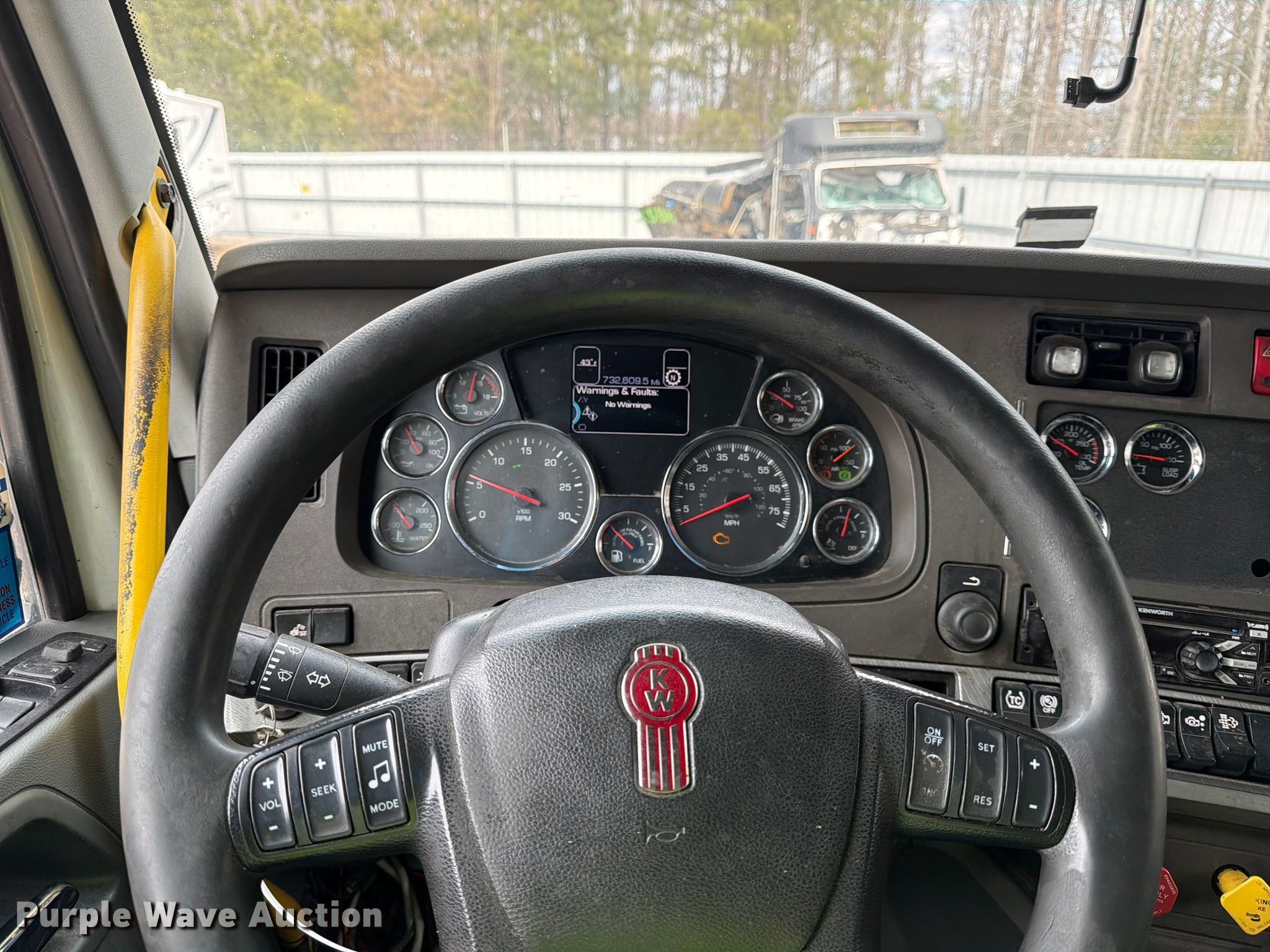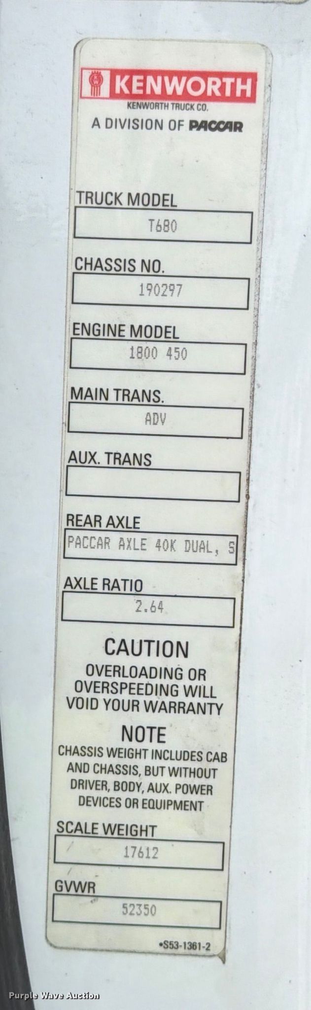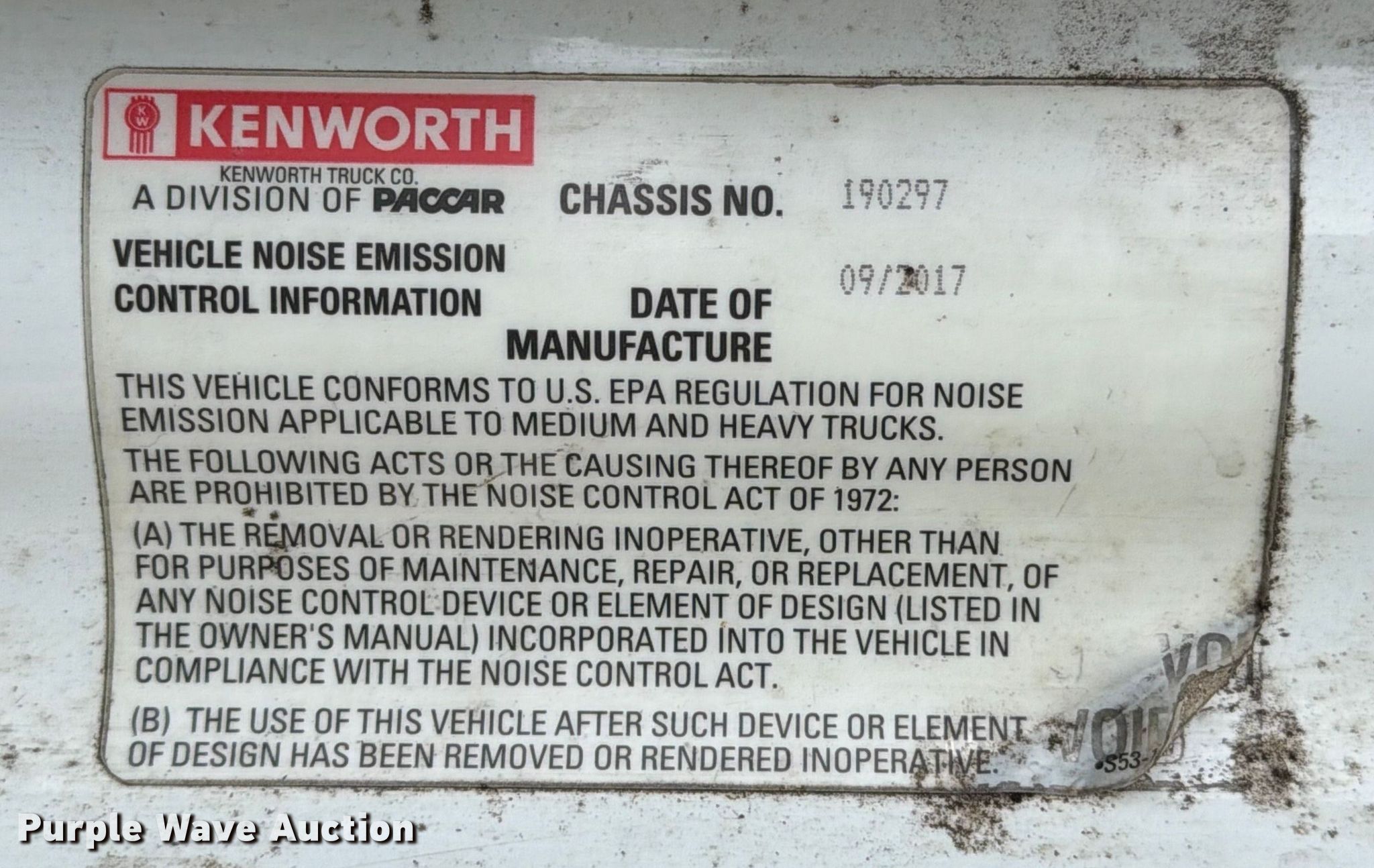 2018 Kenworth T680 semi truck. Miles: 732,610 on odometer, Hours: 28,815 on meter, VIN: 1XKYD49X0JJ190297, Unit #: 97110285. Engine Cummins X15 450SA, Displacement: 15.0L, Cylinders: 6, Fuel type: Diesel, HP: 450, Engine brake. Transmission Eaton Fuller, Automatic. Chassis Axles: Tandem, Gear ratio: 2.64, Differential lock: Inter-axle, Suspension: Air Dump valves, Brakes: Air, GVWR: 52,350 lbs FAWR: 12,350 lbs, IAWR: 20,000 lbs, RAWR: 20,000 lbs. Interior AC, Heat, Heated mirrors, Power windows, Power locks, Cruise control, Air ride cab, Sleeper Sleeper length: 64", Beds: Double bunk, Rear climate control. Features Deck plate: Aluminum, Fifth wheel type: Air operated, Sliding, Fuel tank: Dual. Tires Size: 295/75R22.5. Notes Dash warning indicator: Check engine, Windshield chipped or cracked. Repossessed item, stored at a secured facility. Please review REQUIRED REMOVAL INSTRUCTIONS. Titles will be distributed after confirmation of payment and removal. Indiana title. Title distribution may be delayed up to 30 days from verification of funds. Lender Owned. 6300 Chambers Road. Charles City, VA 23030