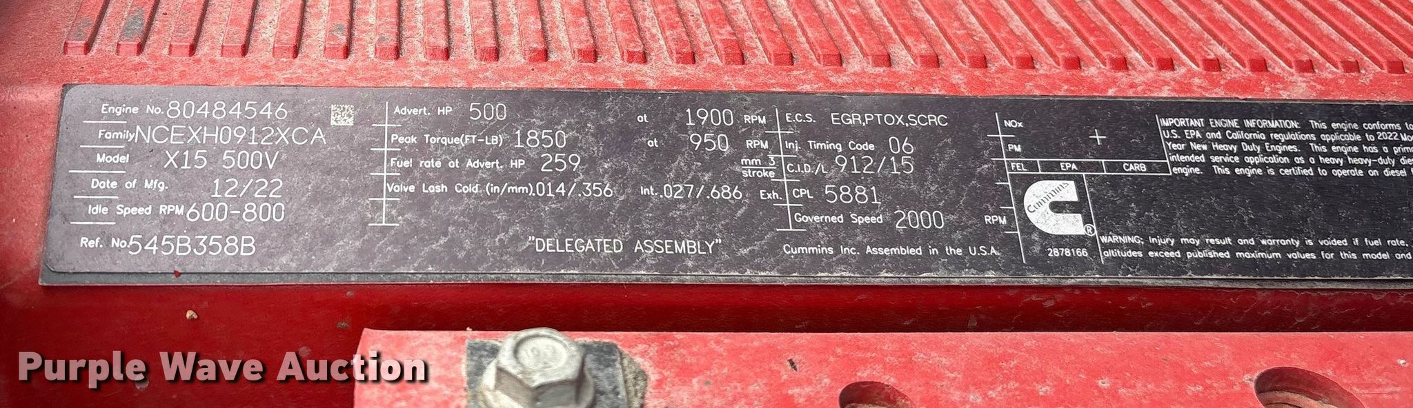 2023 International HX520 semi truck. Miles: 198,378 on odometer, VIN: 3HSPAAPRXPN410836, Unit #: 76618535. Engine Cummins X15 500V, Displacement: 15.0L, Cylinders: 6, Fuel type: Diesel, HP: 500, Engine brake. Transmission Automated manual. Chassis Axles: Tandem, Differential lock: Inter-axle, Suspension: Air Dump valves, Brakes: Air, Truck chassis: 155", GVWR: 52,350 lbs. Interior AC, Heat, Heated mirrors, Power windows, Power locks, Cruise control, Air ride cab, Sleeper Sleeper length: 51", Beds: Single, Refrigerator, Rear climate control. Features Deck plate: Aluminum, Fifth wheel type: Air operated, Sliding, Fuel tank: Dual. Tires Size: 295/75R22.5. Repossessed item, stored at a secured facility. Please review REQUIRED REMOVAL INSTRUCTIONS. Titles will be distributed after confirmation of payment and removal. Illinois title. Title distribution may be delayed up to 30 days from verification of funds. Lender Owned. 4019 North Carolina Highway 72. Lumberton, NC 28360