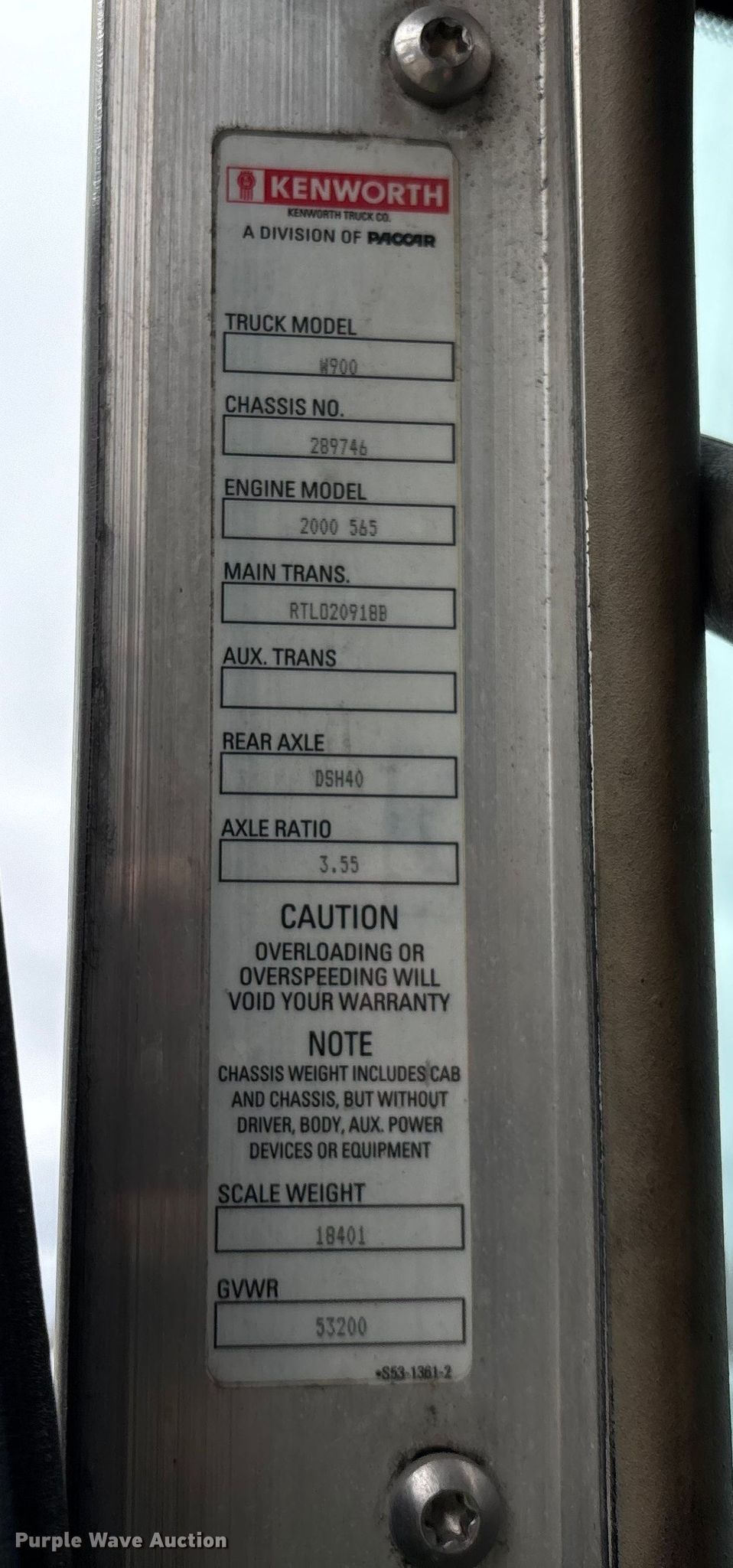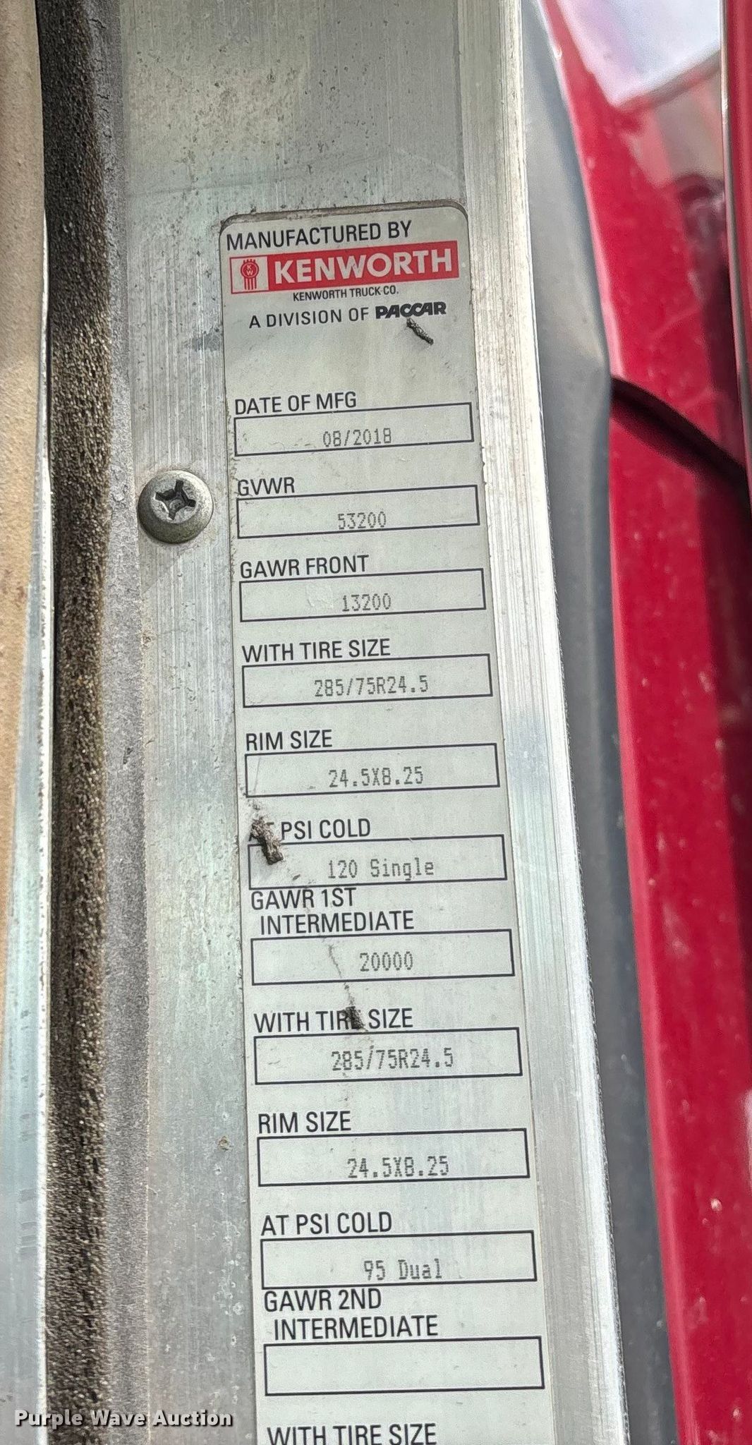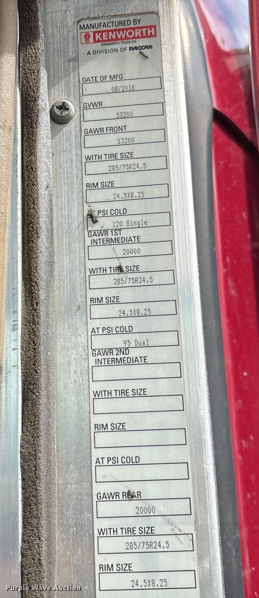 2019 Kenworth W900 semi truck. Miles: 711,743 on odometer, Hours: 26,397 on meter, VIN: 1XKWD49X4KJ289746, Unit #: 76630775. Engine Cummins X15 565, Displacement: 15.0L, Cylinders: 6, Fuel type: Diesel, HP: 565, Engine brake. Transmission Eaton Fuller, Manual, Speed: 18. Chassis Axles: Tandem, Differential lock: Full, Suspension: Air Dump valves, Brakes: Air, GVWR: 53,200 lbs. Interior AC, Heat, Heated mirrors, Power windows, Power locks, Cruise control, Air ride cab, Sleeper Sleeper length: 60", Beds: Double bunk, Refrigerator, Rear climate control. Features Fifth wheel type: Air operated, Sliding, Fuel tank: Dual. Tires Size: 285/75R24.5. Notes Possible electrical issues, Oil leak, Jump start required during on-site data collection. Repossessed item, stored at a secured facility. Please review REQUIRED REMOVAL INSTRUCTIONS. Titles will be distributed after confirmation of payment and removal. Illinois title. Title distribution may be delayed up to 30 days from verification of funds. Lender Owned. 5000 North State Road. Davison, MI 48423