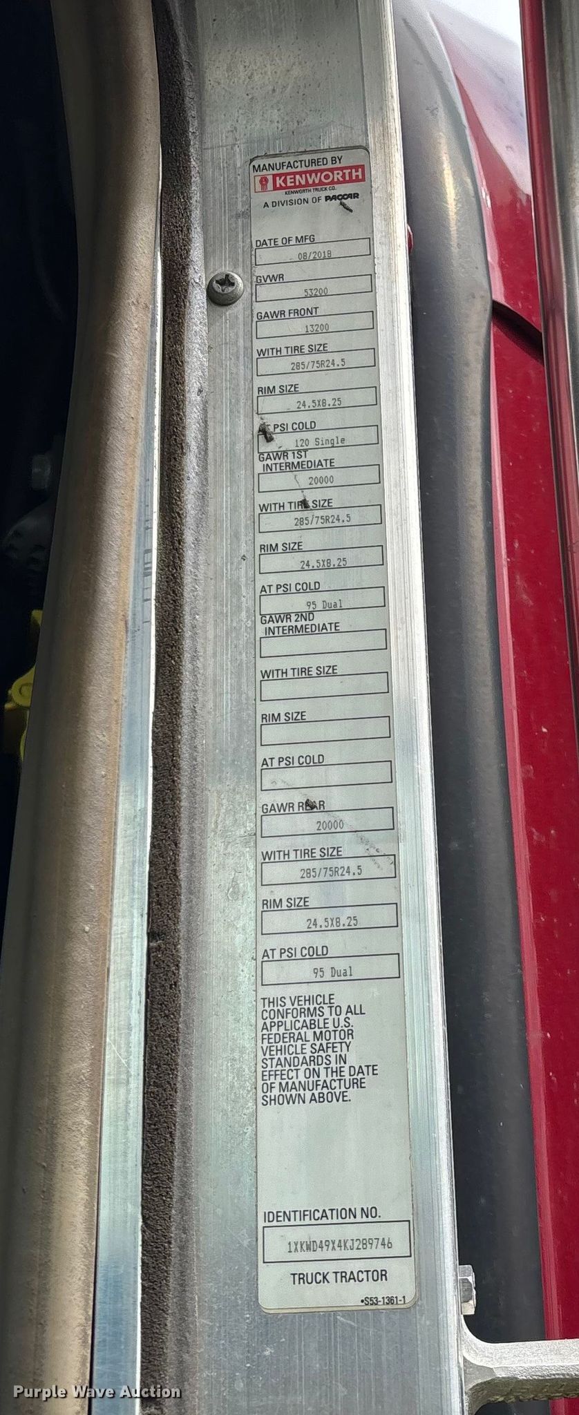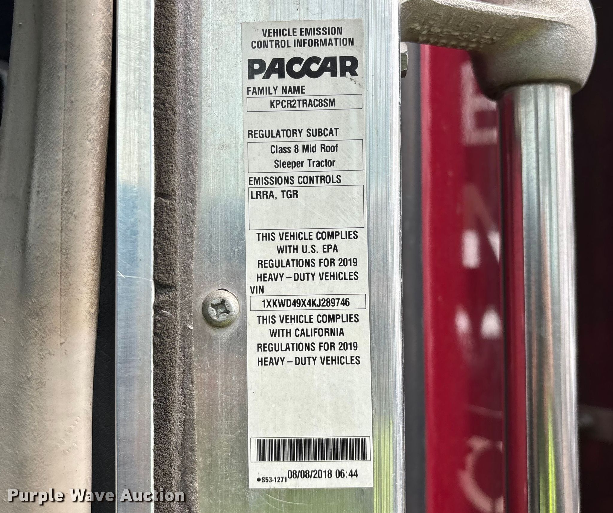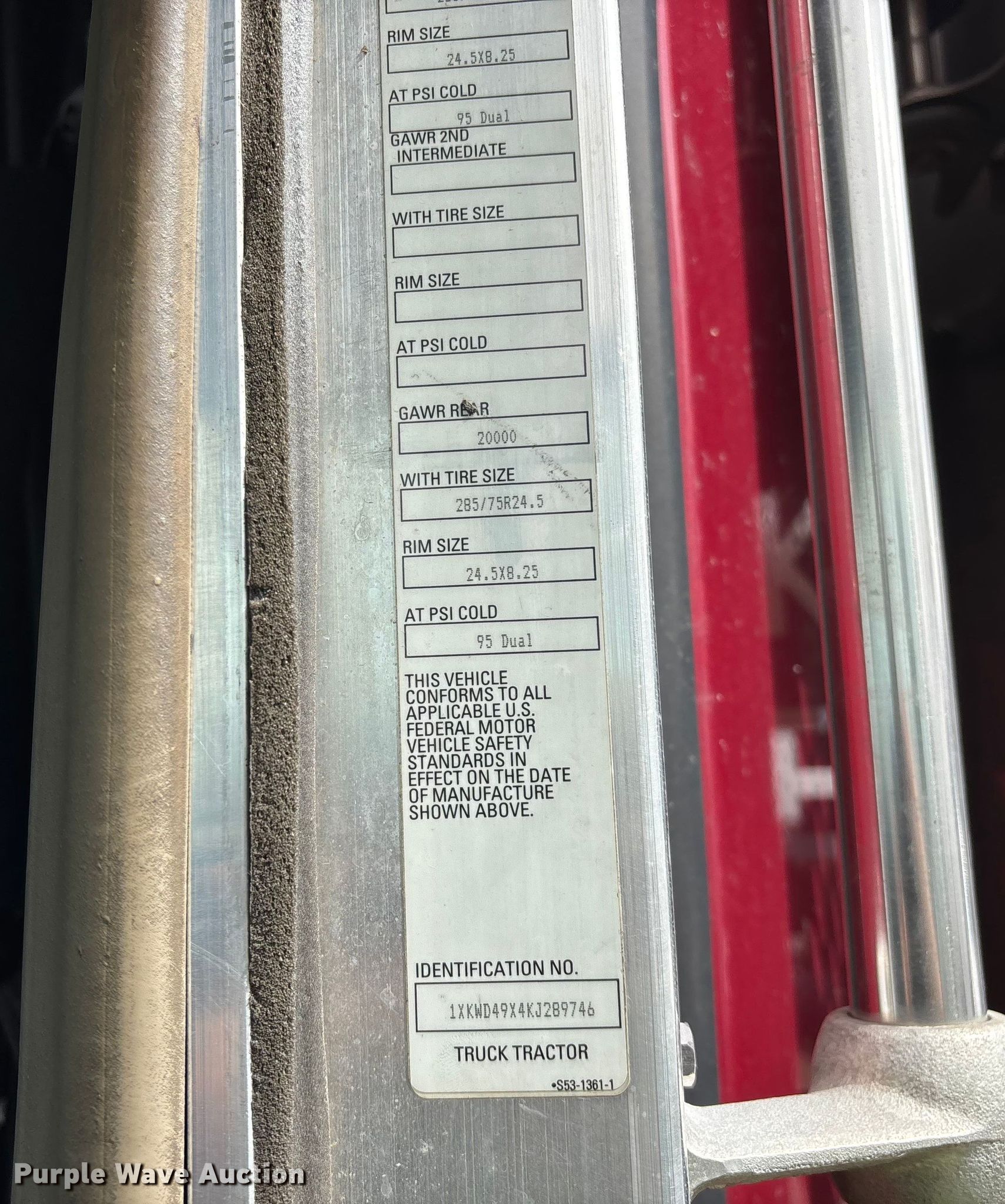 Purple Wave is selling a used Truck Tractor in Michigan. This item is a 2019 Kenworth W900 semi truck with the following: Miles: 711,743 on odometer, Hours: 26,397 on meter, VIN: 1XKWD49X4KJ289746, Unit #: 76630775