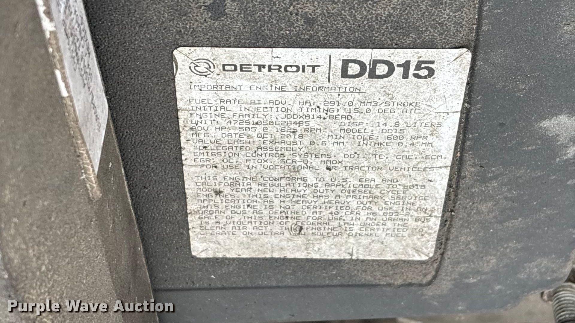 2019 Freightliner Cascadia semi truck. Miles: 1,021,945 on odometer, Hours: 28,642 on meter, VIN: 1FUJHHDR0KLKK9941, Unit #: 76925525. Engine Detroit Diesel DD15, Displacement: 14.8L, Cylinders: 6, Fuel type: Diesel, HP: 400, Engine brake. Transmission Automated manual. Chassis Axles: Tandem, Differential lock: Inter-axle, Suspension: Air Dump valves, Brakes: Air, GVWR: 52,000 lbs FAWR: 12,000 lbs, IAWR: 20,000 lbs, RAWR: 20,000 lbs, Wheelbase: 231". Interior AC, Heat, Heated mirrors, Power windows, Power locks, Cruise control, Air ride cab, Sleeper Sleeper length: 60", Beds: Double bunk, Refrigerator, Rear climate control. Features Deck plate: Aluminum, Fifth wheel type: Air operated, Fuel tank: Dual. Tires Size: 295/75R22.5. Notes Dash warning indicator: Check engine, Windshield chipped or cracked, Drive line disconnected, Possible engine issues, turns over but will not start , Unknown operating condition , Unit must be towed or hauled. Repossessed item, stored at a secured facility. Please review REQUIRED REMOVAL INSTRUCTIONS. Titles will be distributed after confirmation of payment and removal. Indiana title. Title distribution may be delayed up to 30 days from verification of funds. Lender Owned. 2408 West 21st Street South. Tulsa, OK 74107