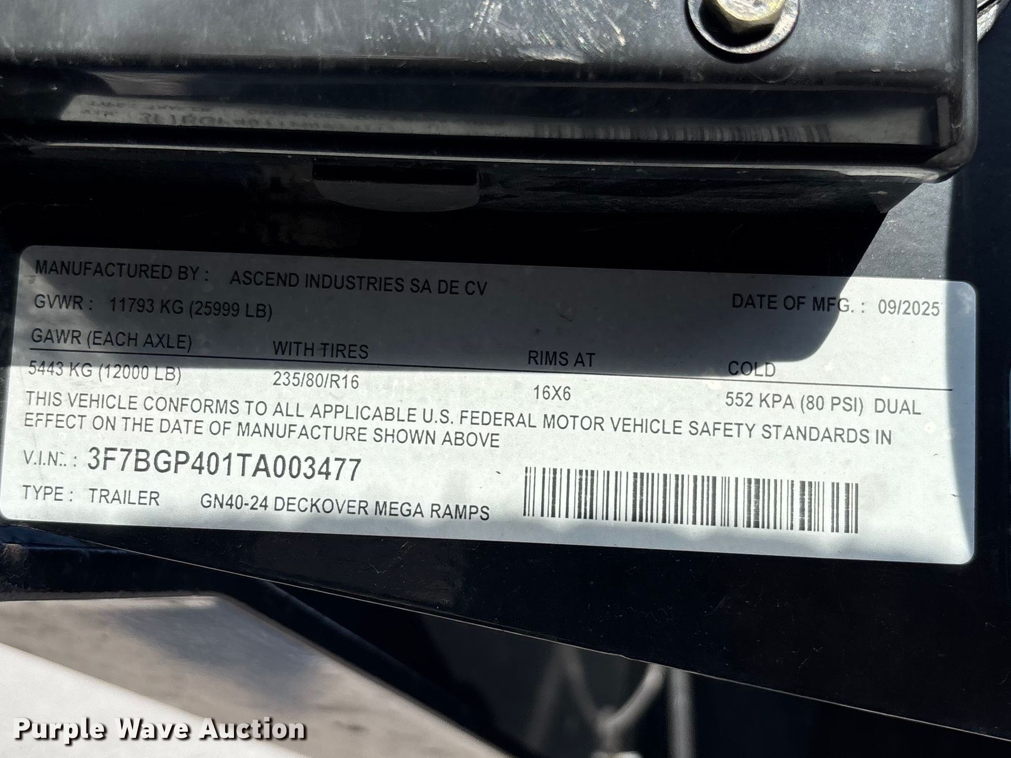 2026 Ascend GN40-24 equipment trailer. VIN: 3F7BGP401TA003477, Unit #: 78449885. Dimensions Overall Length: 50', Width: 102", Deck Length: 34' 6", Width: 102", Tail length: 6', Ramps: Manual Length: 6'. Features Deck type: Wood. Chassis Hitch: Gooseneck, Landing gear: Dual, Suspension: Spring, Brakes: Electric, Axles: Tandem, GVWR: 25,999 lbs, GAWR: 12,000 lbs. Tires Steel wheels, Size: 235/85R16. Repossessed item, stored at a secured facility. Please review REQUIRED REMOVAL INSTRUCTIONS. Titles will be distributed after confirmation of payment and removal. Virginia title. Title distribution may be delayed up to 30 days from verification of funds. Lender Owned. 3925 Luds Lane. McFarland, WI 53558