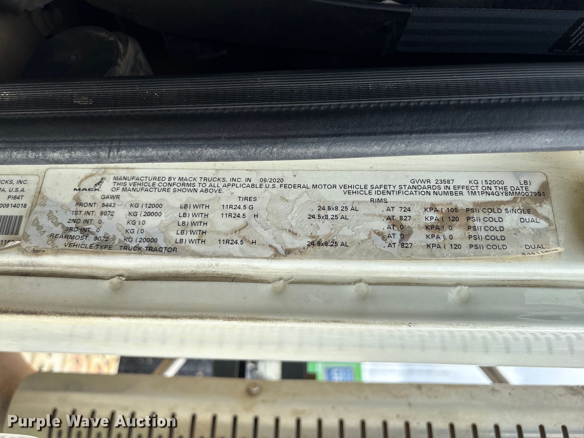 Purple Wave is selling a used Truck Tractor in Louisiana. This item is a 2021 Mack Pinnacle semi truck with the following: Miles: 405,825 on odometer, Hours: 15,041 on meter, VIN: 1M1PN4GY8MM007991, Unit #: 42081626