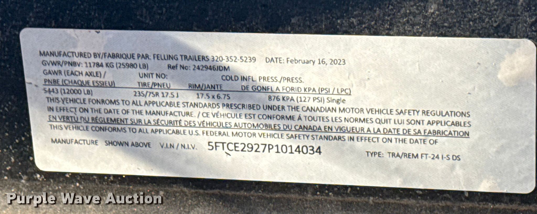 2023 Felling Trailers FT24I. VIN: 5FTCE2927P1014034. Dimensions Overall Length: 28', Width: 102", Deck Length: 19', Width: 81", Tail length: 4', Ramps: Manual Length: 71". Features Deck type: Wood. Chassis Hitch: Pintle, Landing gear: Single, Suspension: Spring, Brakes: Electric, Axles: Tandem, GVWR: 25,980 lbs, GAWR: 12,000 lbs. Tires Steel wheels, Size: 235/75R27.5. Oklahoma title. Seller is an Oklahoma licensed motor vehicle dealer. Buyers may be required to provide identification to the licensed dealer to comply with state laws. Title will be assigned and distributed by the dealer. Please contact the seller for distribution questions. Title distribution may be delayed up to 30 days from verification of funds. Collinsville, OK 74021