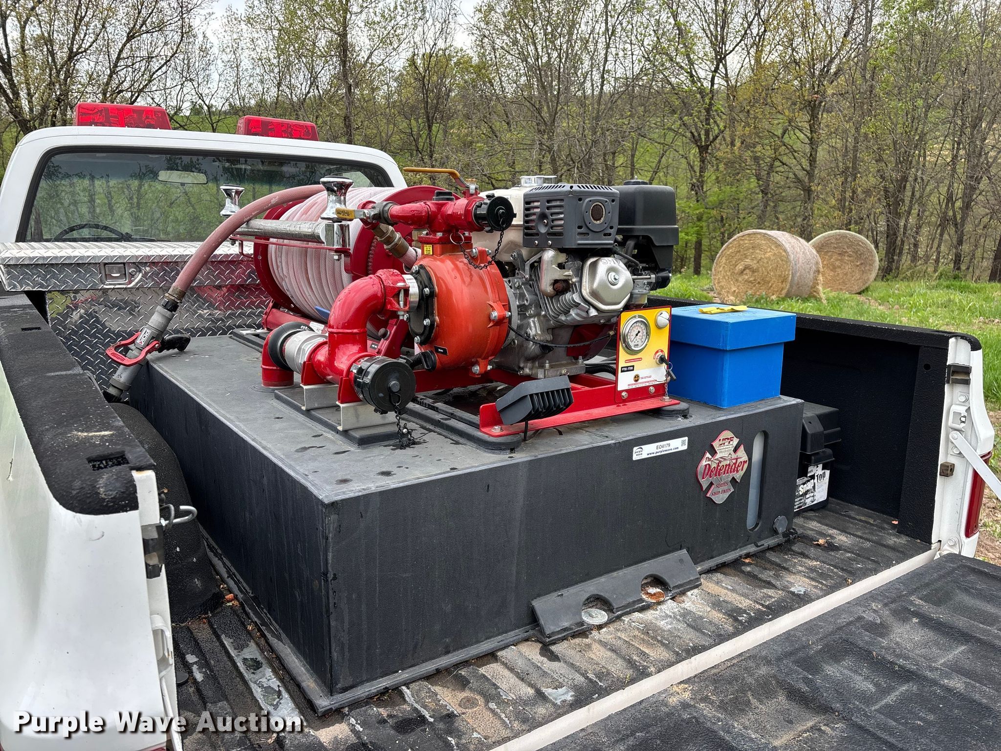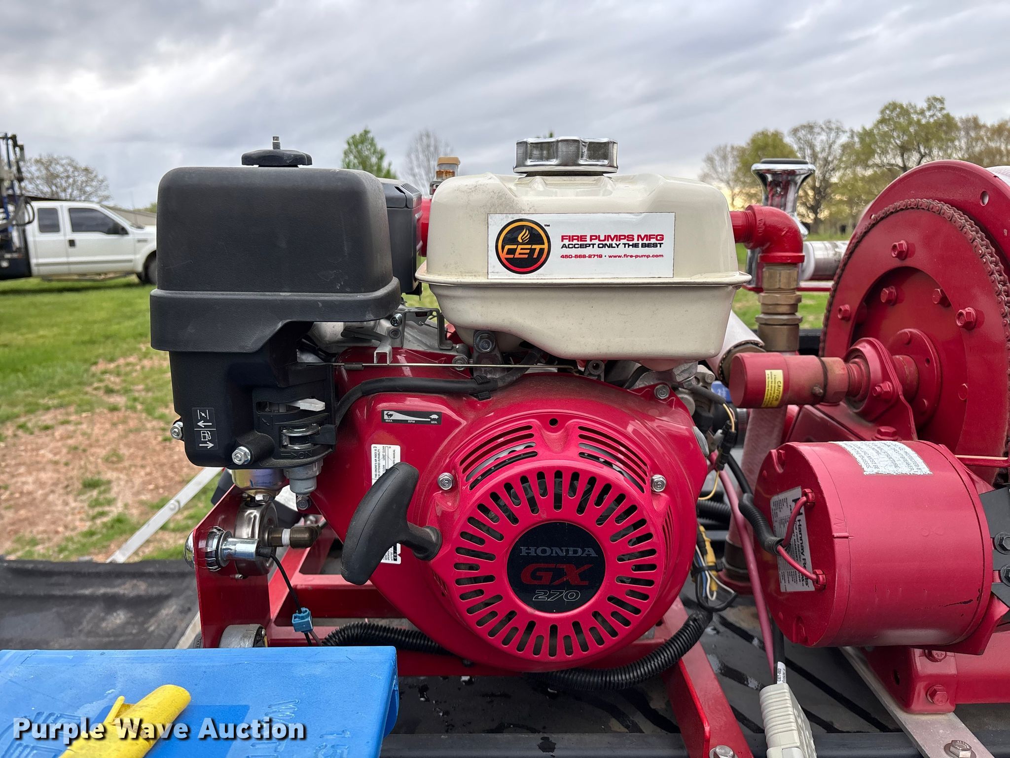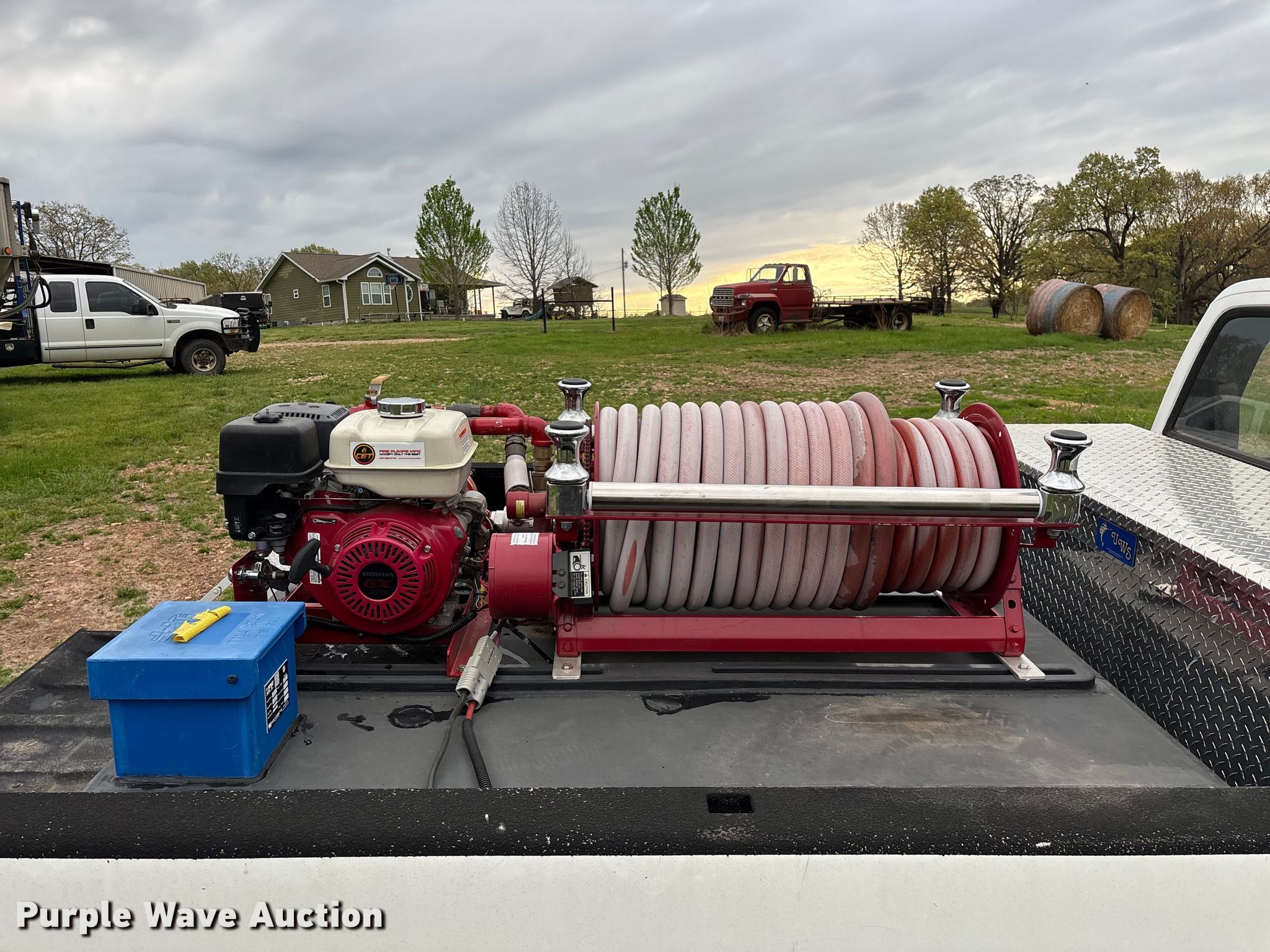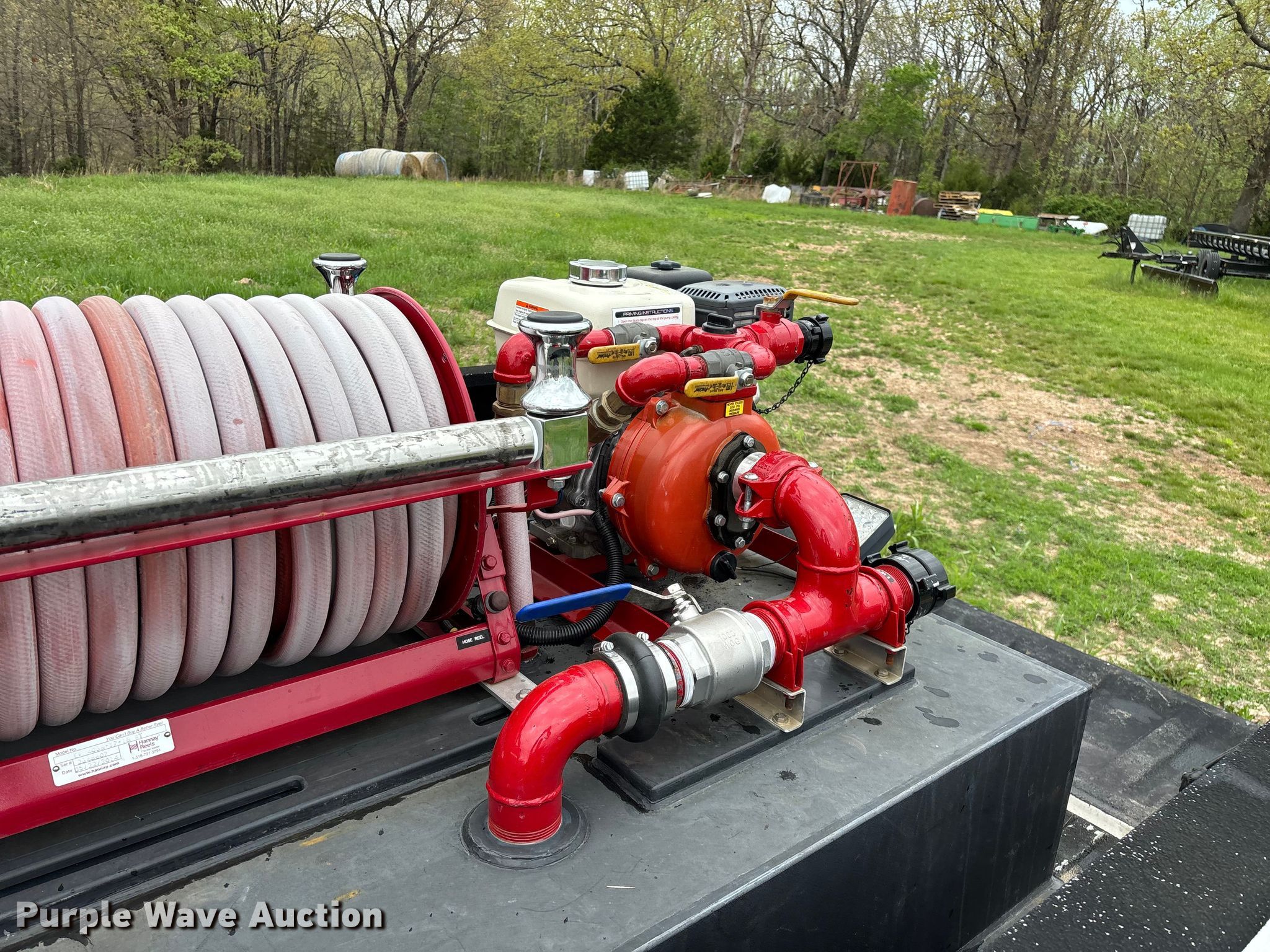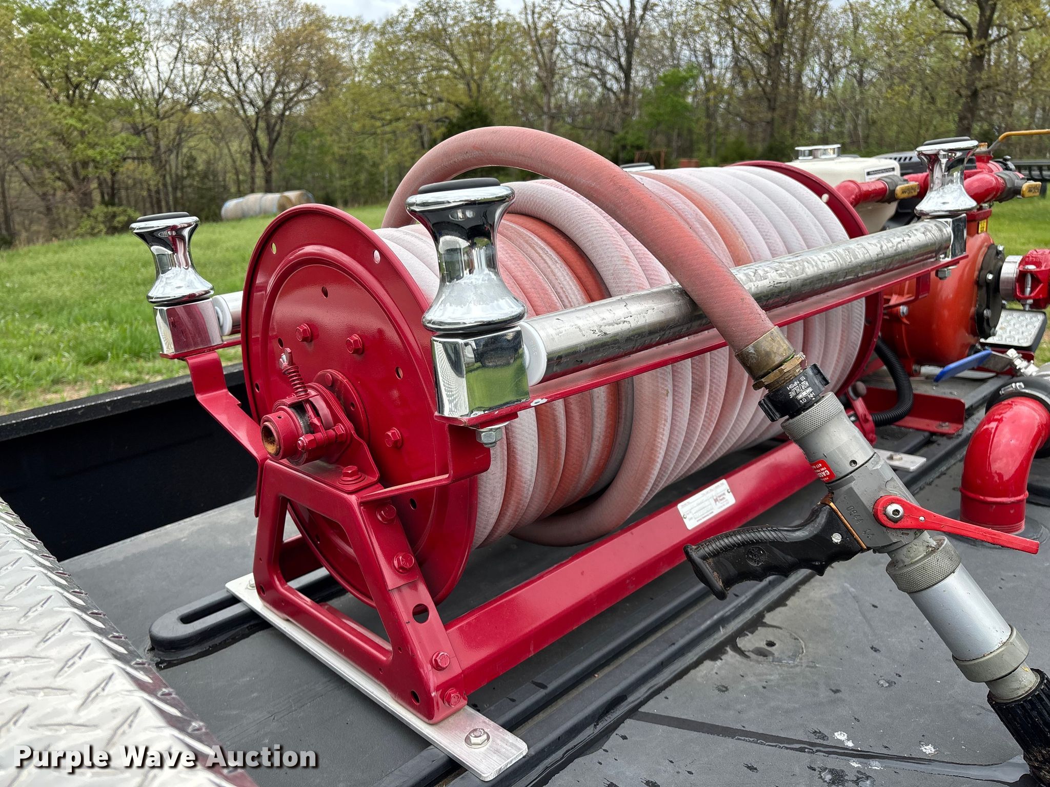 Purple Wave is selling a used Truck Part and Attach. in Missouri. This item is a 2014 CET Fire Pumps Mfg brush fire skid unit with the following: United Plastics Fabricating The Defender tank, Capacity: 150 gallon, Honda GX270 pump motor, Displacement: 270 cc, Cylinders: Single, Fuel type: Gas, Hannay Reels hose reel, Overall dimensions: 6' x 4' x 33", Will be removed from pickup truck prior to sale, Pickup truck not included